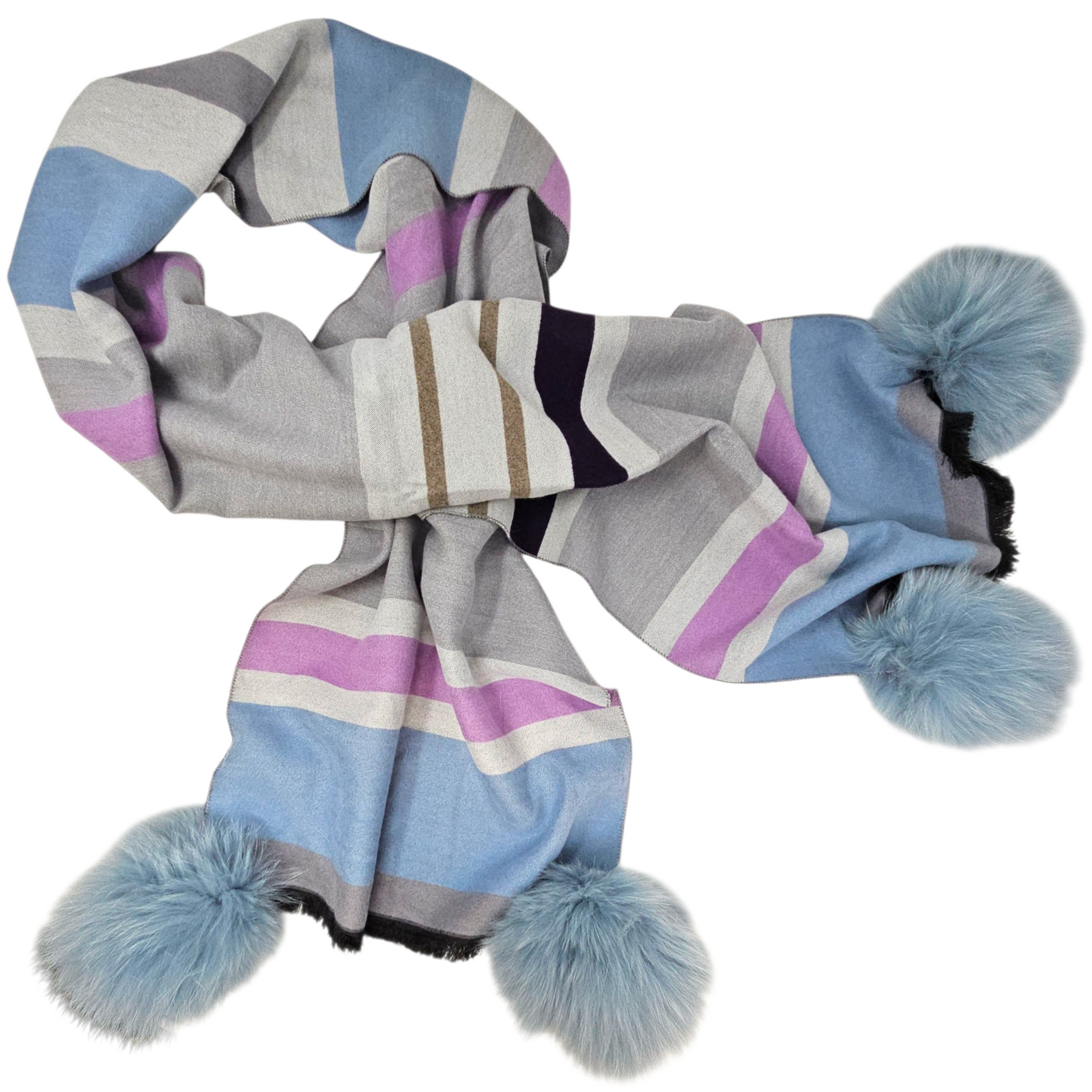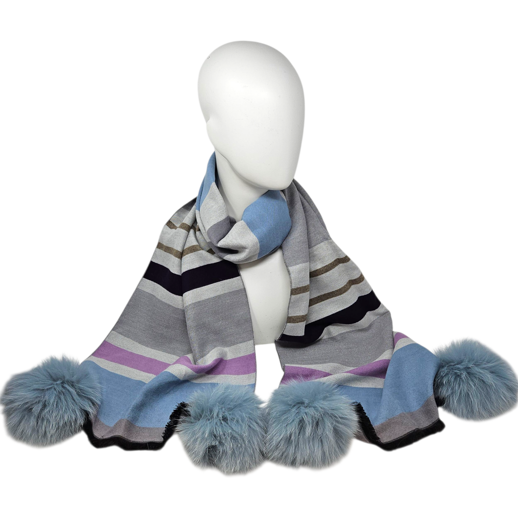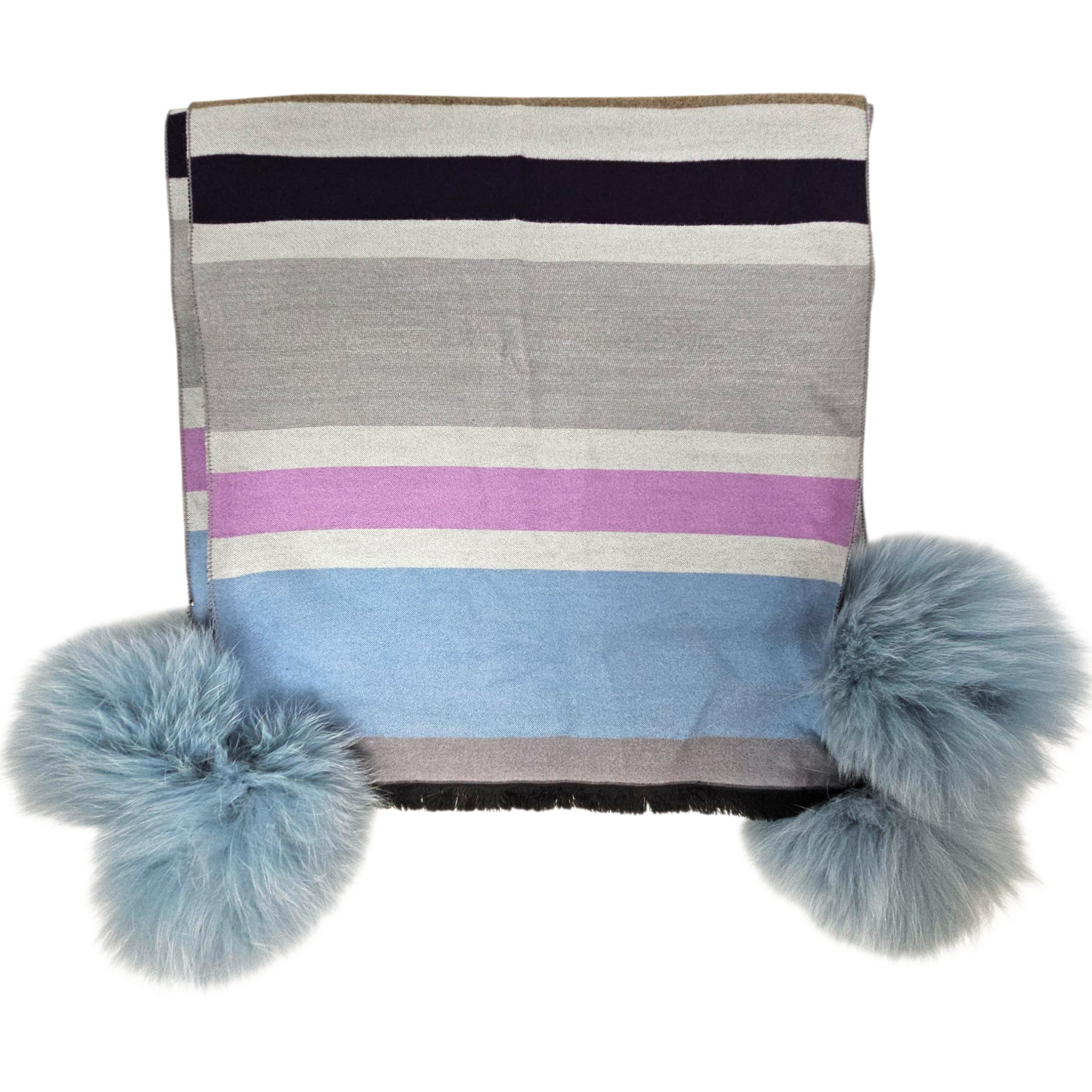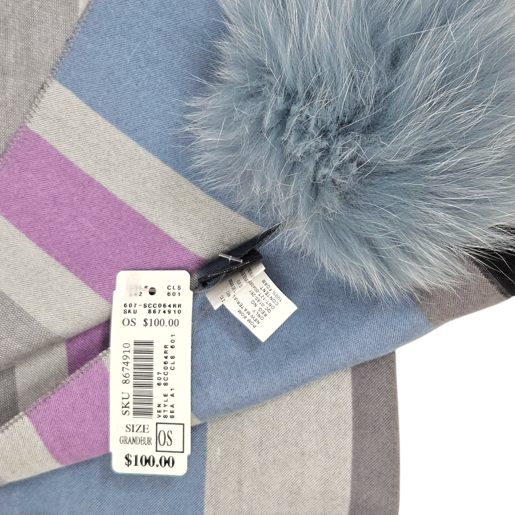 Materials: Blue, grey, & purple 100% viscose, with dyed fox fur poms.