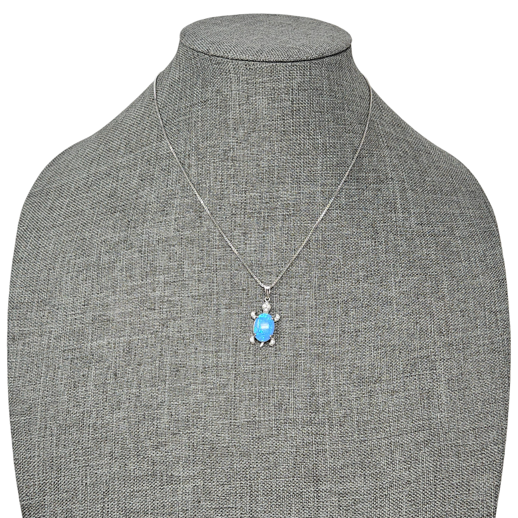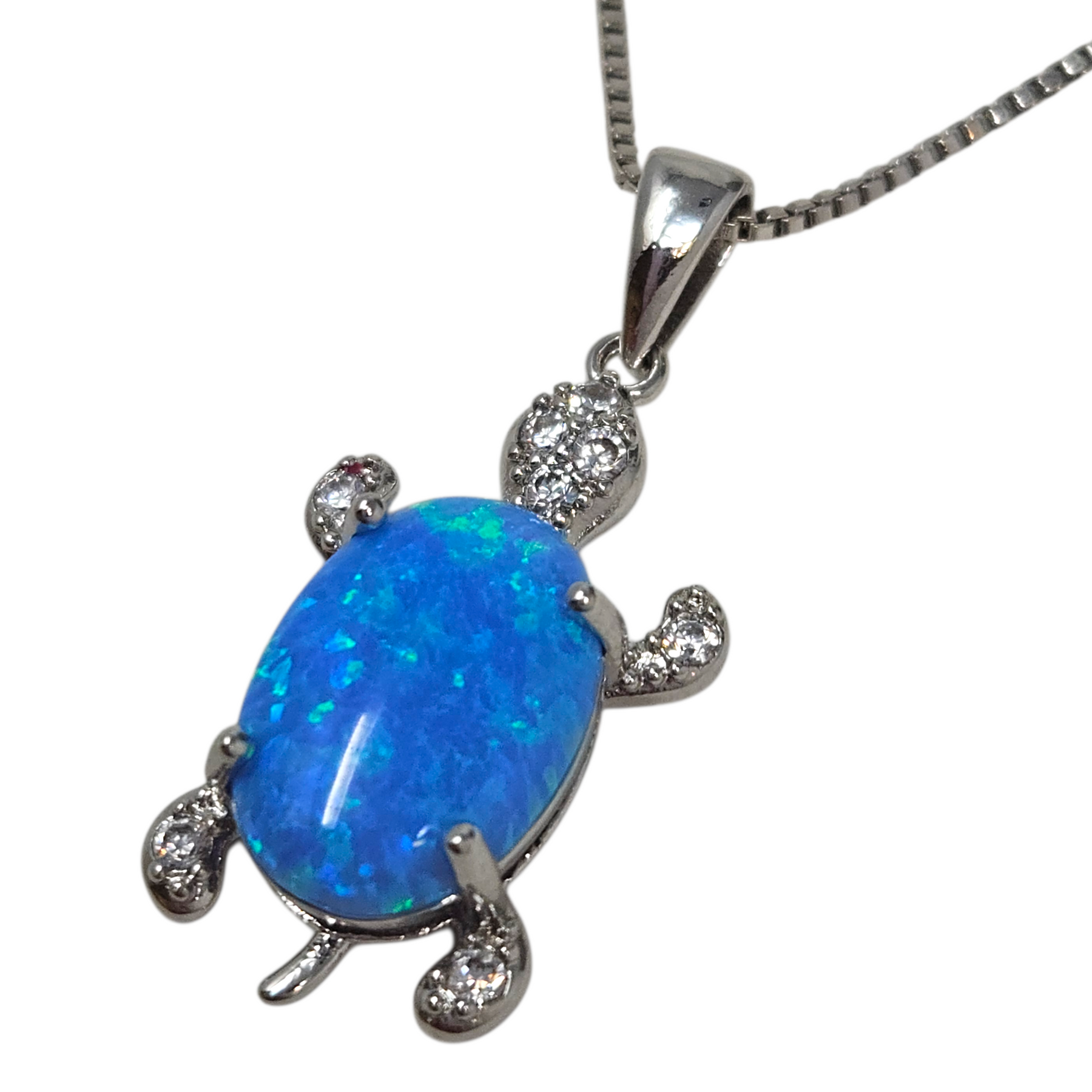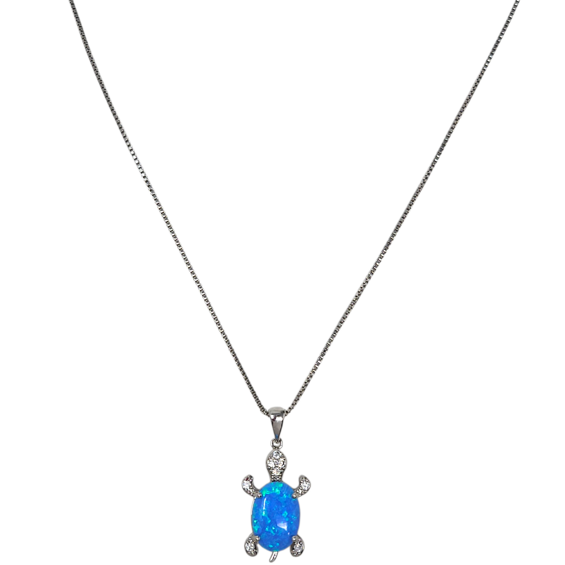 Materials: Silver-plated brass with an iridescent-blue lab-created opal turtle pendant, with cubic zironcia accents.
