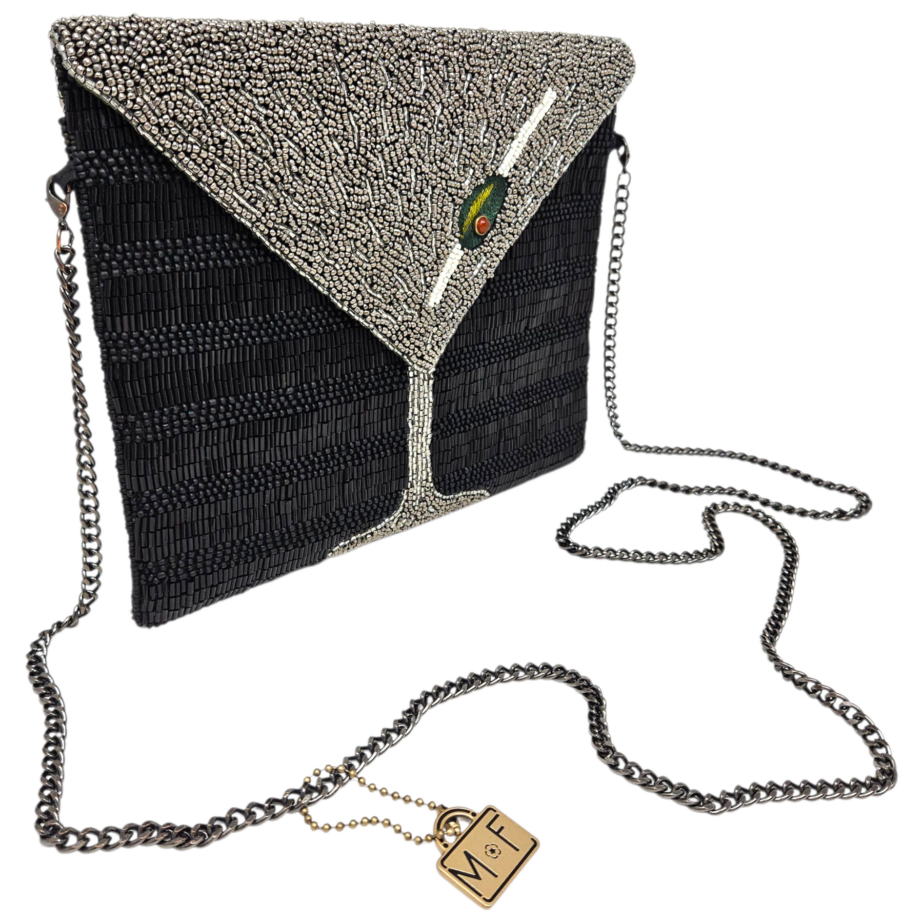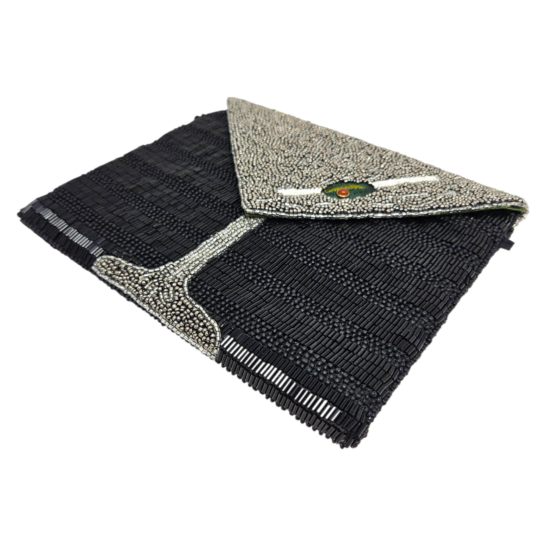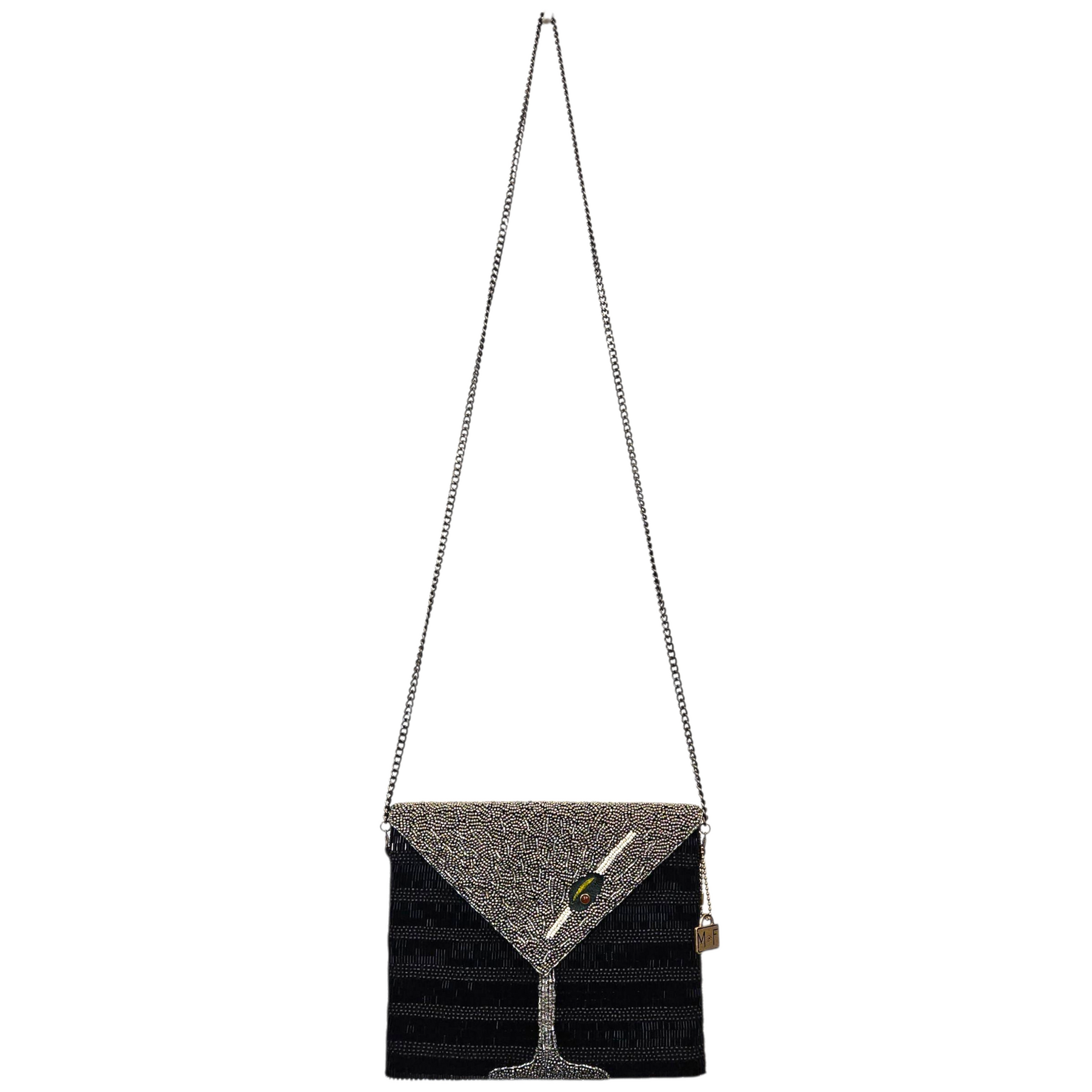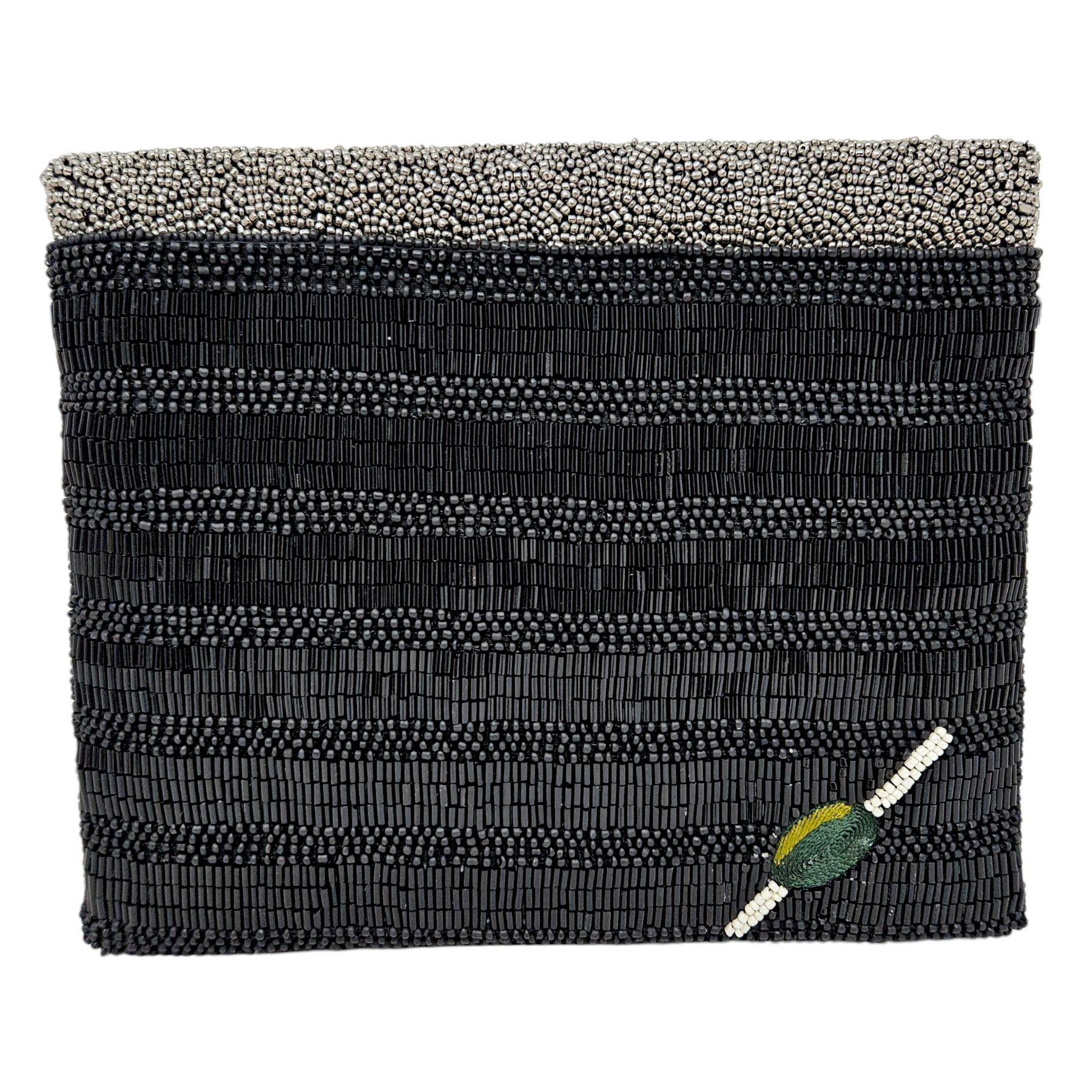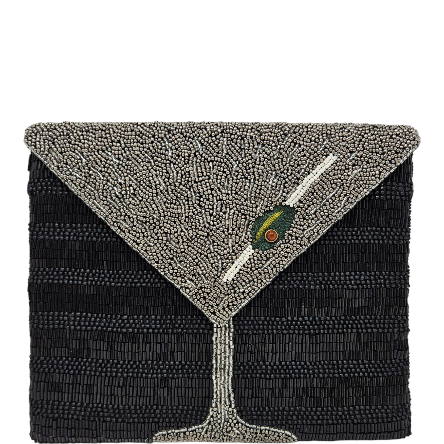 Materials: Handsewn black & silver beaded martini with embroidered olive, and gunmetal-tone hardware.