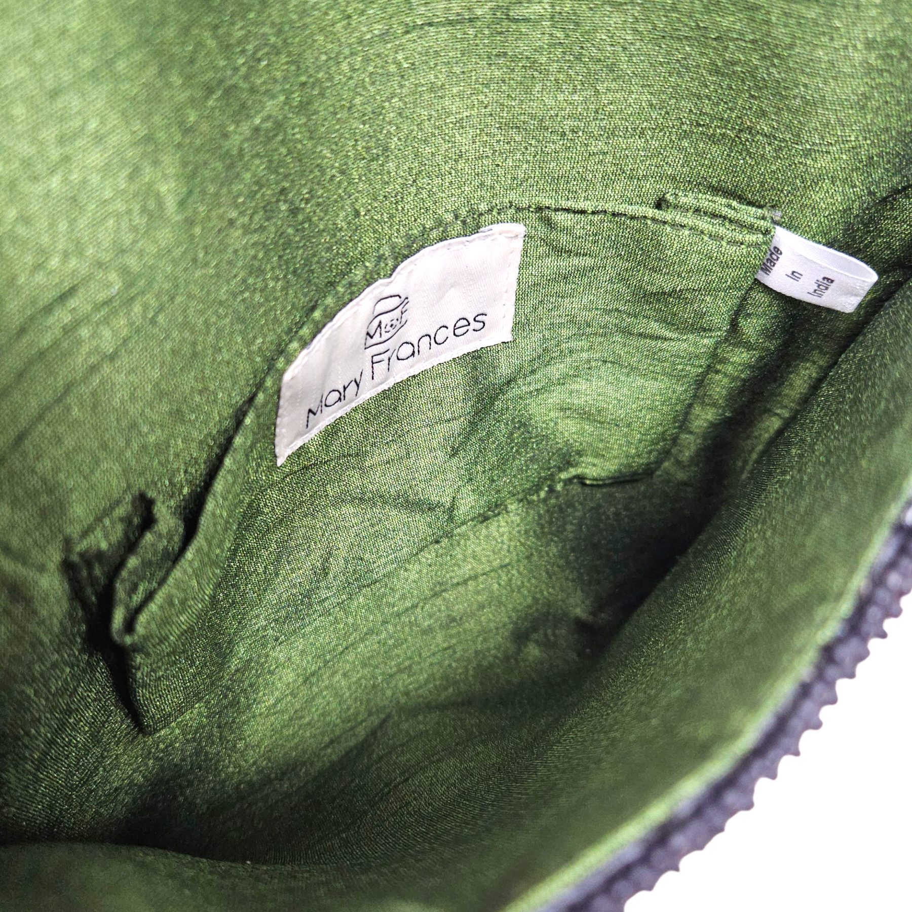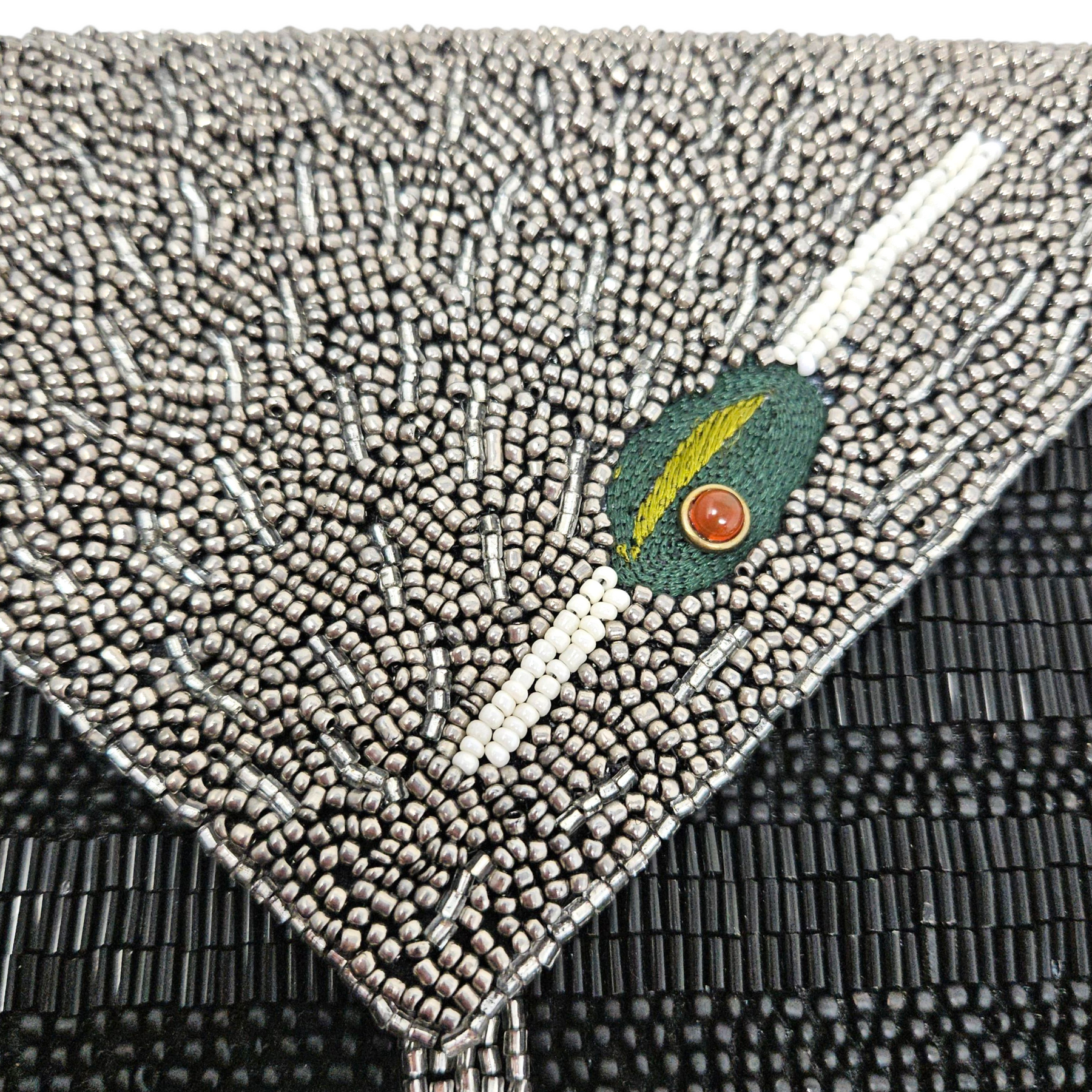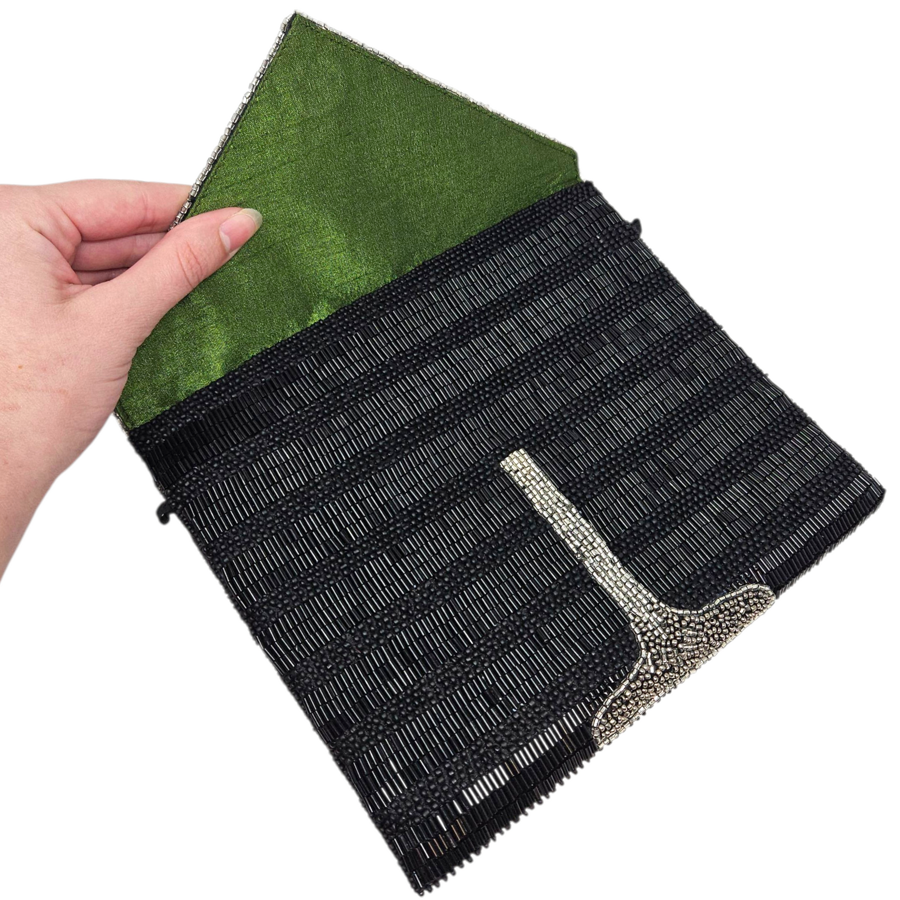 - Beautifully hand-beaded exterior with embroidered olive on front & back.