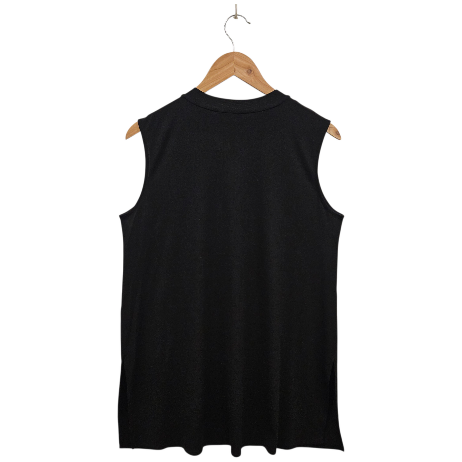 Approximate measurements: 38" bust, 40" waist, 44" bottom hem, 8.5" armhole drop, 3.5" shoulders, 8.5" side slits, 28" total length.