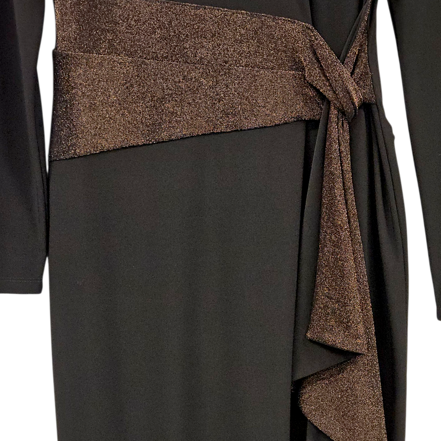 - Shimmery draped waist sash.
