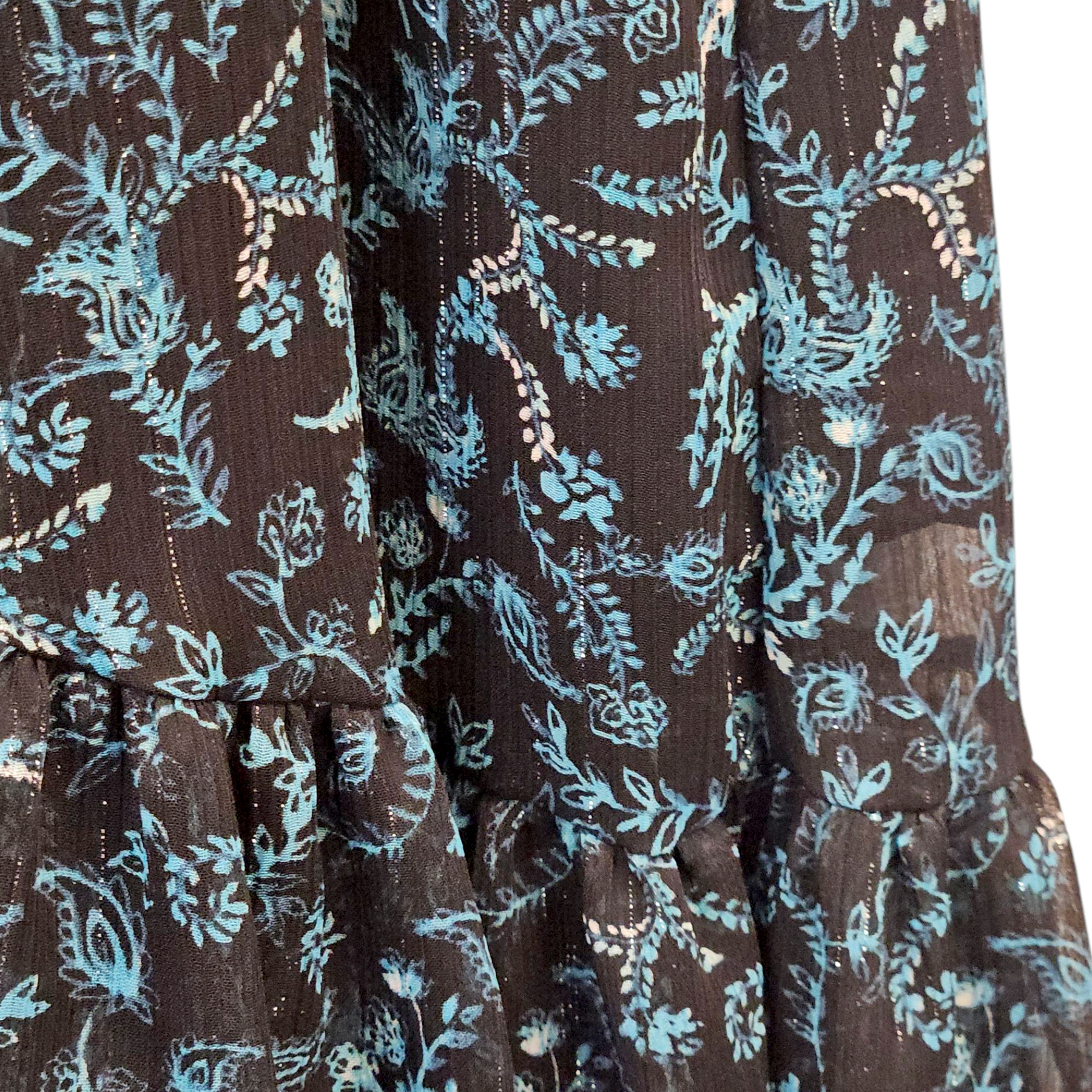 - Lightweight chiffon with floral & paisley print, and metallic stripe details.