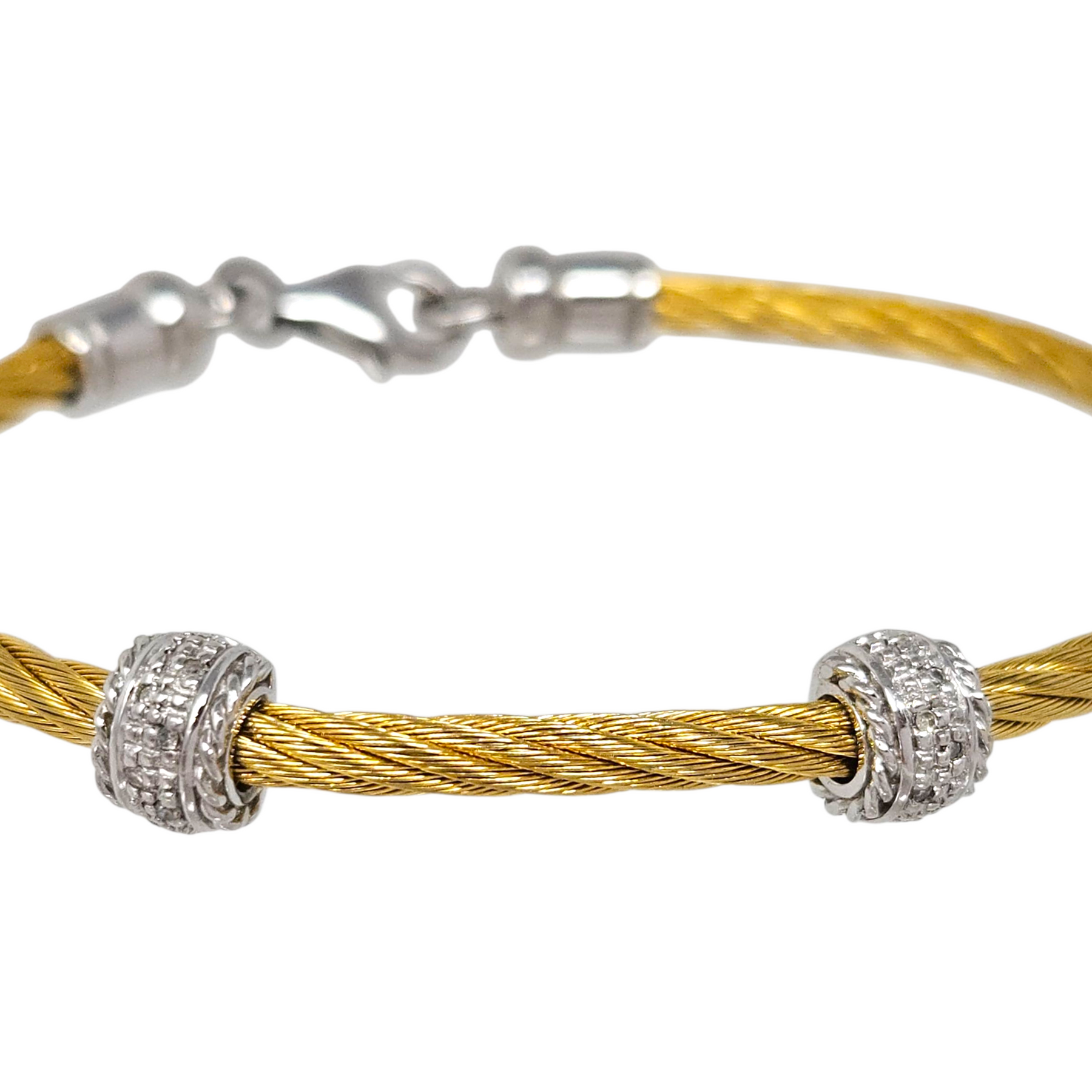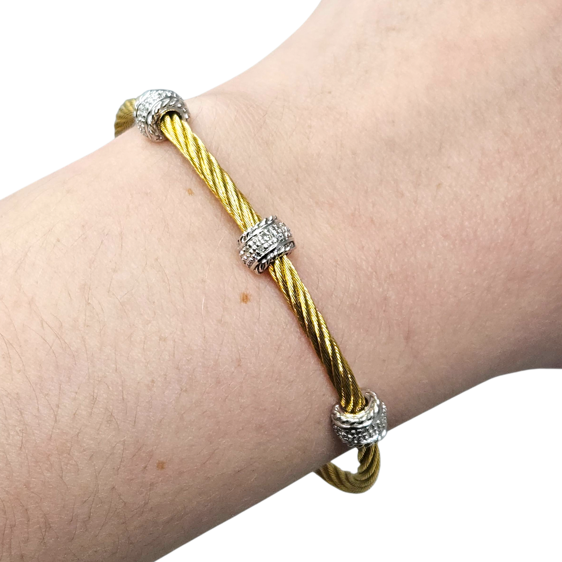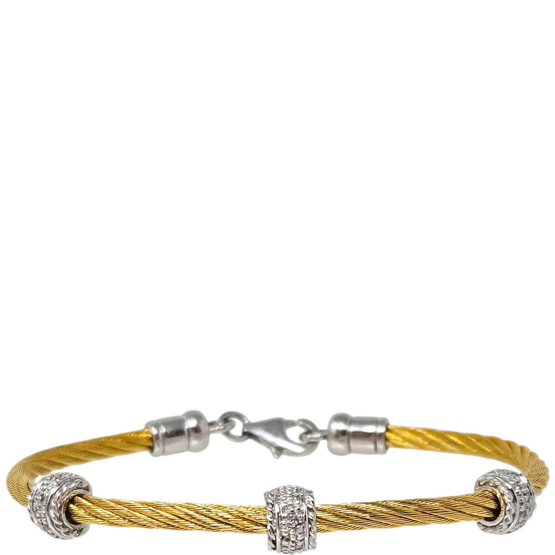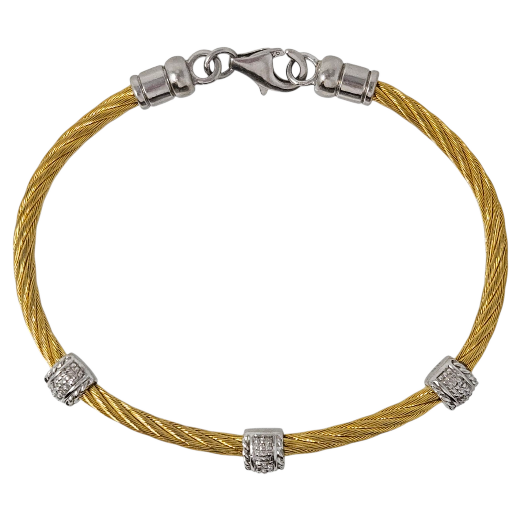Materials: Gold over stainless steel for cable, with .925 sterling silver, & three stations with tiny diamond accents.