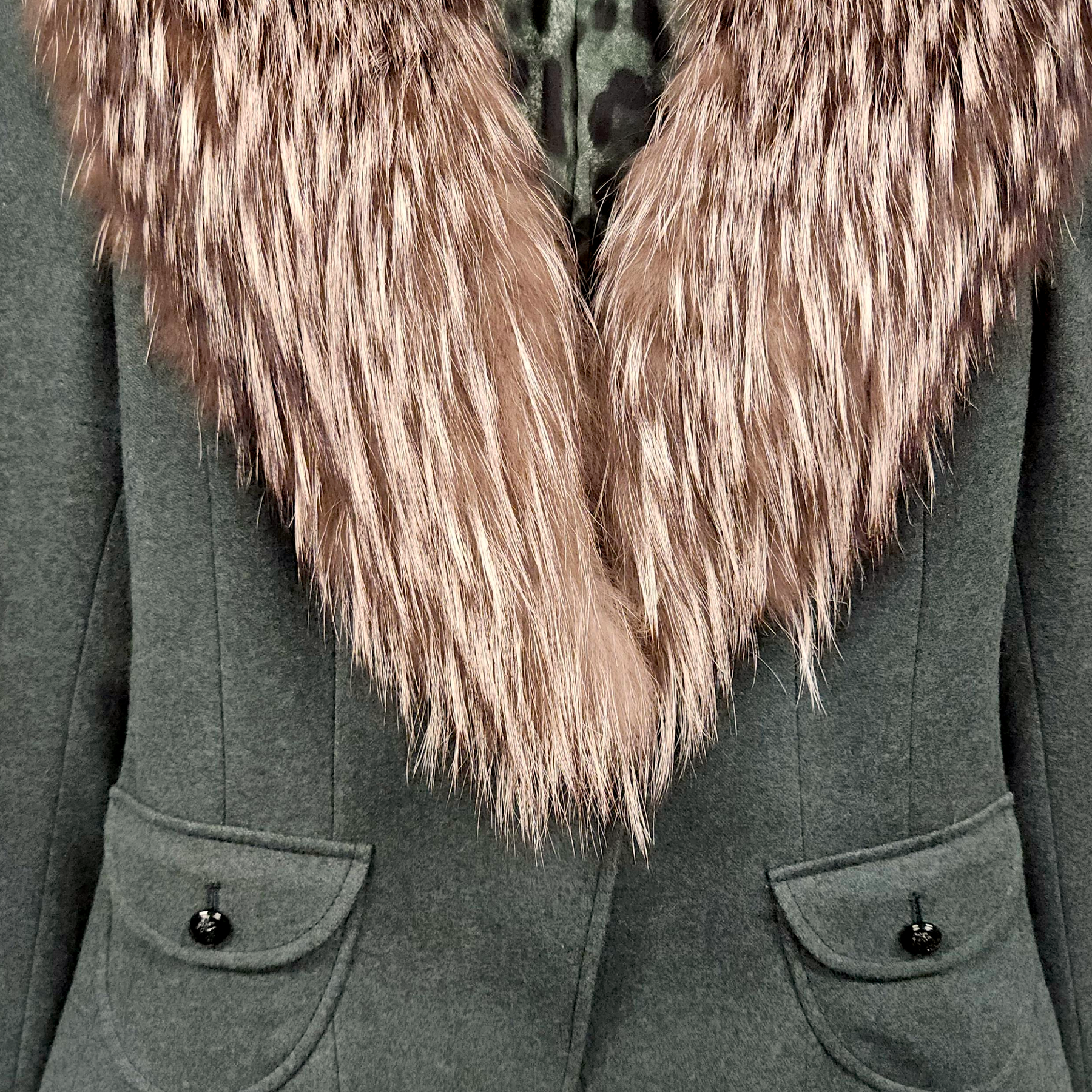 Materials: Green, care label removed, 95% wool, 3% polyamide, 2% lycra, with brown & white genuine fur trim.