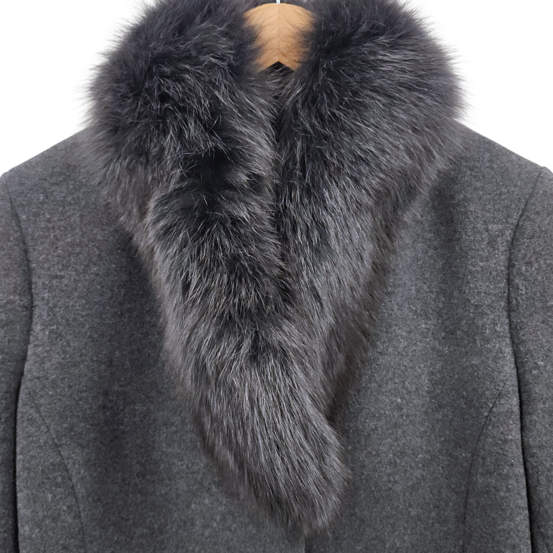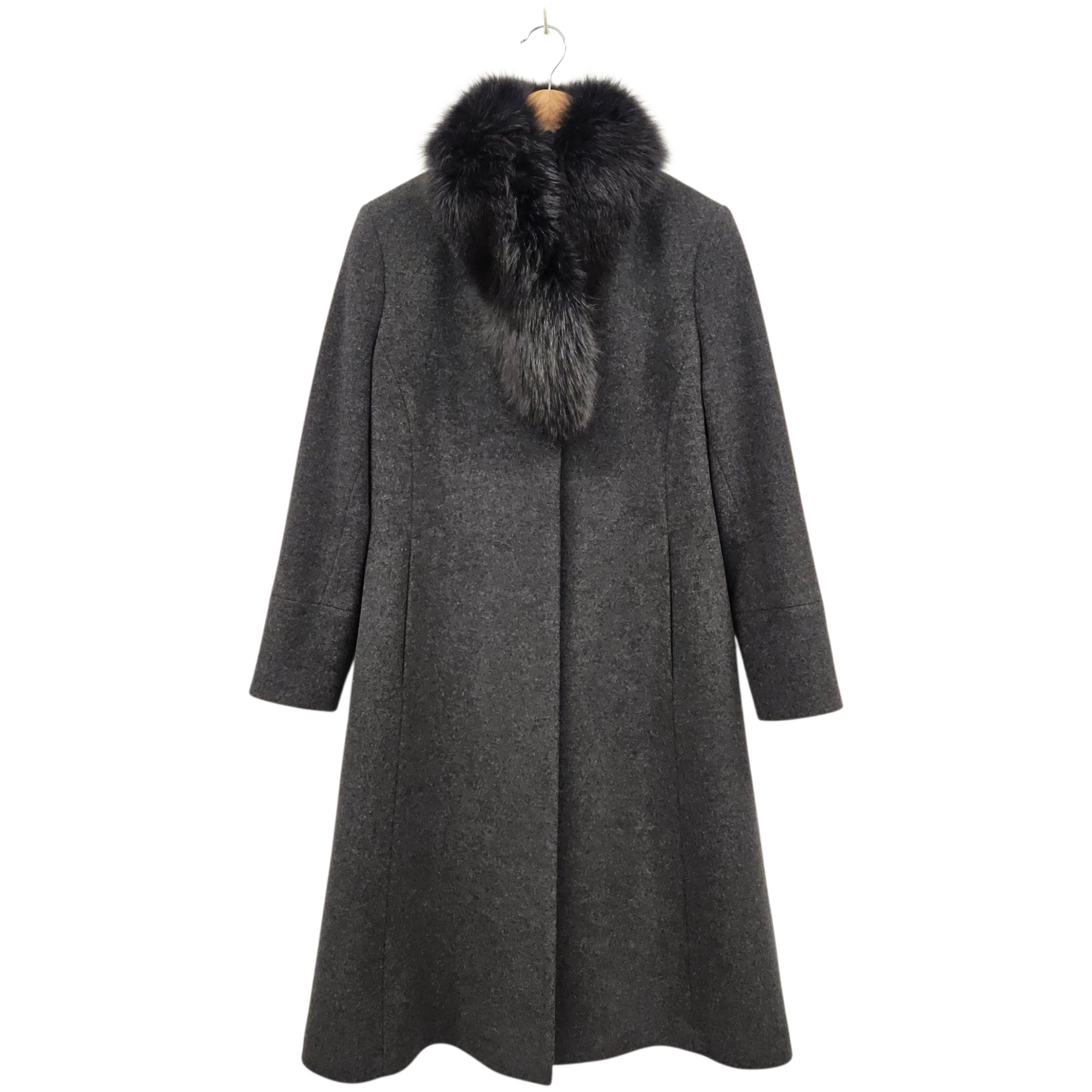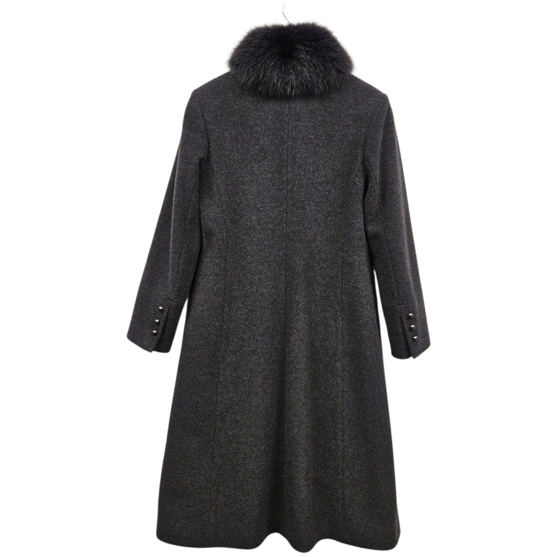 Materials: Grey 70% wool, 20% polyamide, 10% cashmere, with dyed fox fur trim.
