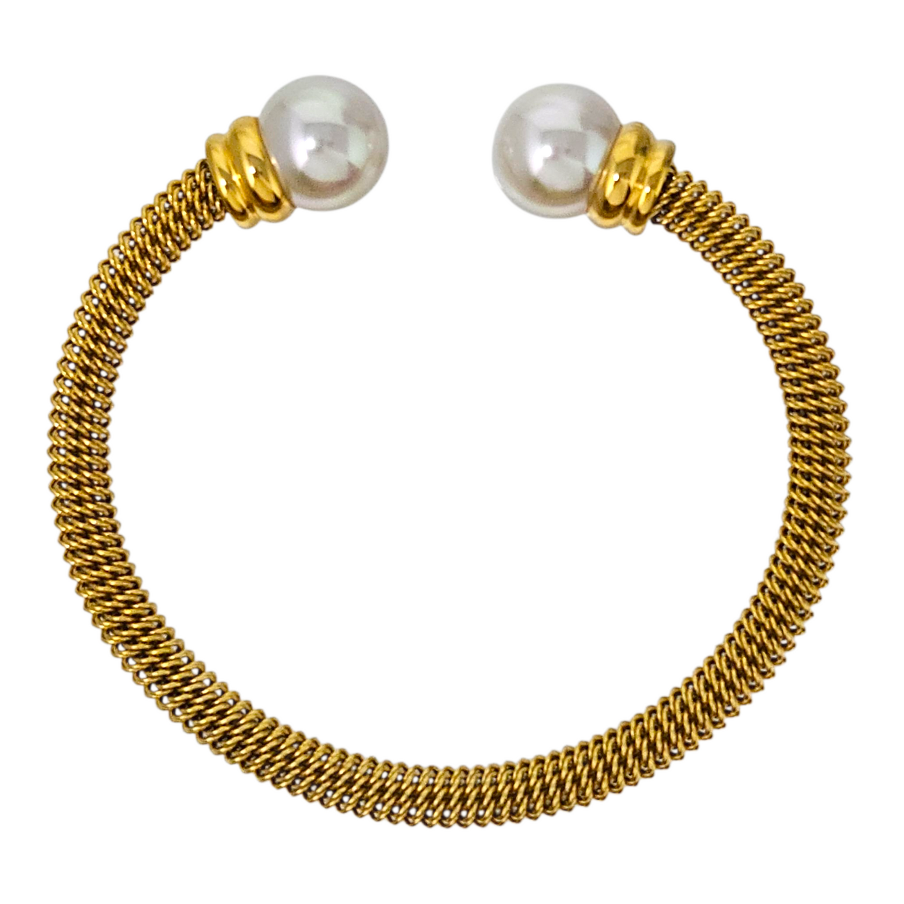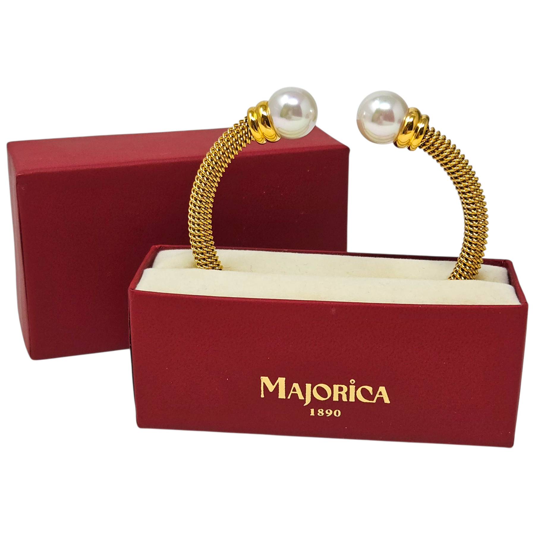 Materials: Gold-plated steel mesh bracelet adorned with Majorica's manmade lustrous pearls.