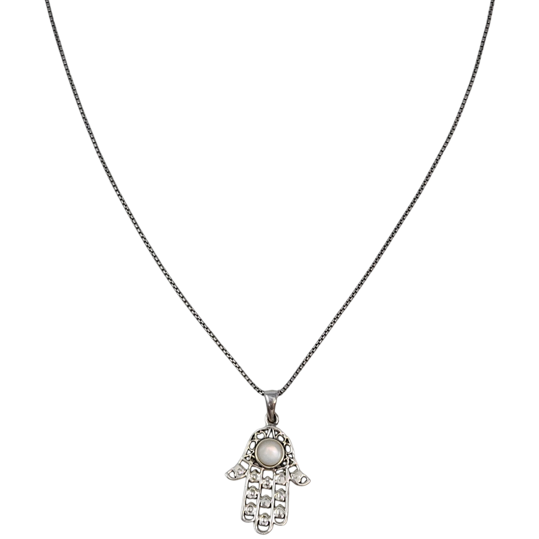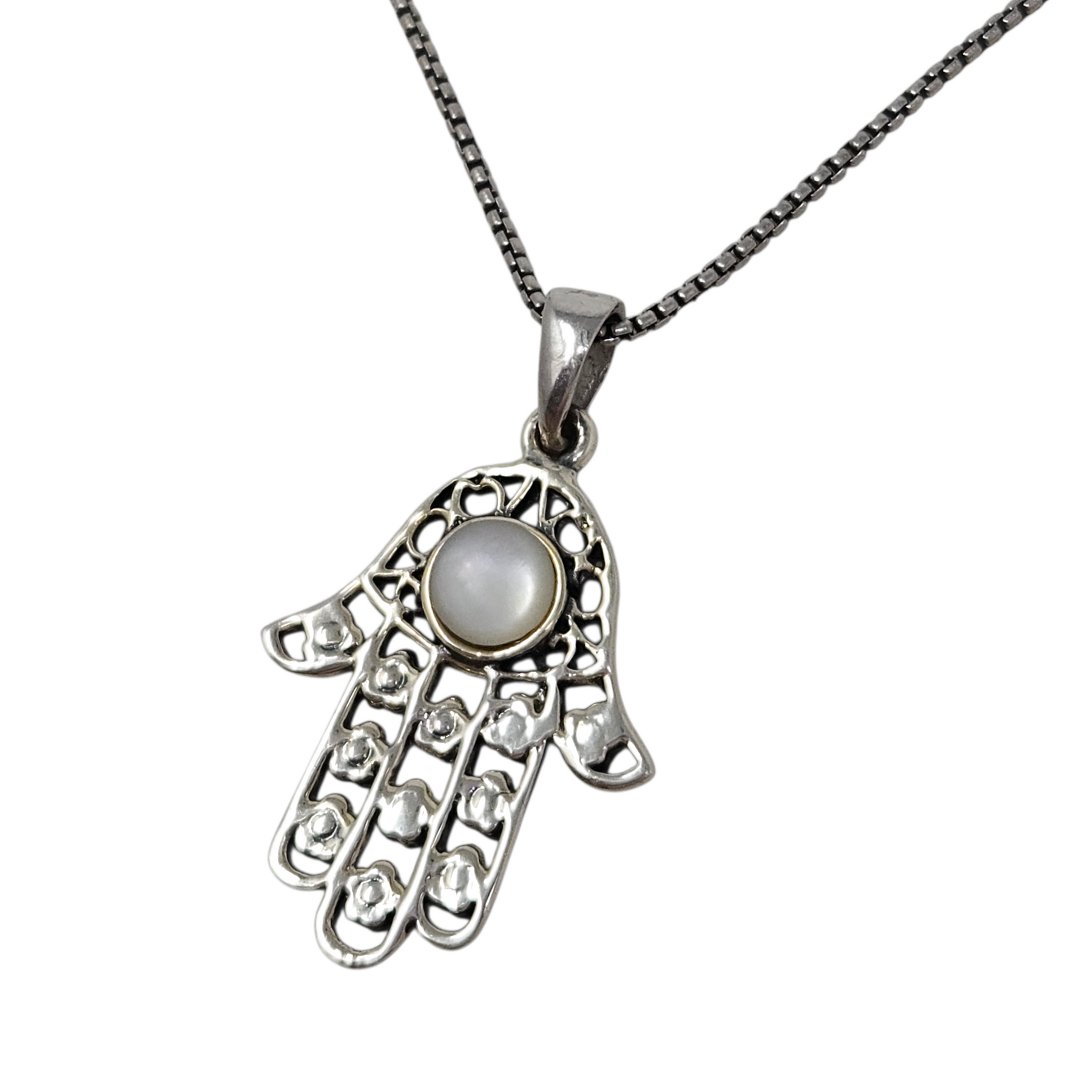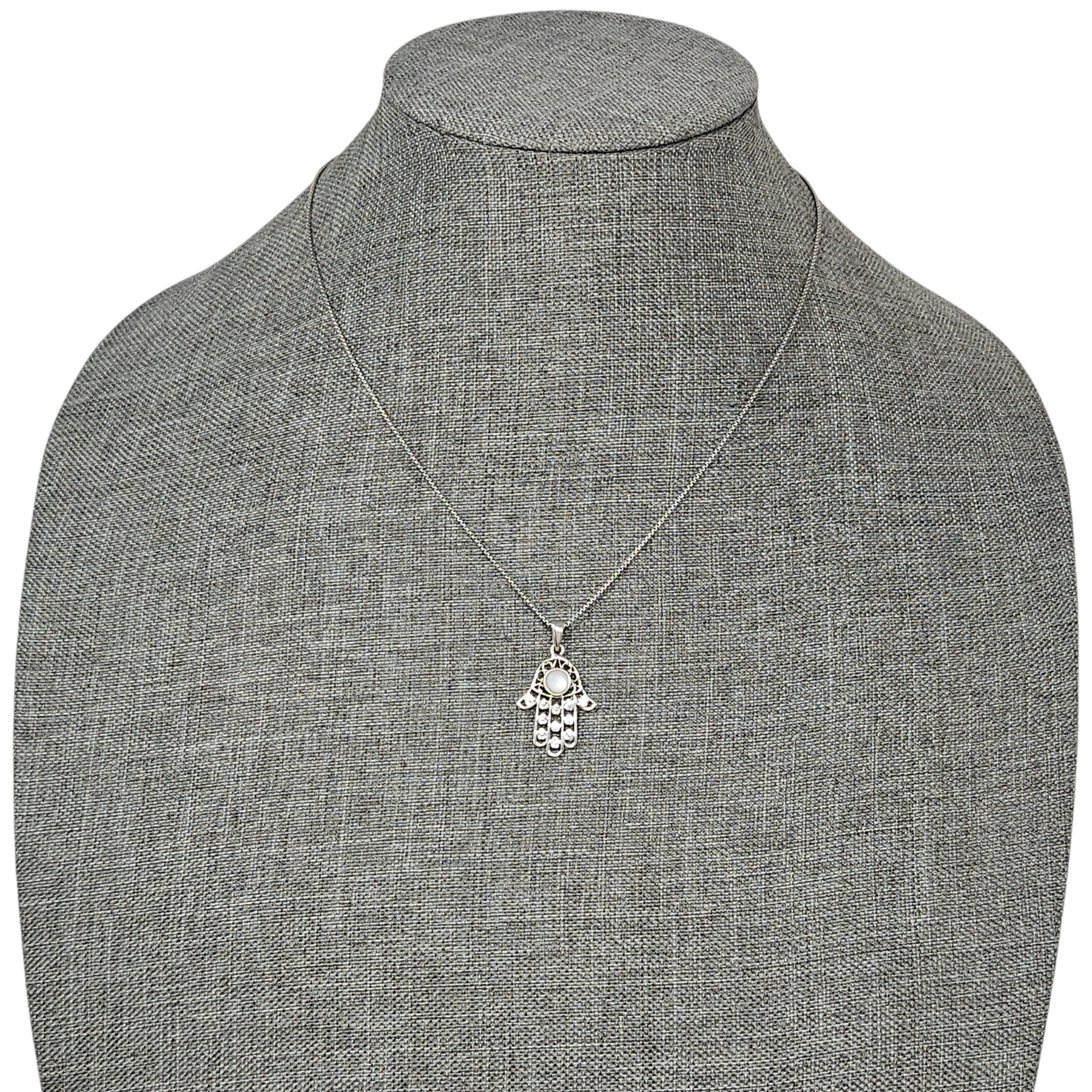 Materials: .925 sterling silver chain & Hamsa hand pendant with a round iridescent-white stone accent.