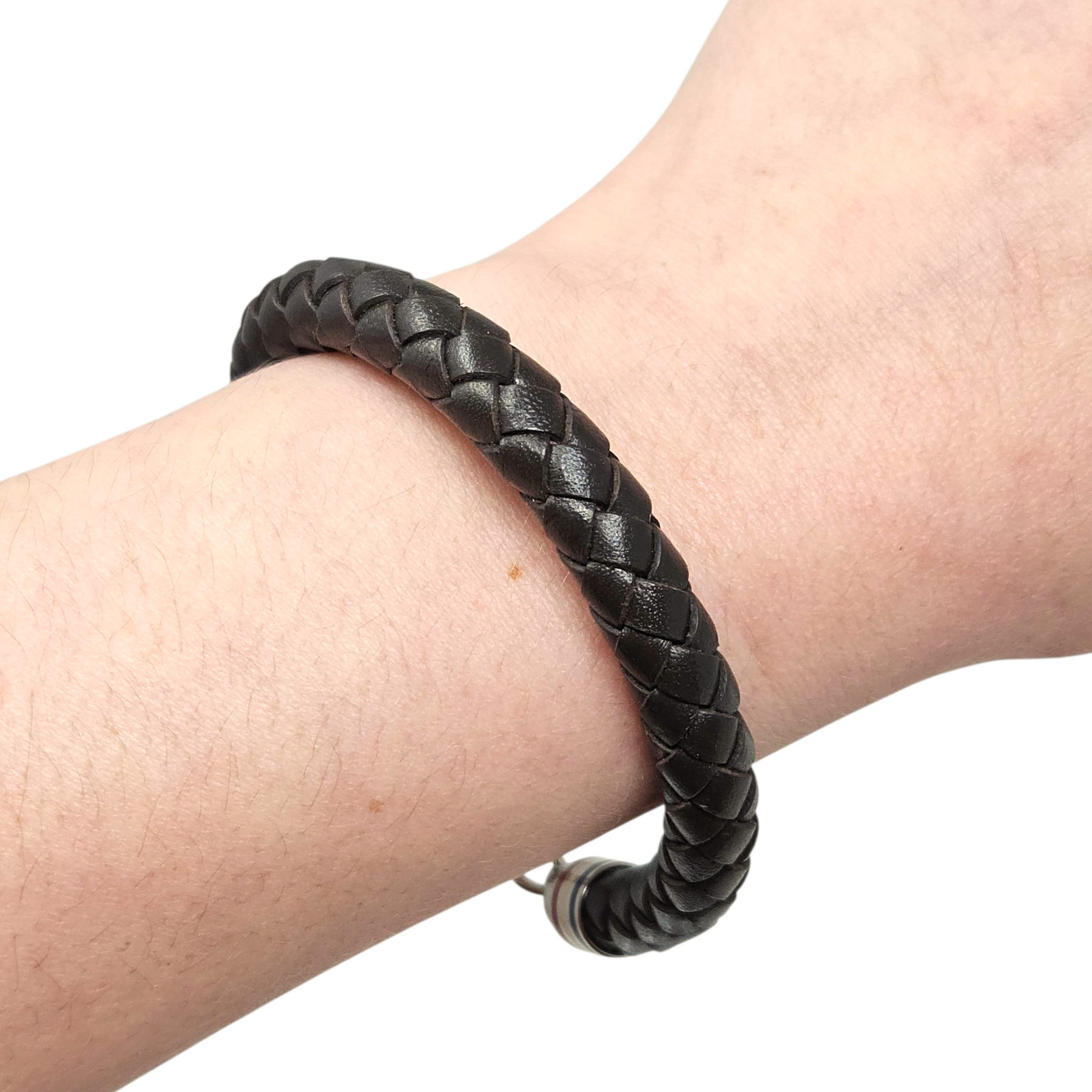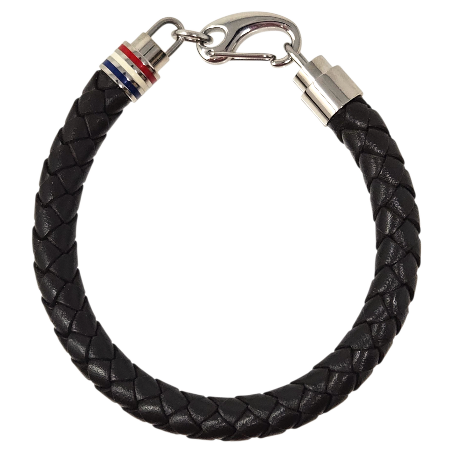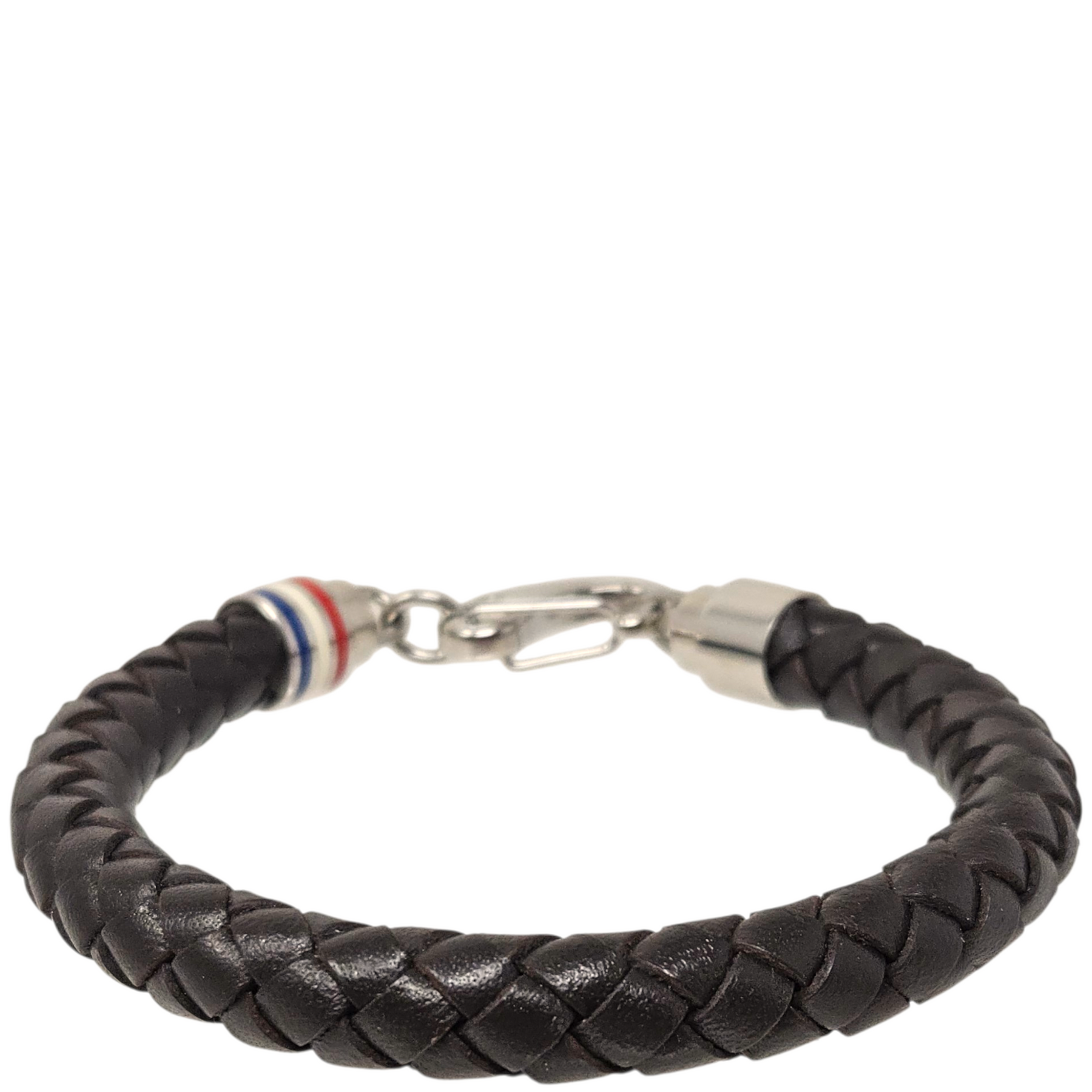 Materials: Dark-brown braided leather with silver-tone hardware & red, white, & navy accent.
