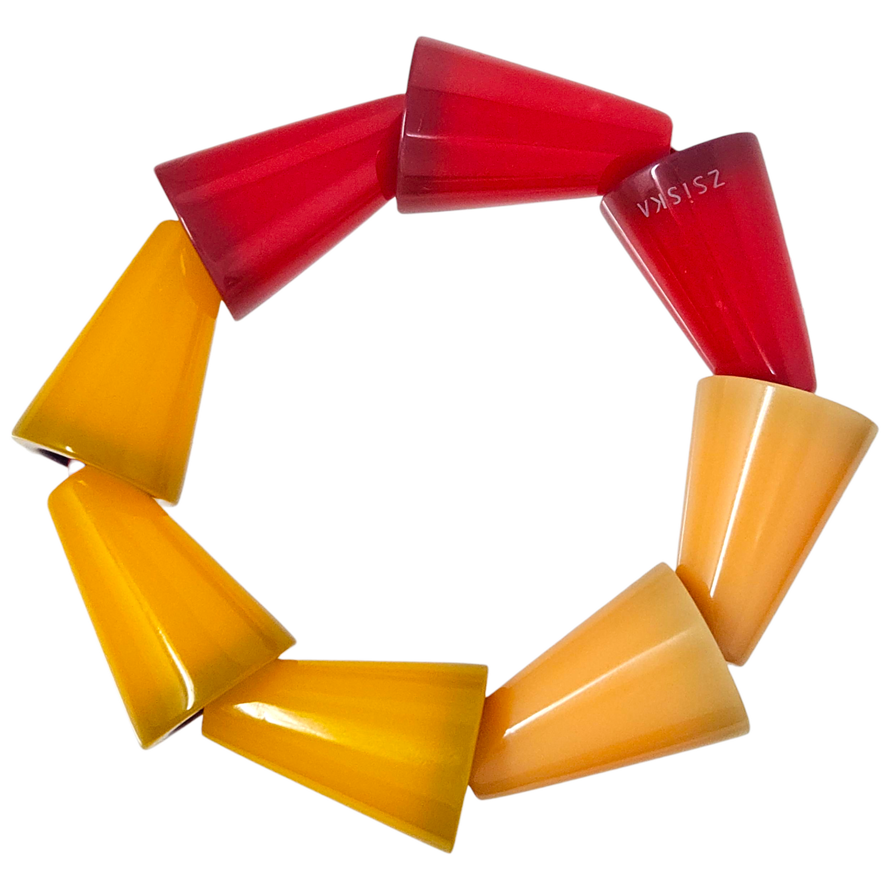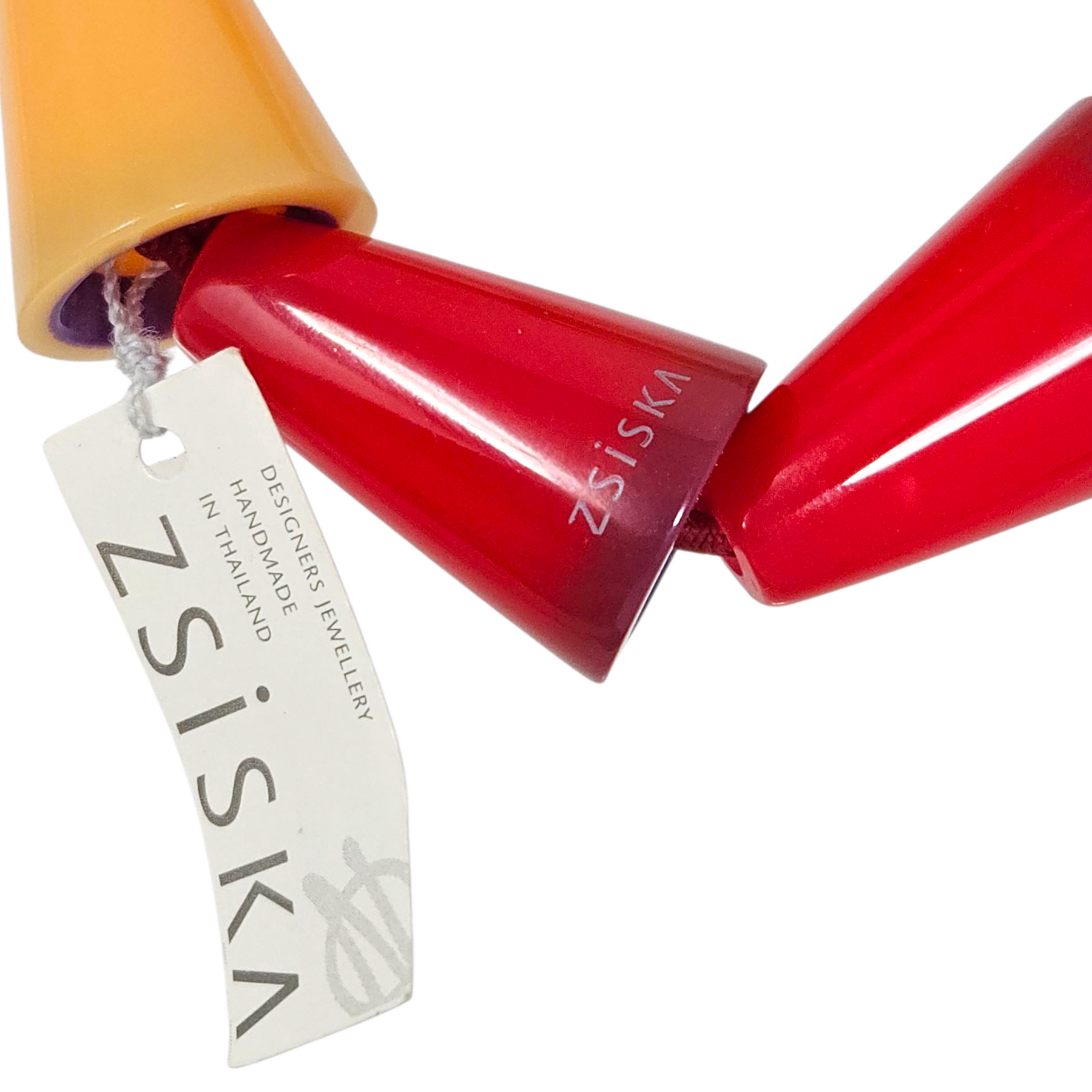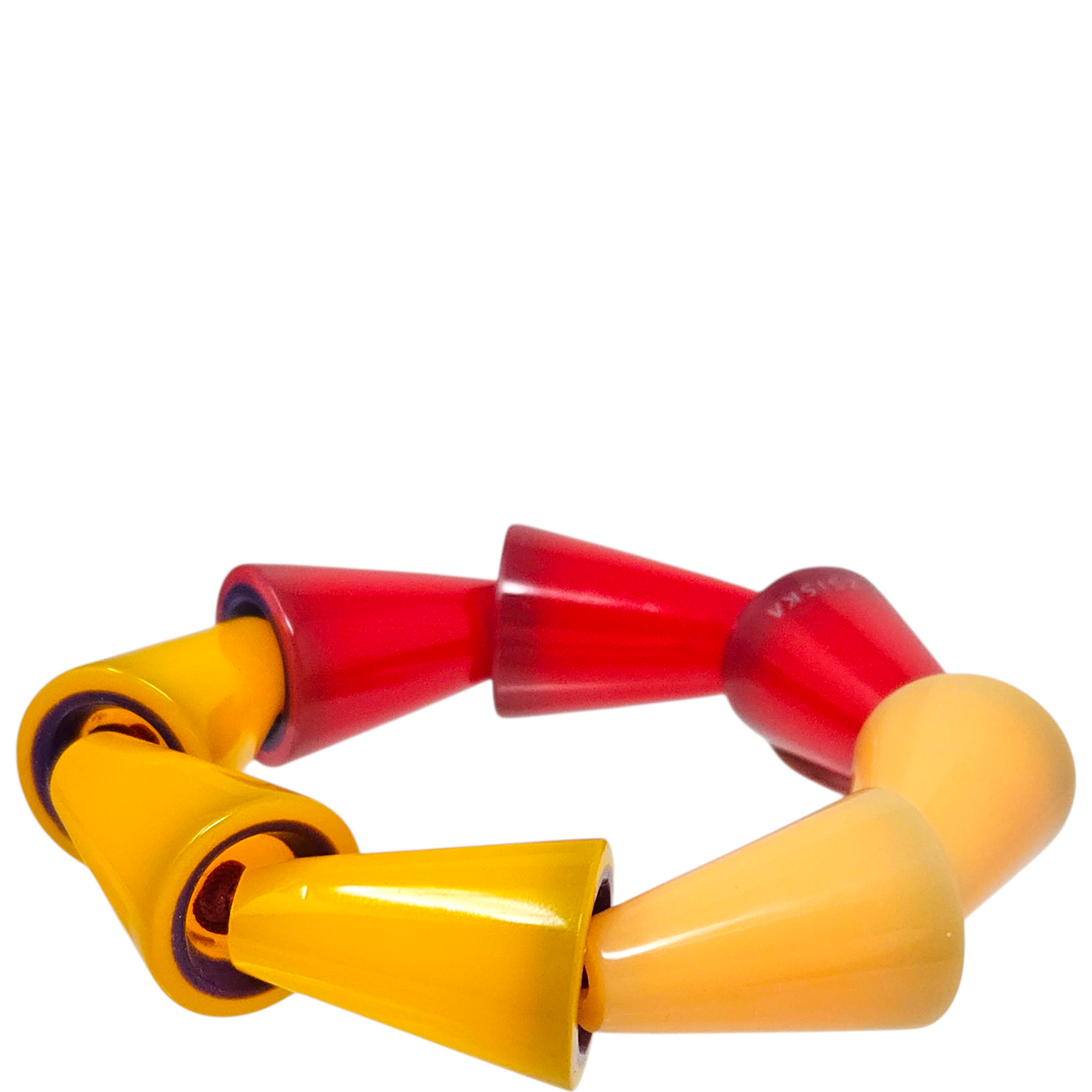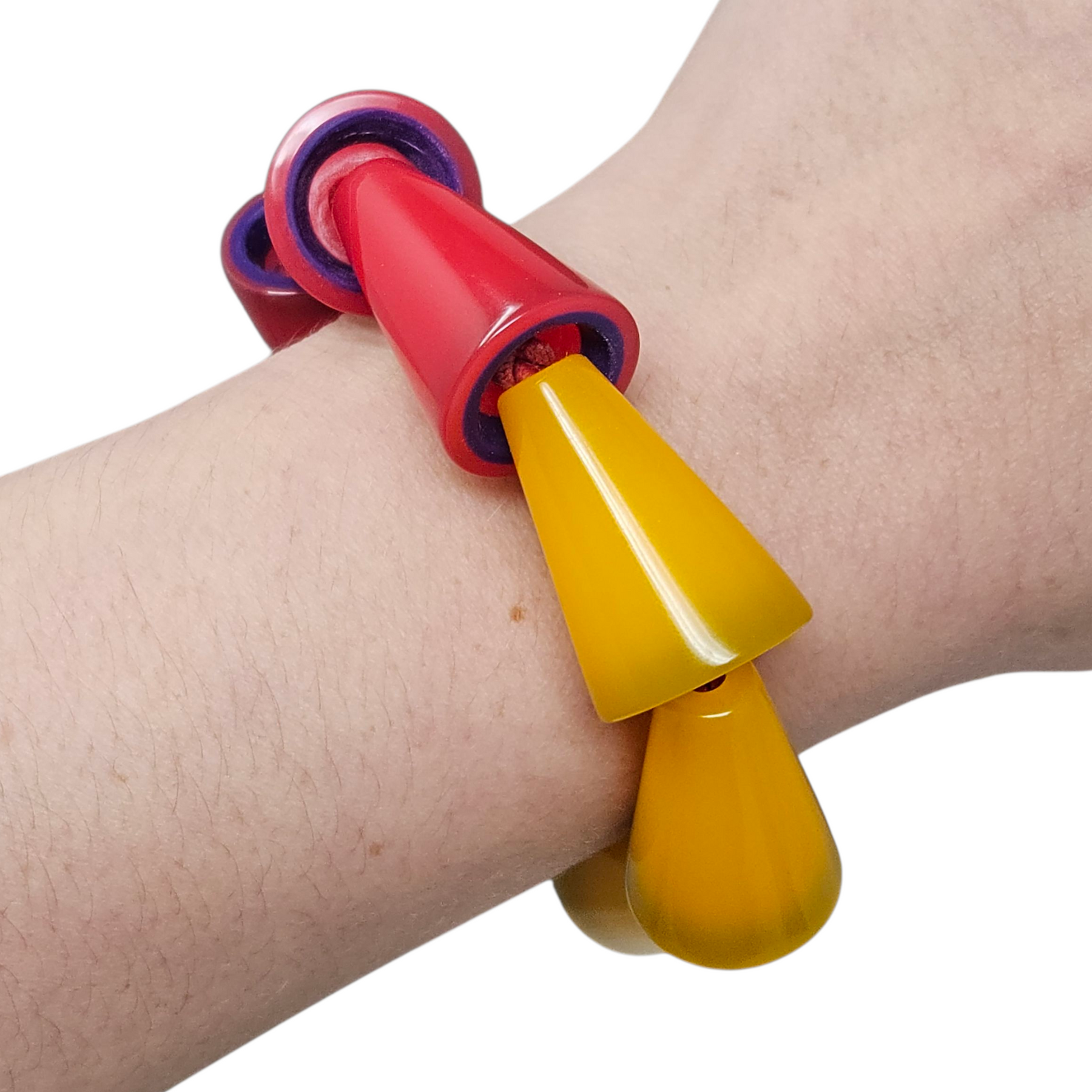 Materials: Yellow, peach, & red resin cones on elastic cord.
