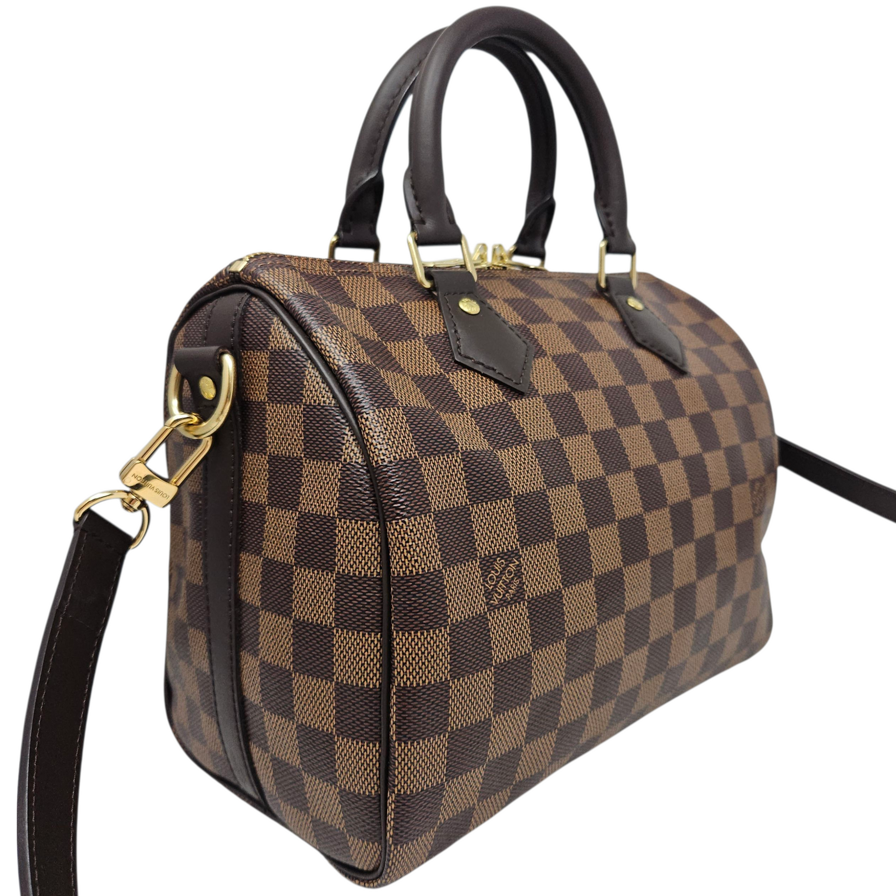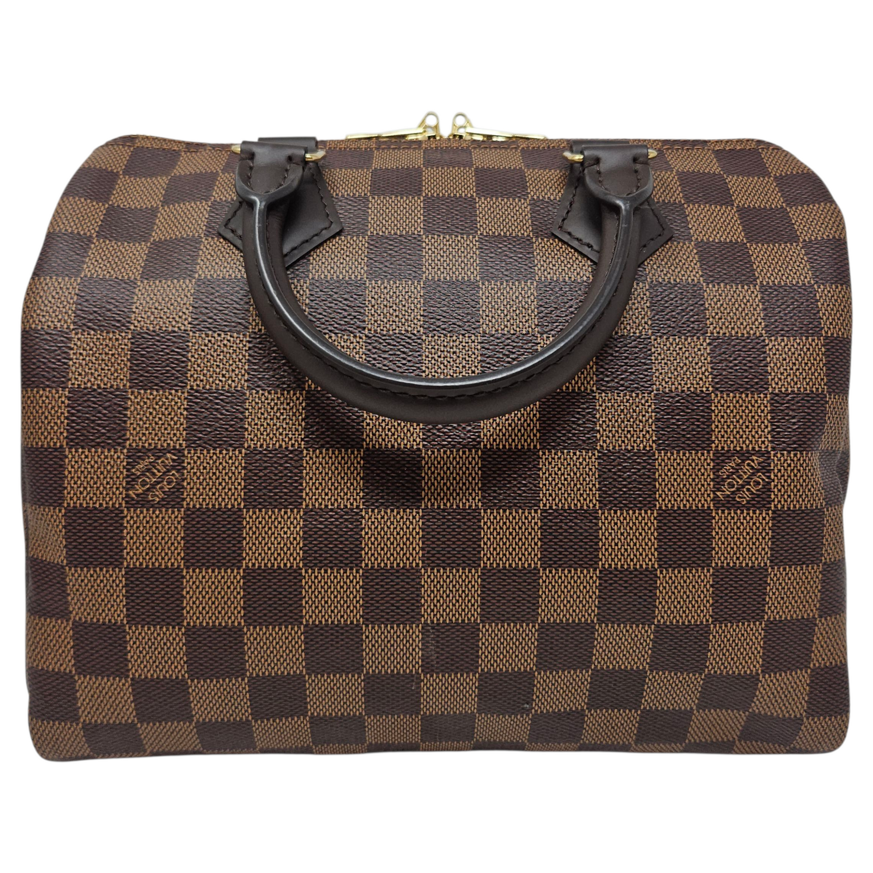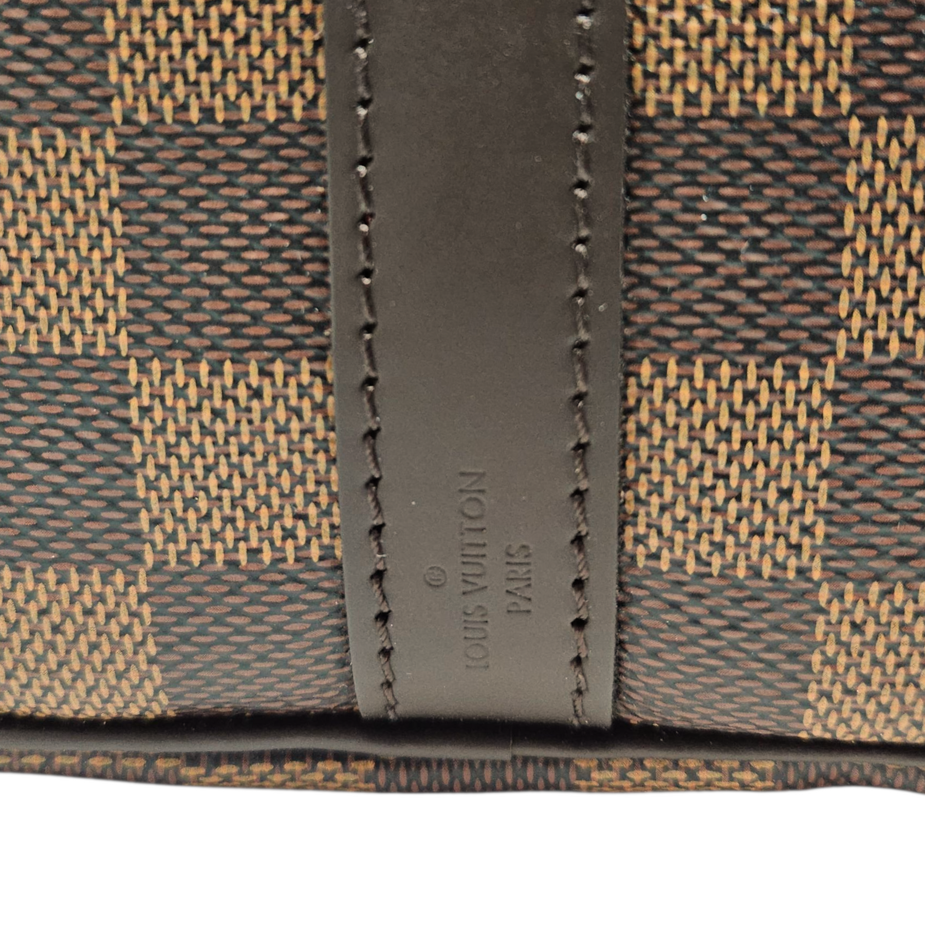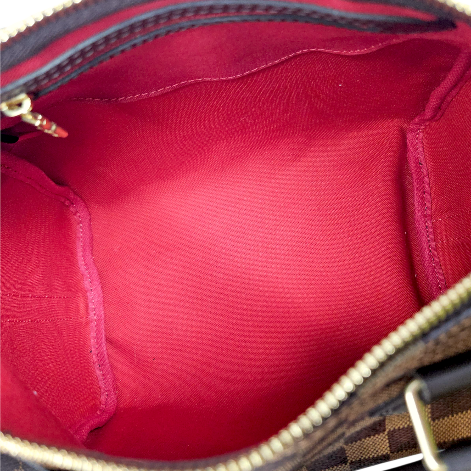 Materials: Damier ebene coated canvas, brown leather trim, & gold-tone hardware.