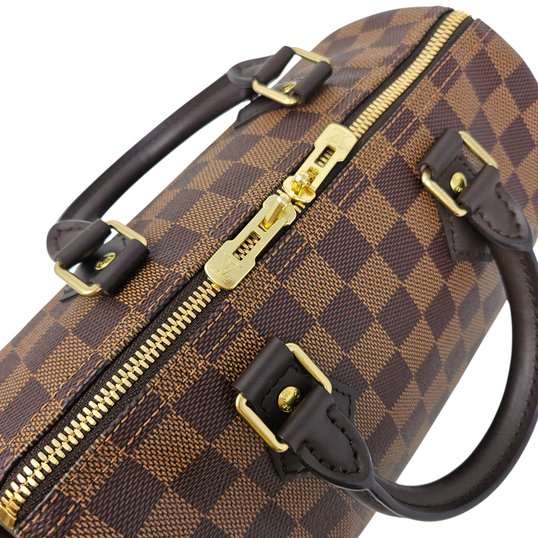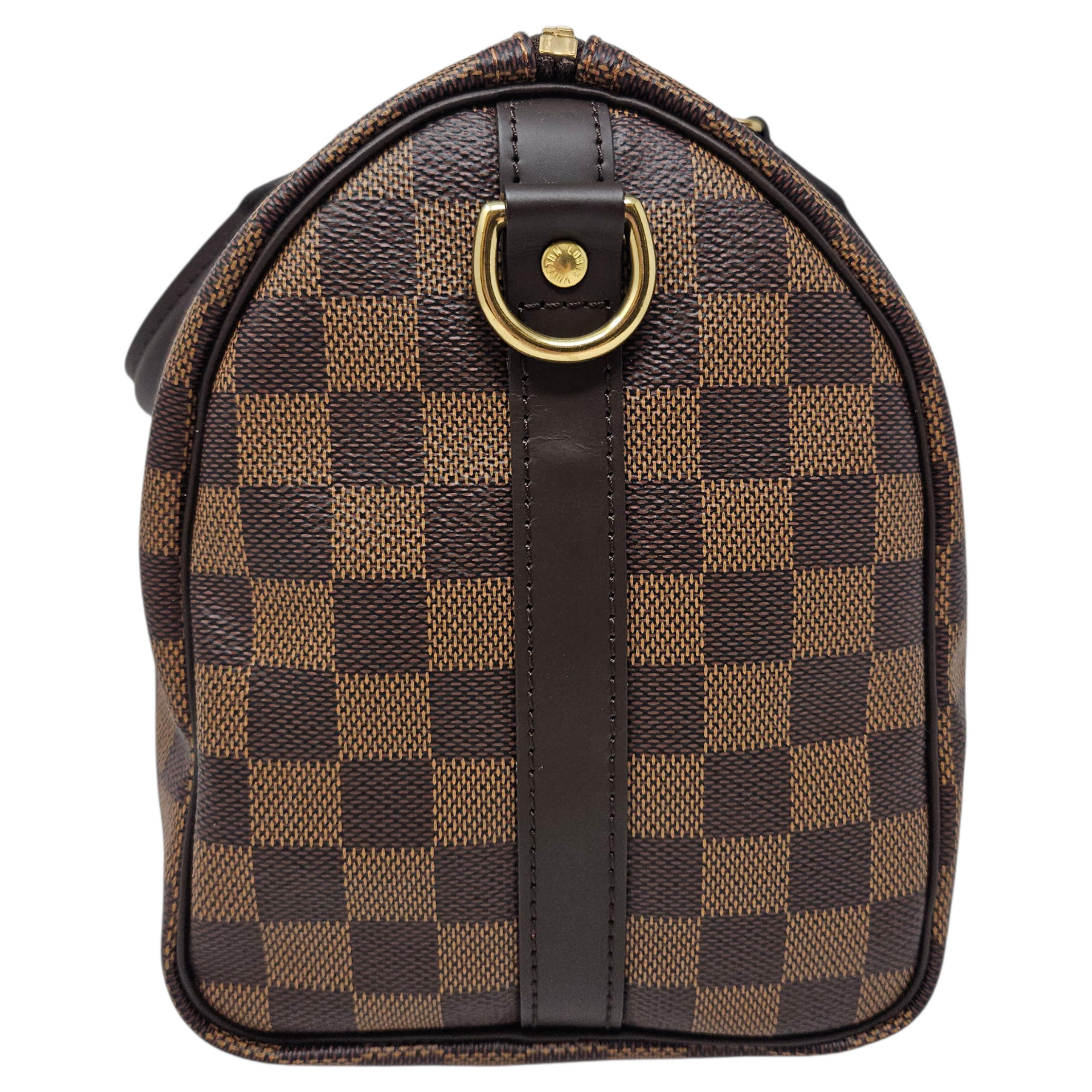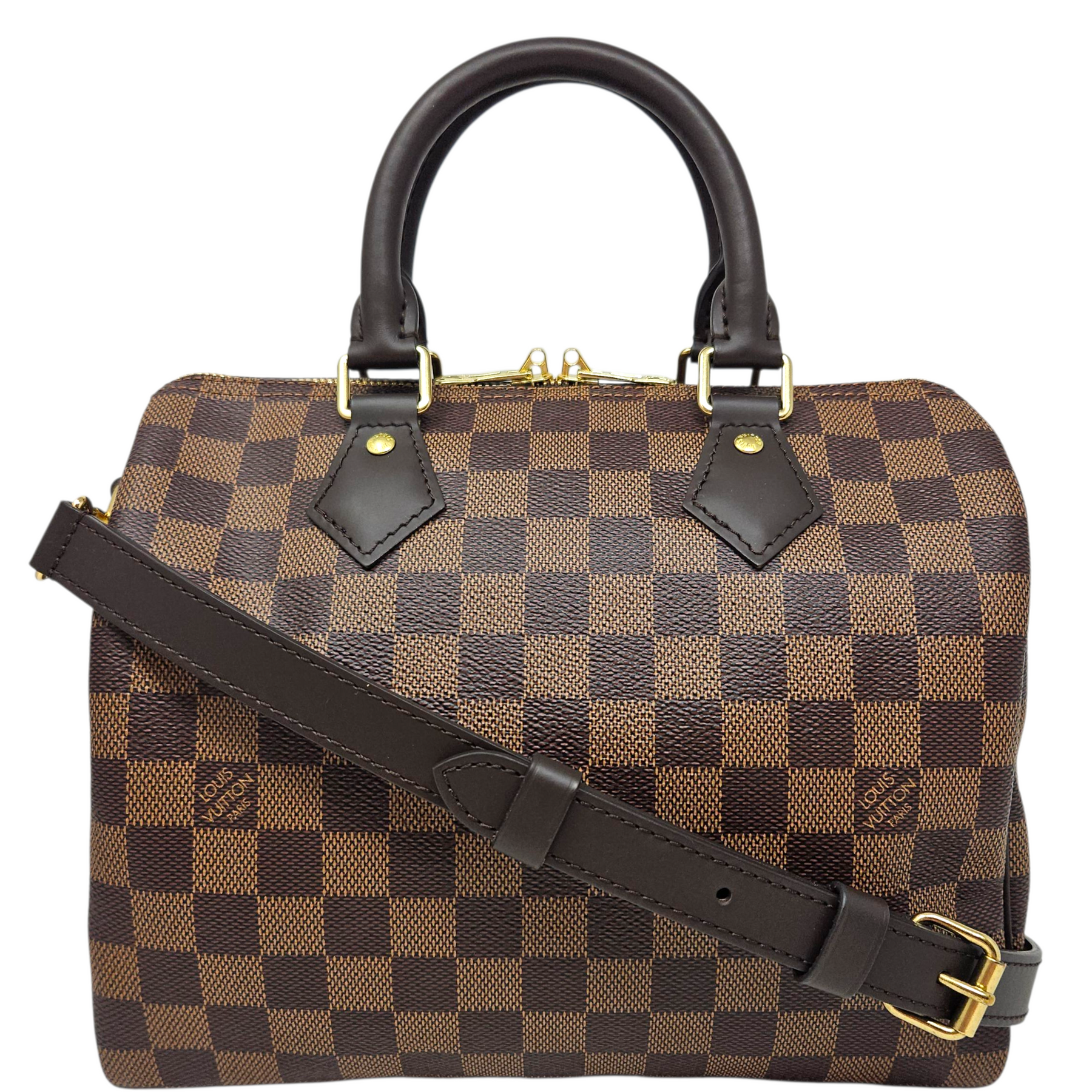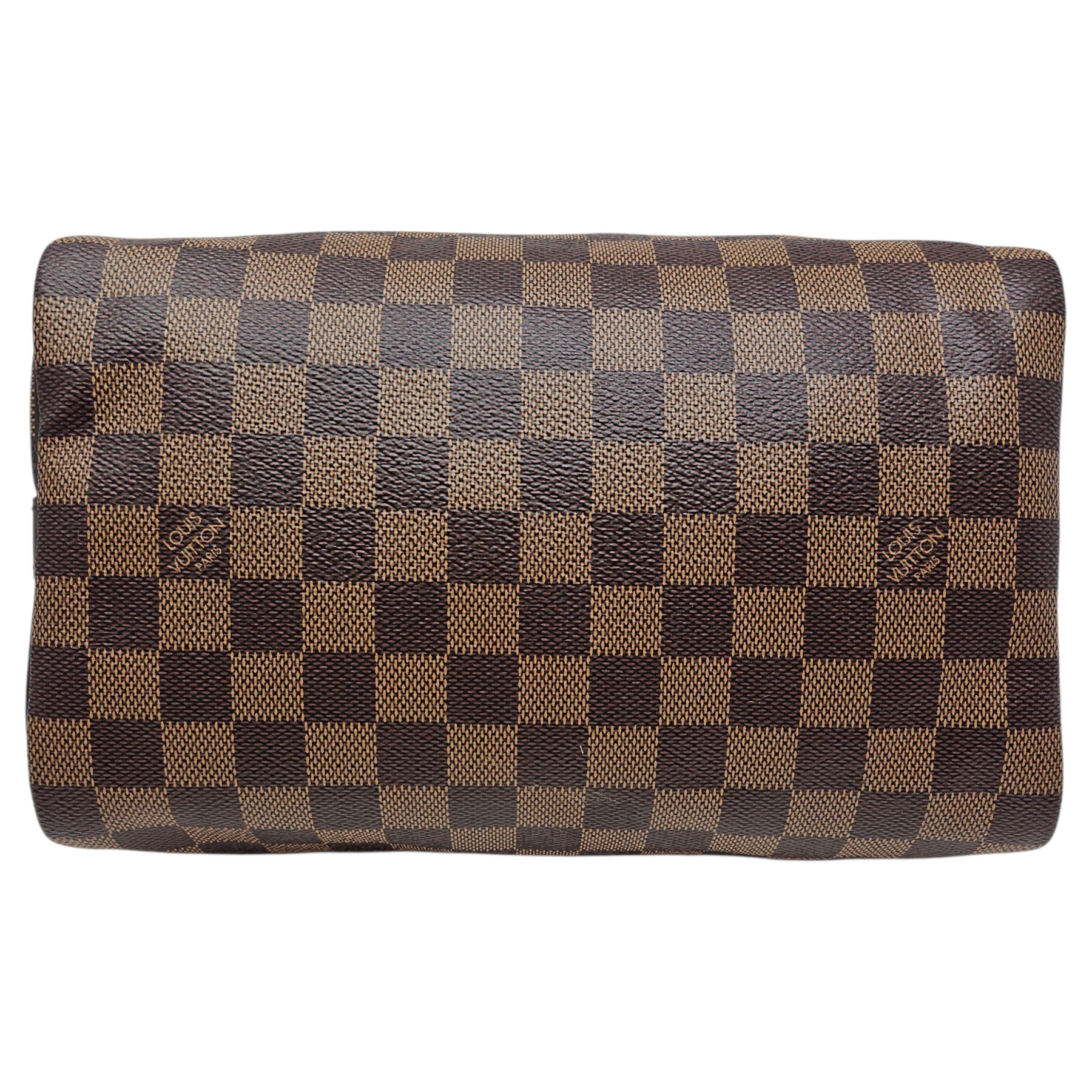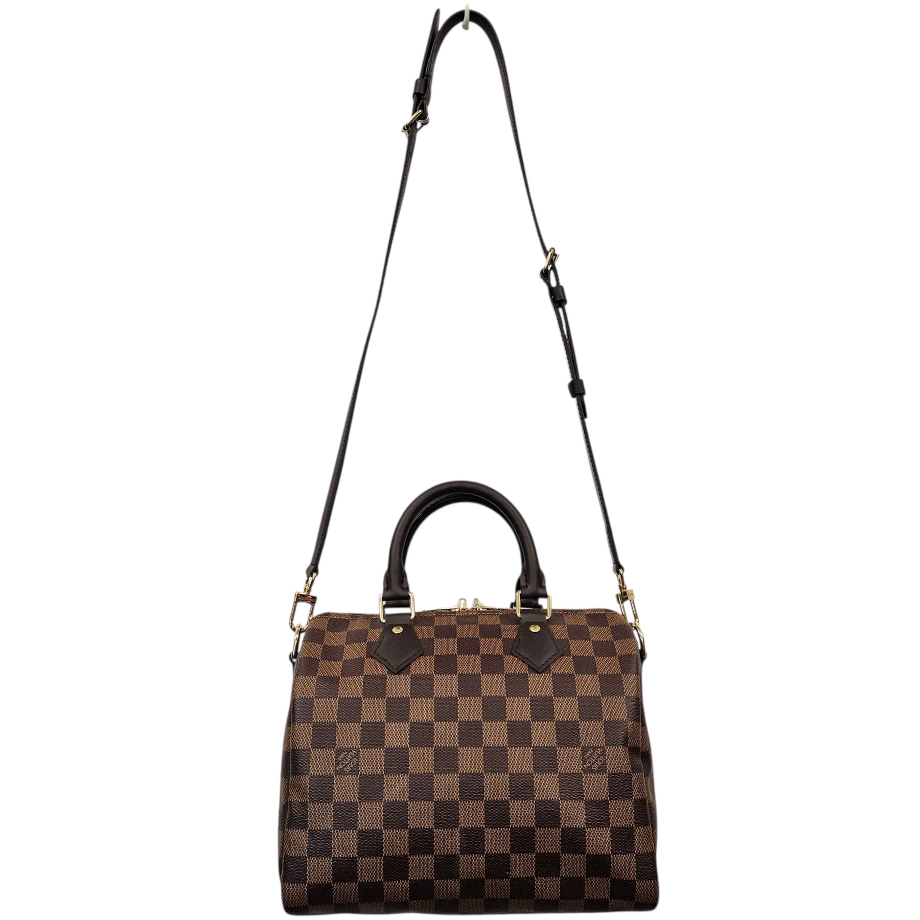 Materials: Damier ebene coated canvas, brown leather trim, & gold-tone hardware.