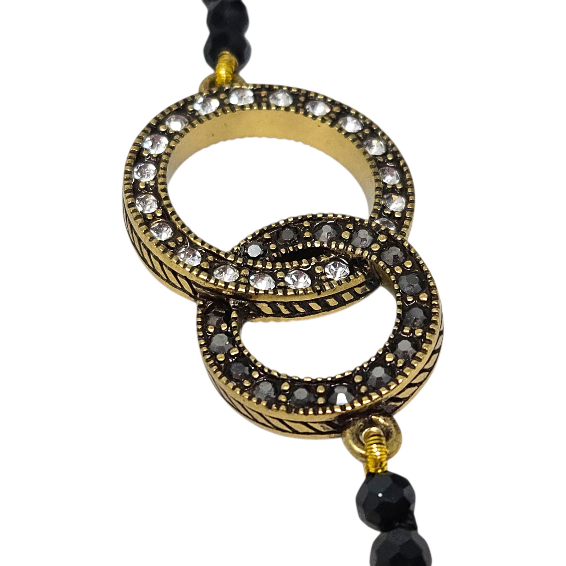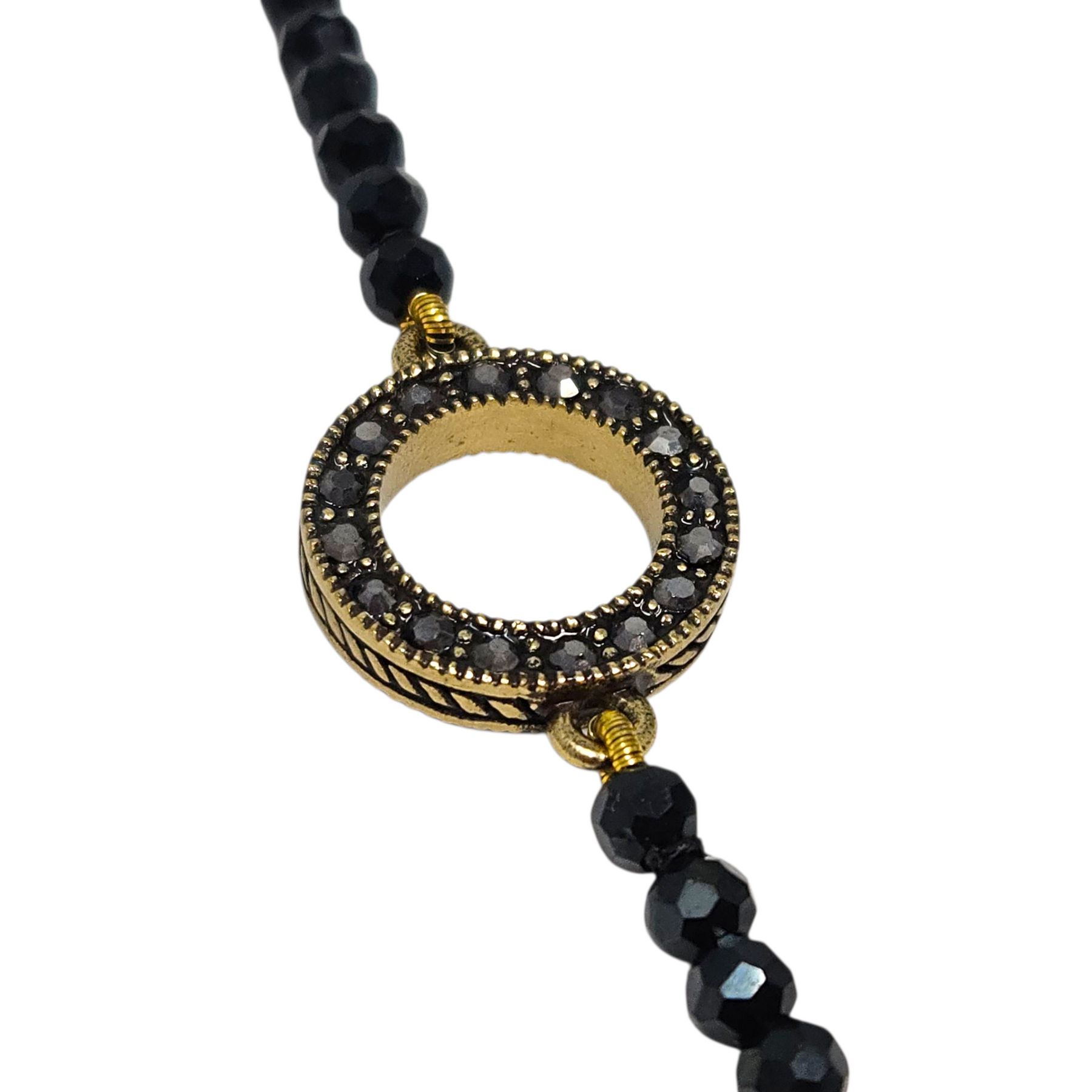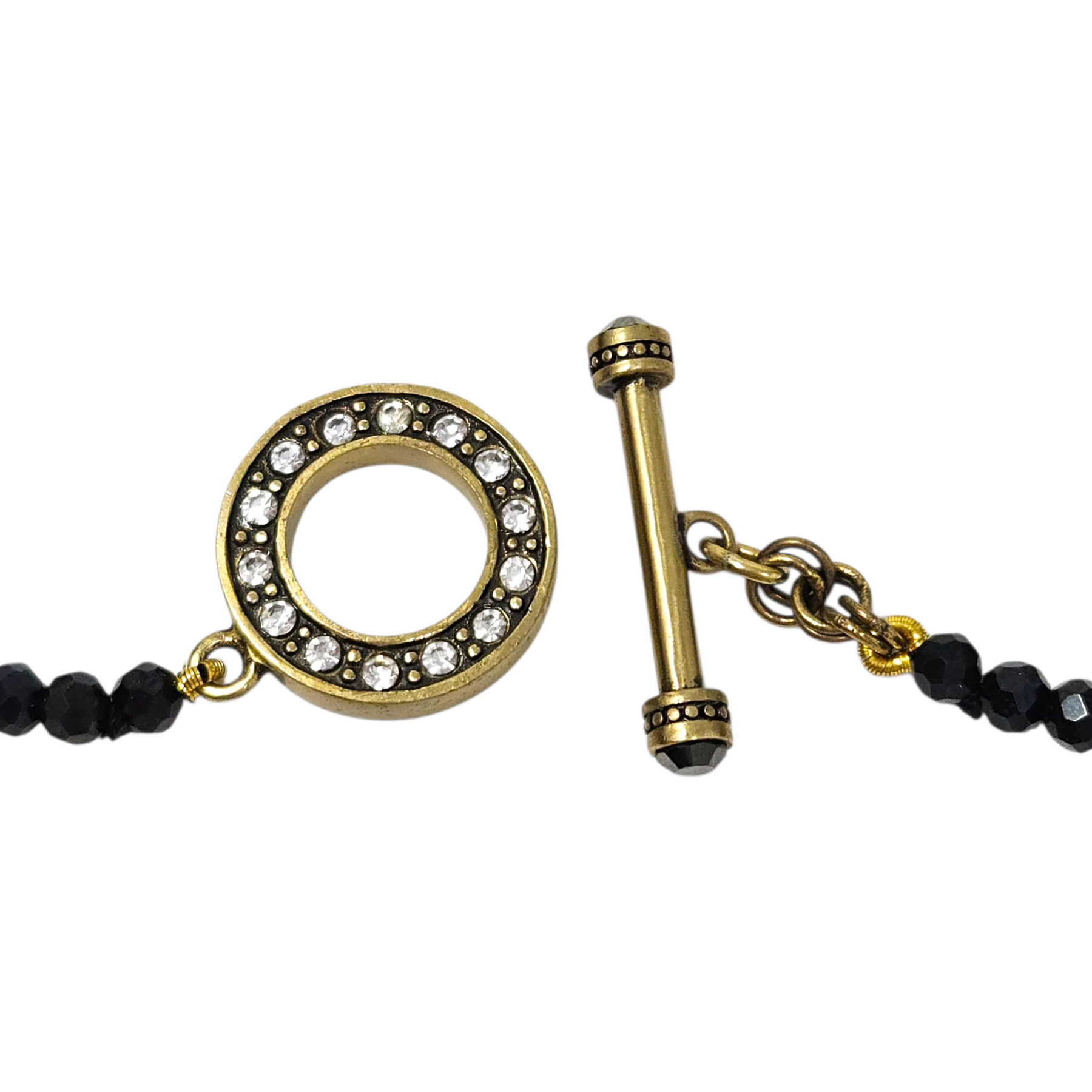 Materials: Black faceted crystal beads, bronze-tone plating over brass, with clear & grey crystal accents.