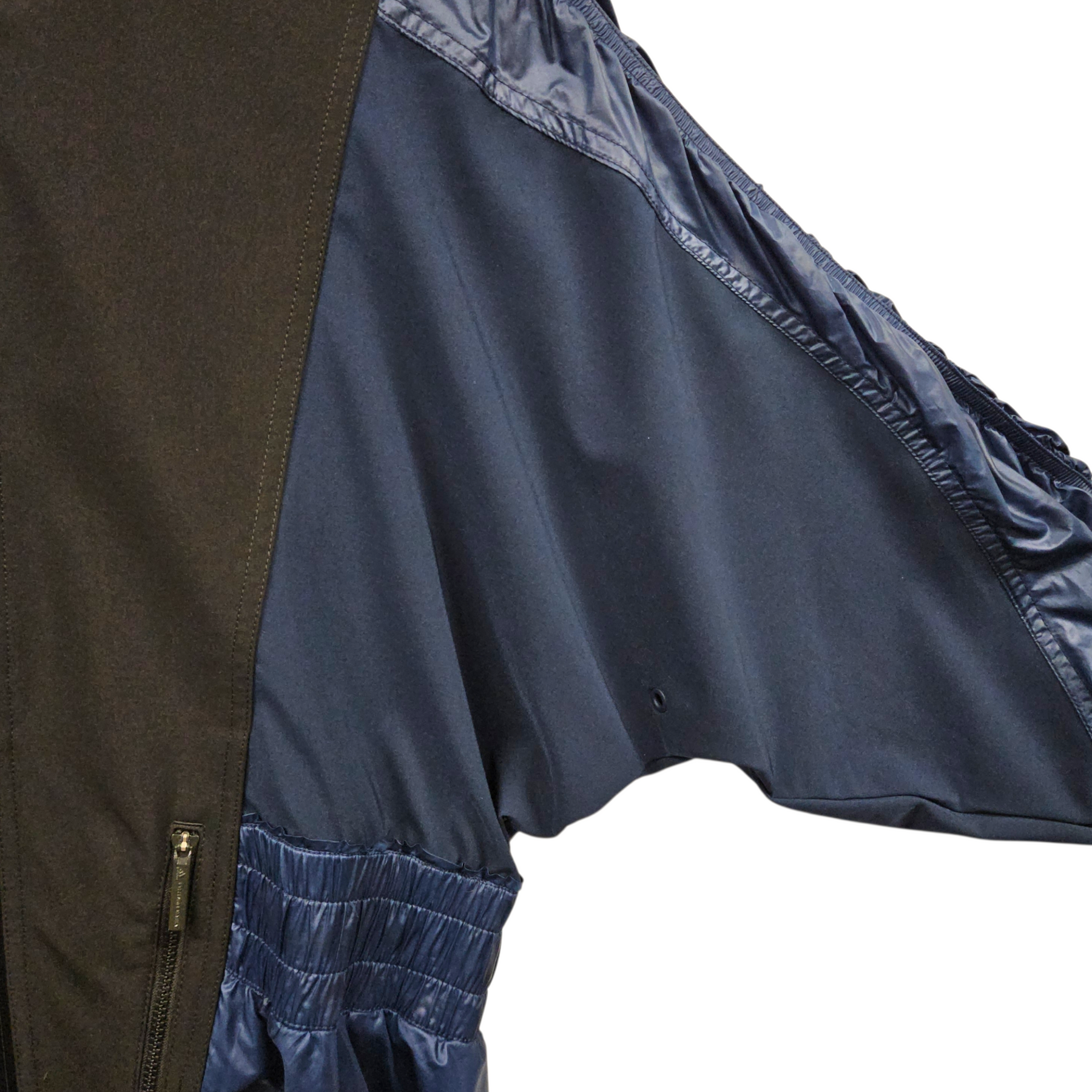 - Long, ruched, wing sleeves with underarm vents & thumb holes.