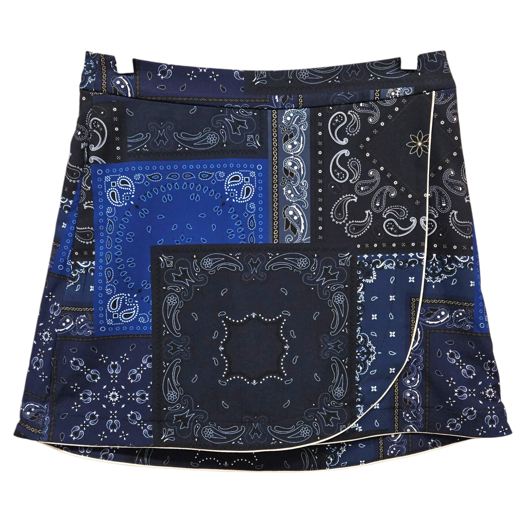 - Faux-wrap front with white piping trim.