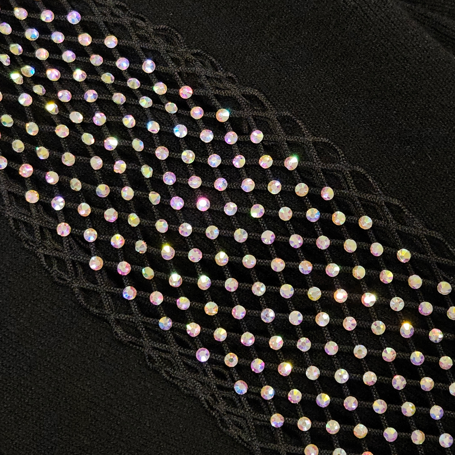Materials: Black 72% viscose rayon, 28% polyester, with iridescent crystals.