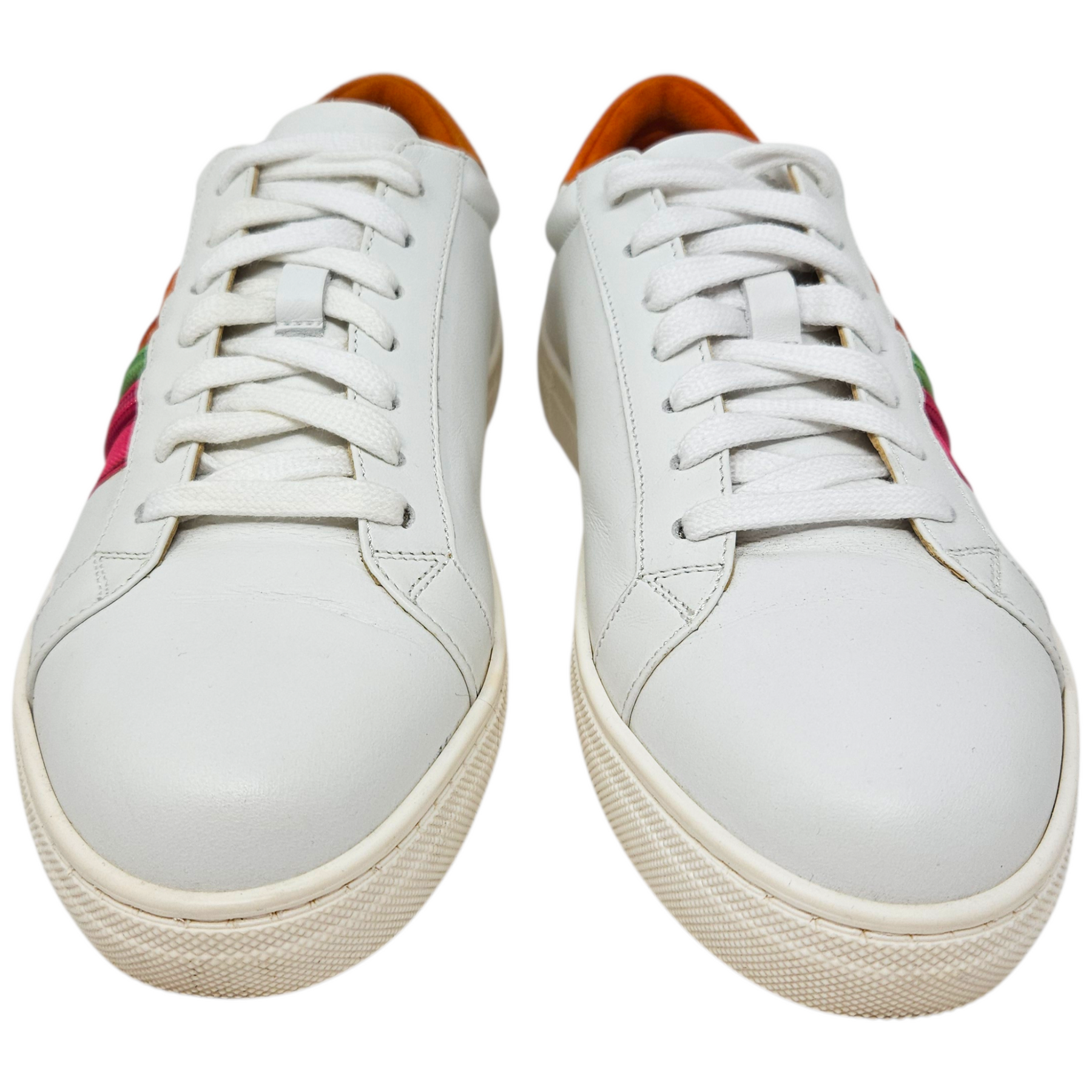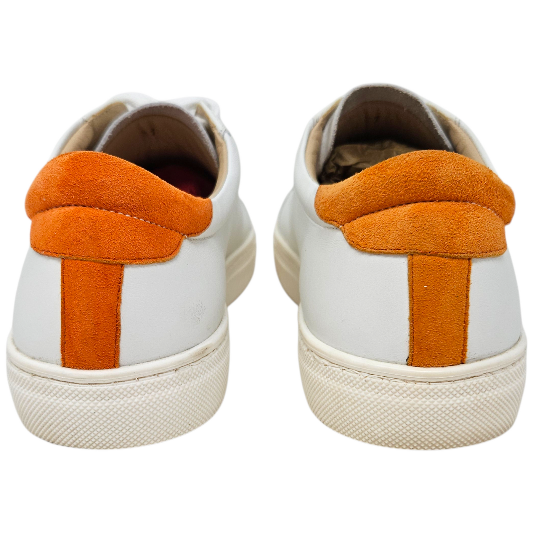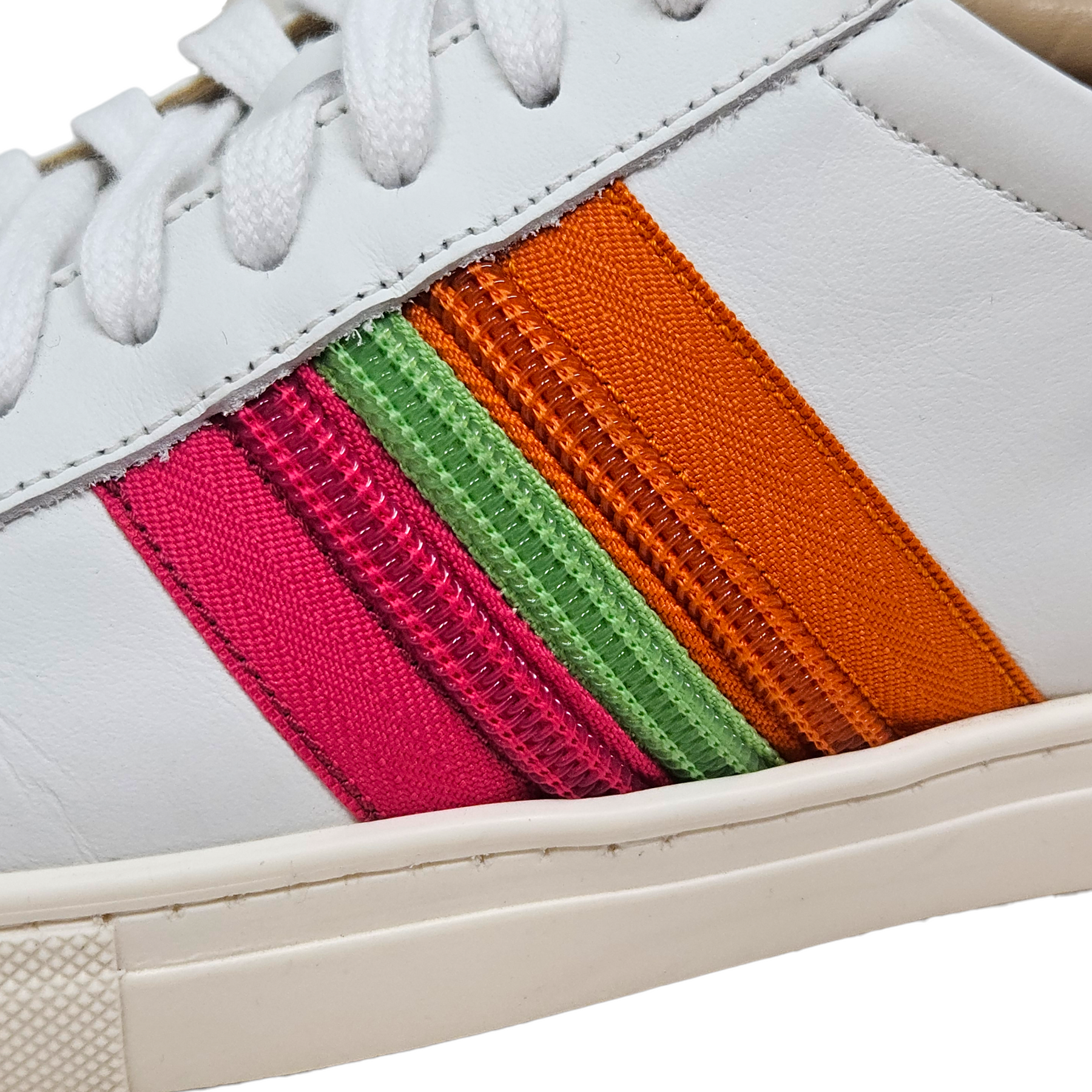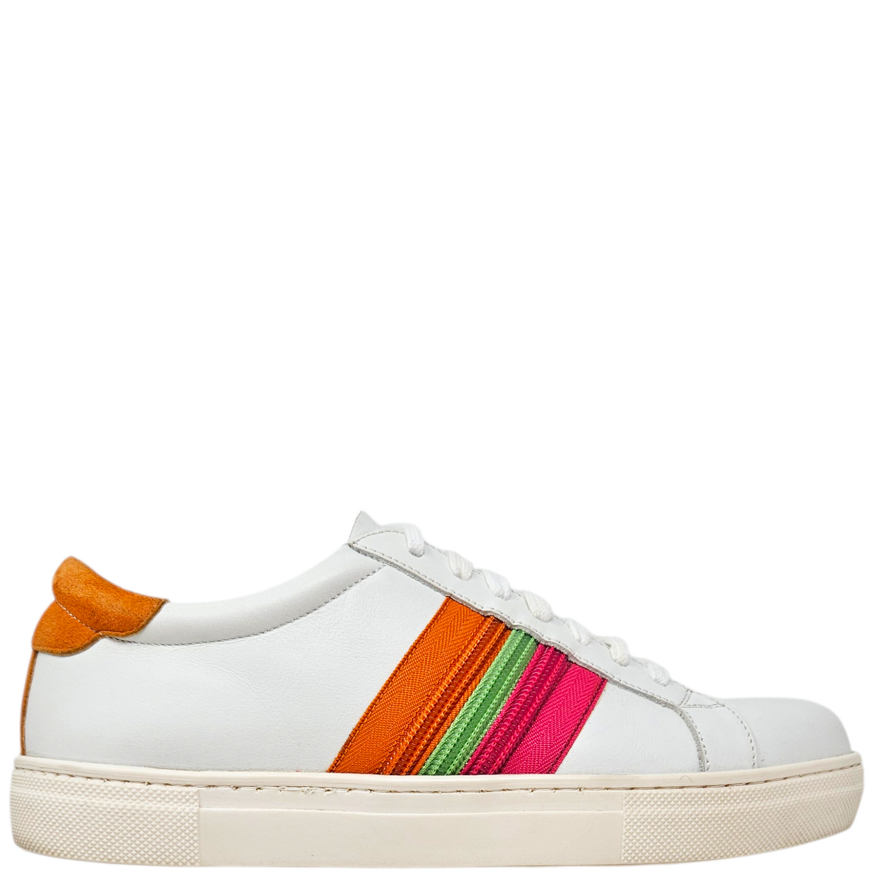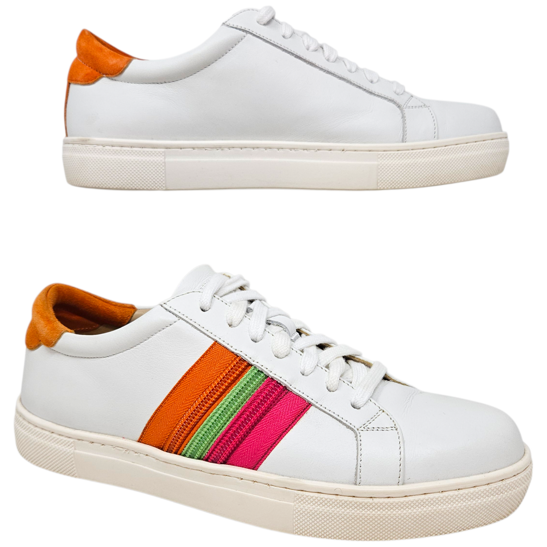 Materials: White smooth leather, orange suede, & orange, pink, & green zipper detail.