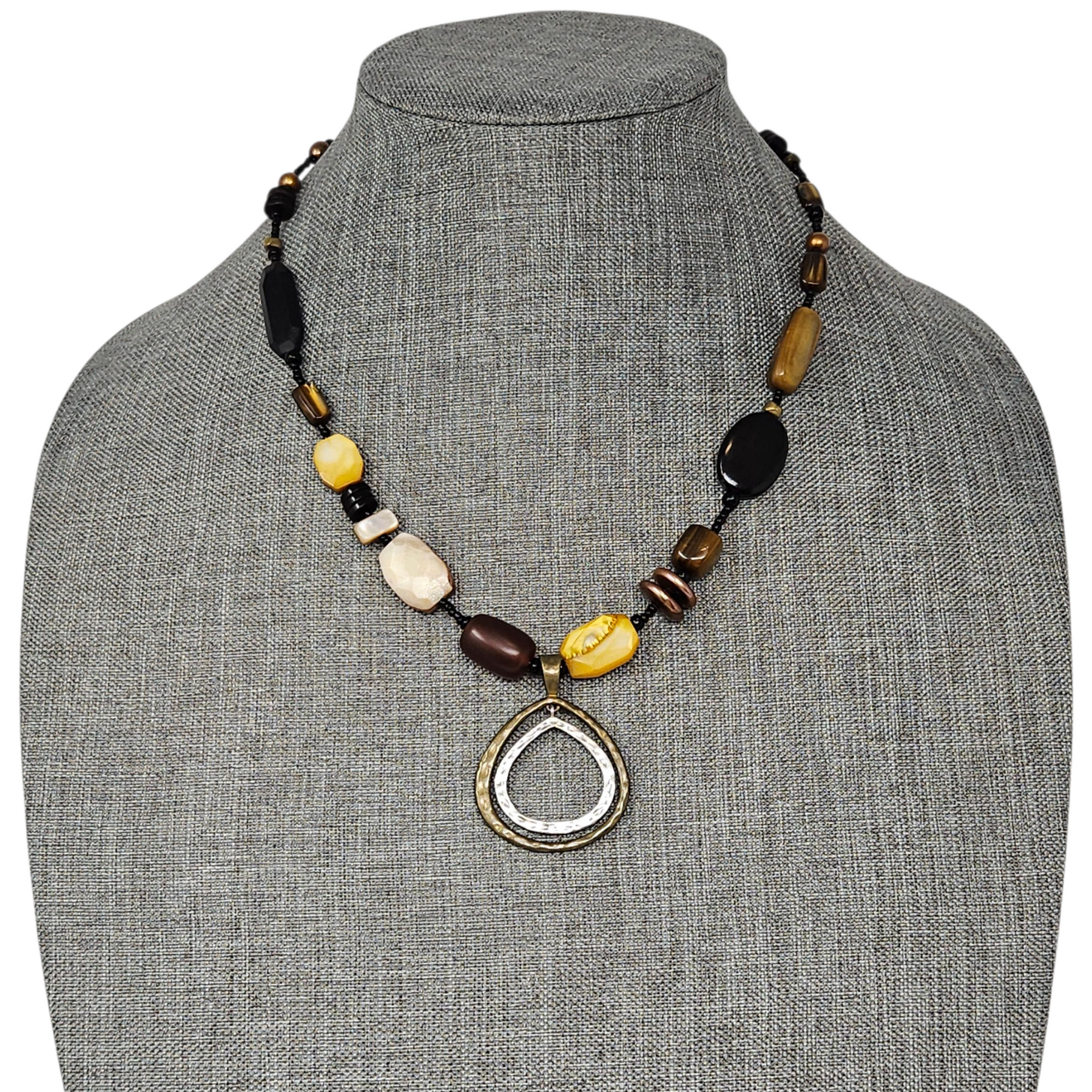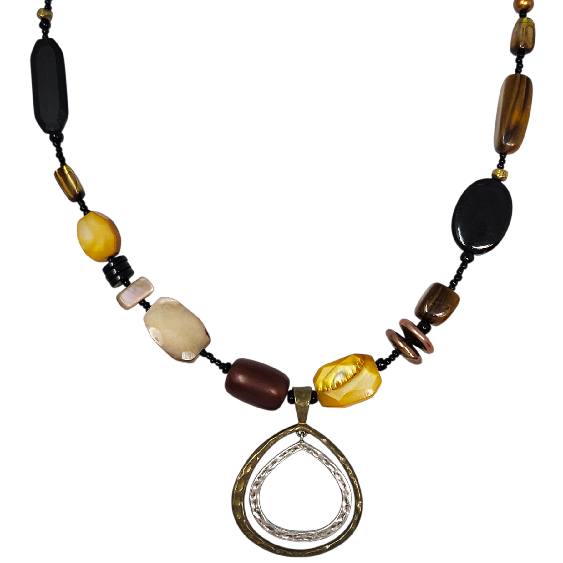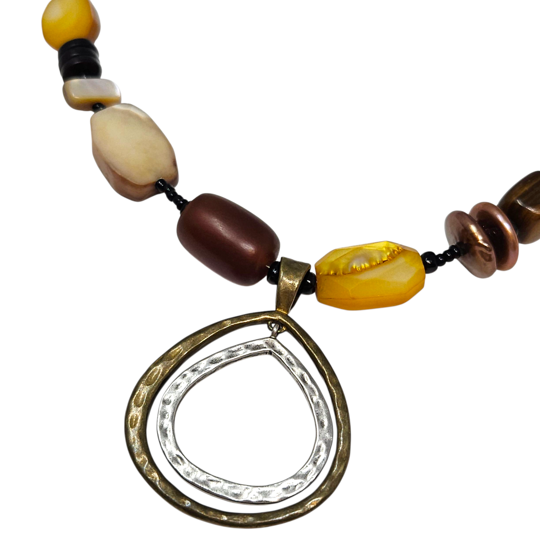 Materials: .925 sterling silver & brass with shell, synthetic horn, freshwater pearls, & glass beads.
