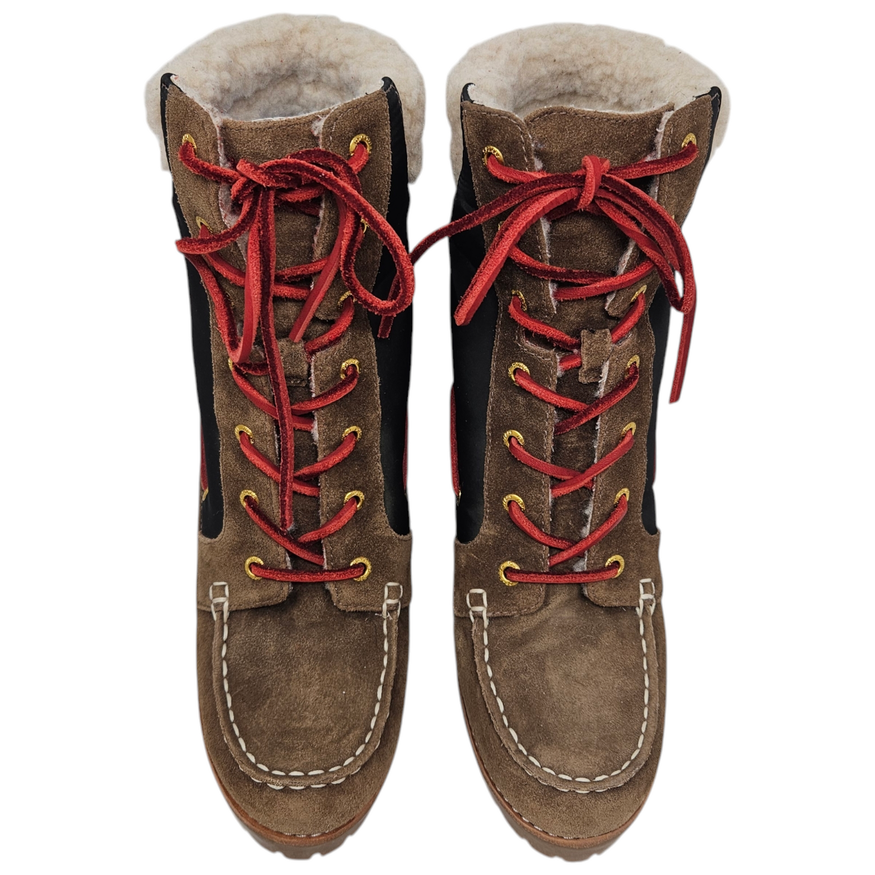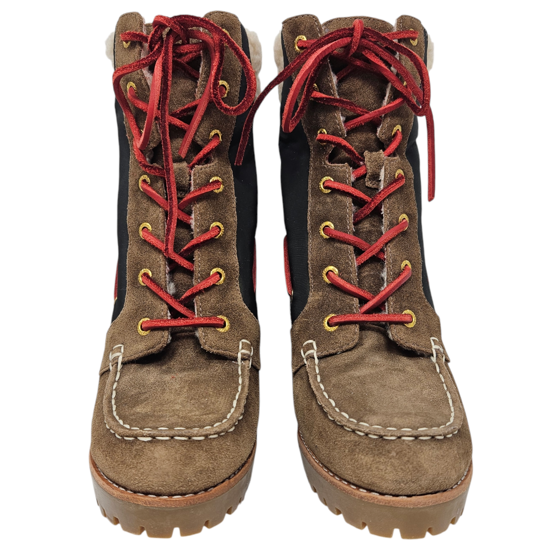 Materials: Brown suede, black nylon, red leather laces, and gold-tone hardware.