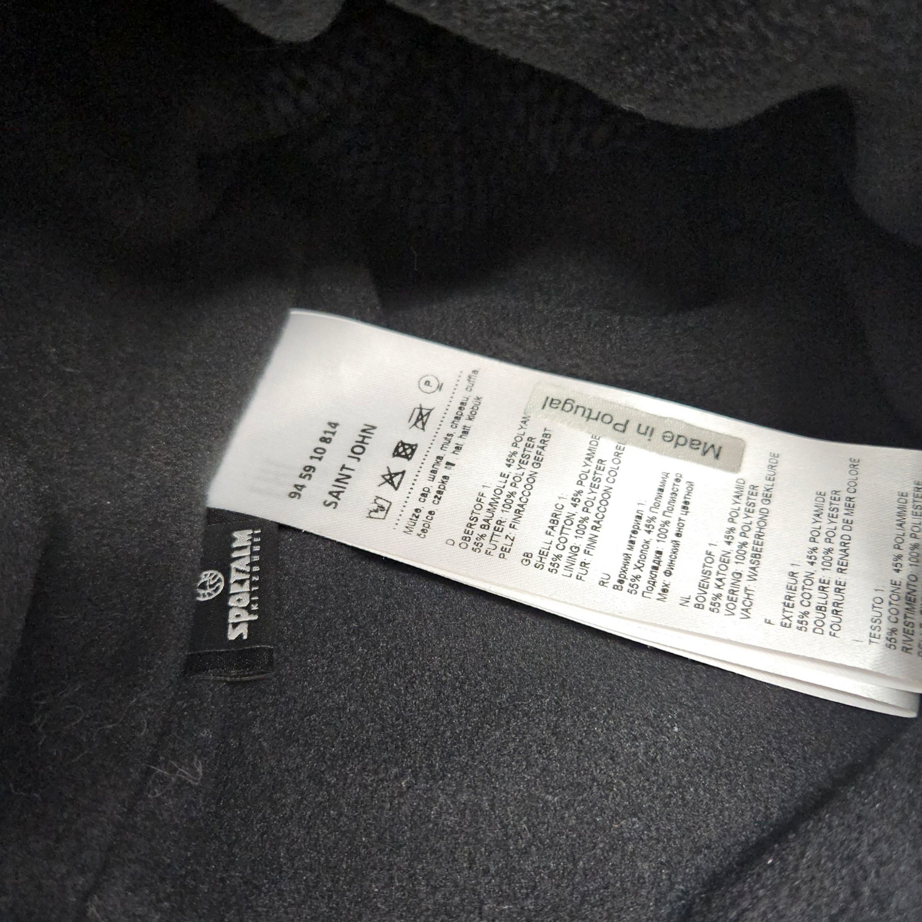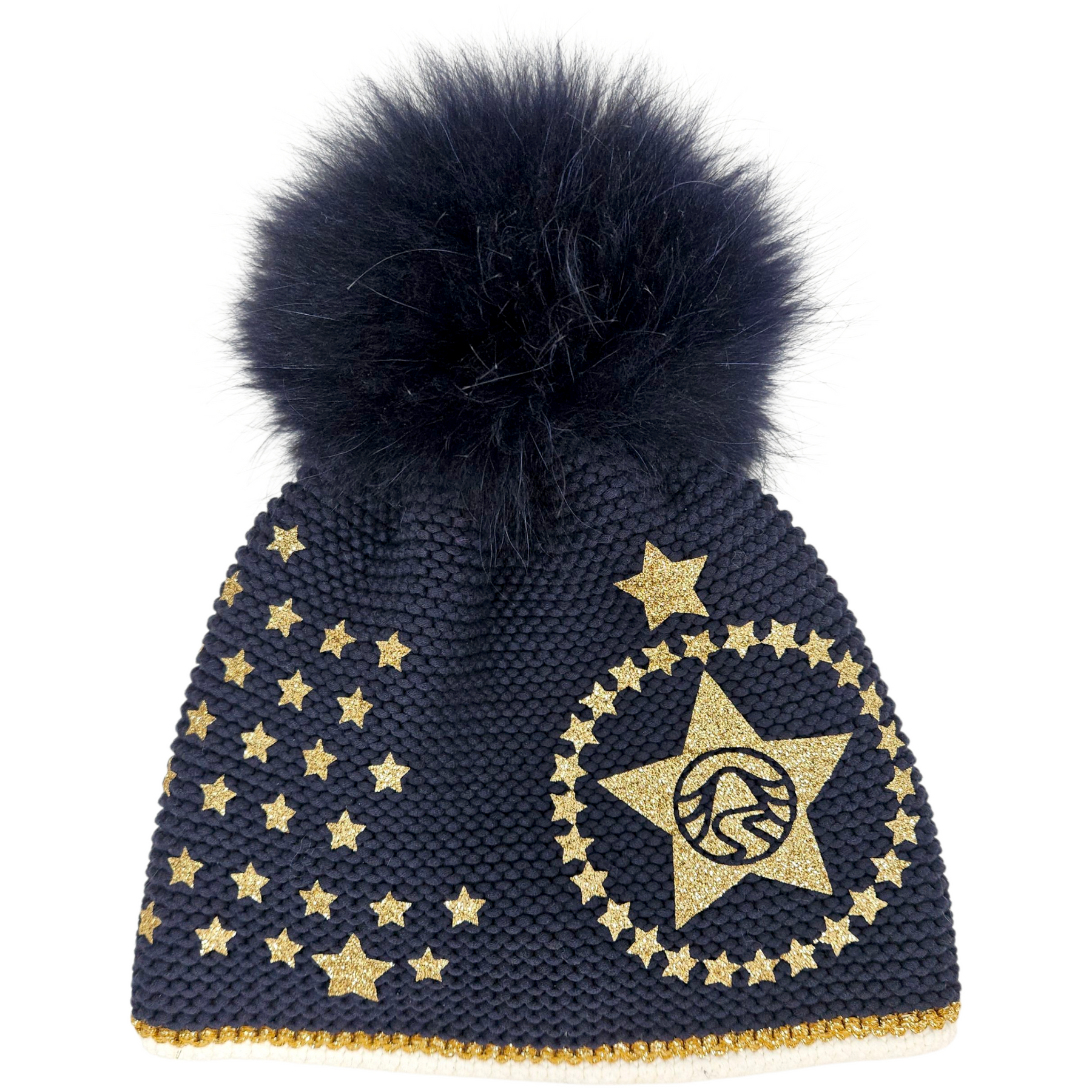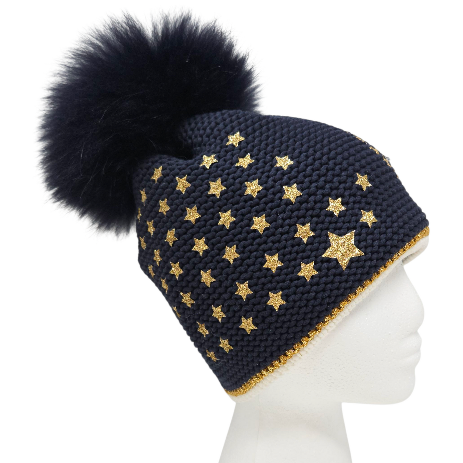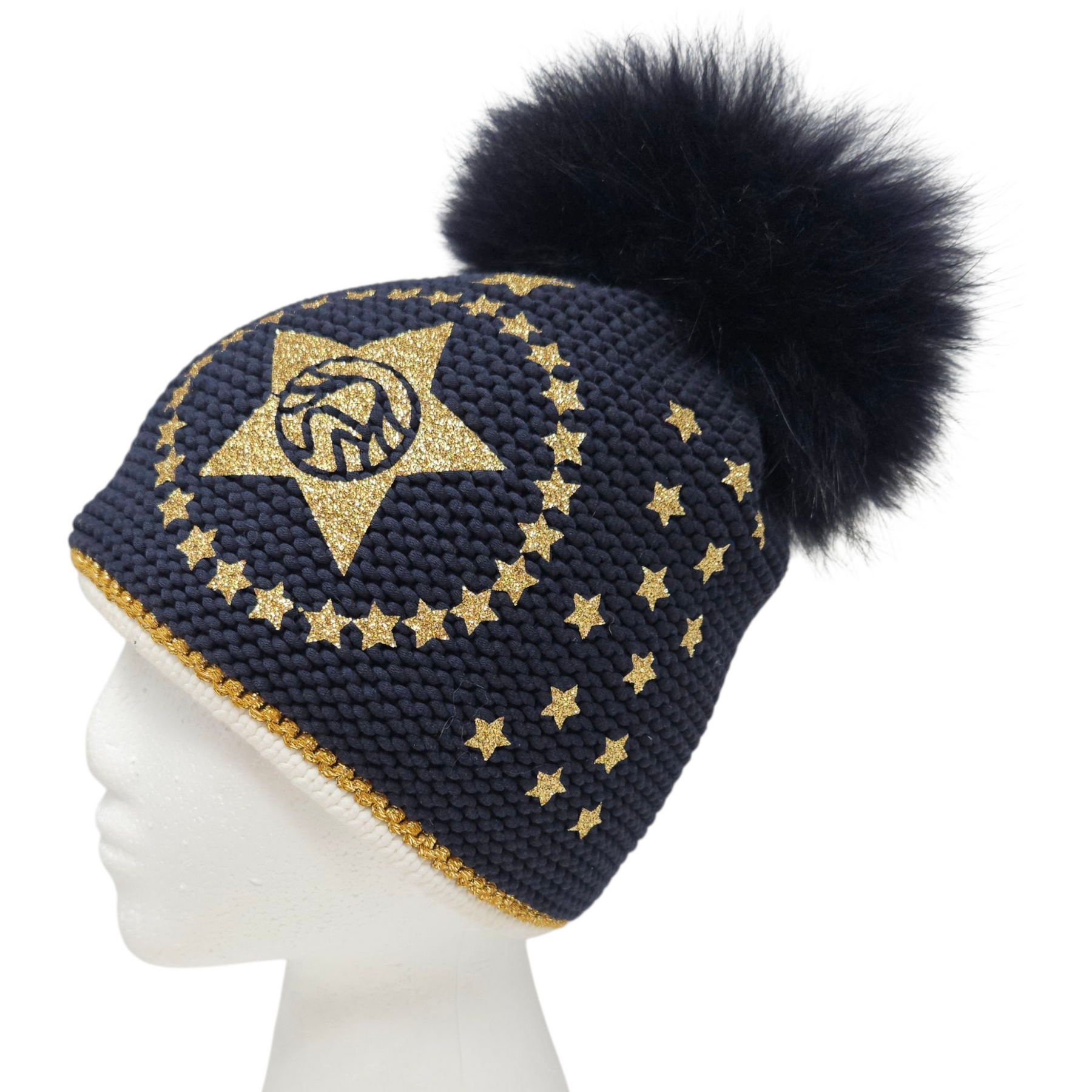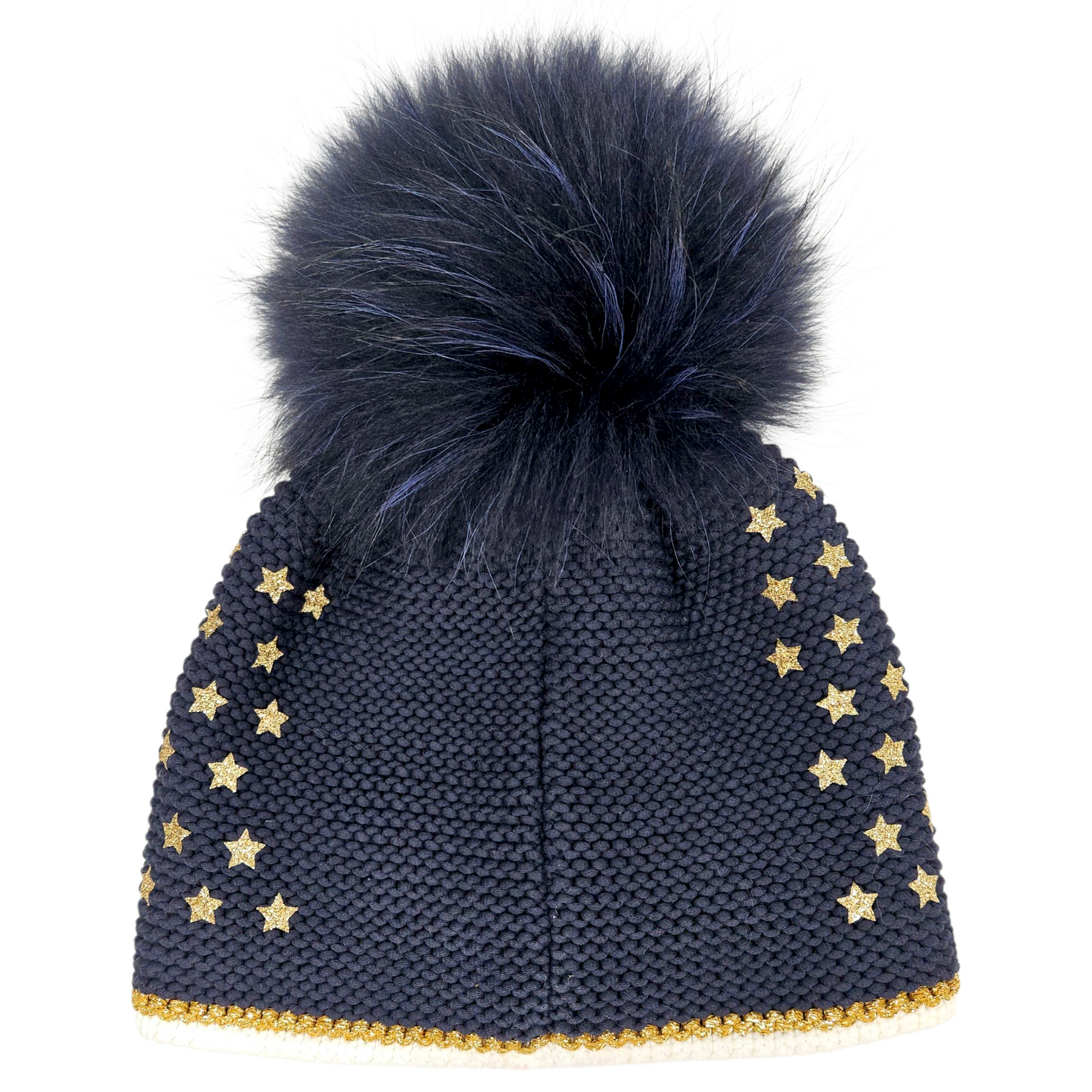 Materials: Navy, gold, & white 55% cotton, 45% polyamide, with dyed racoon-fur pom.