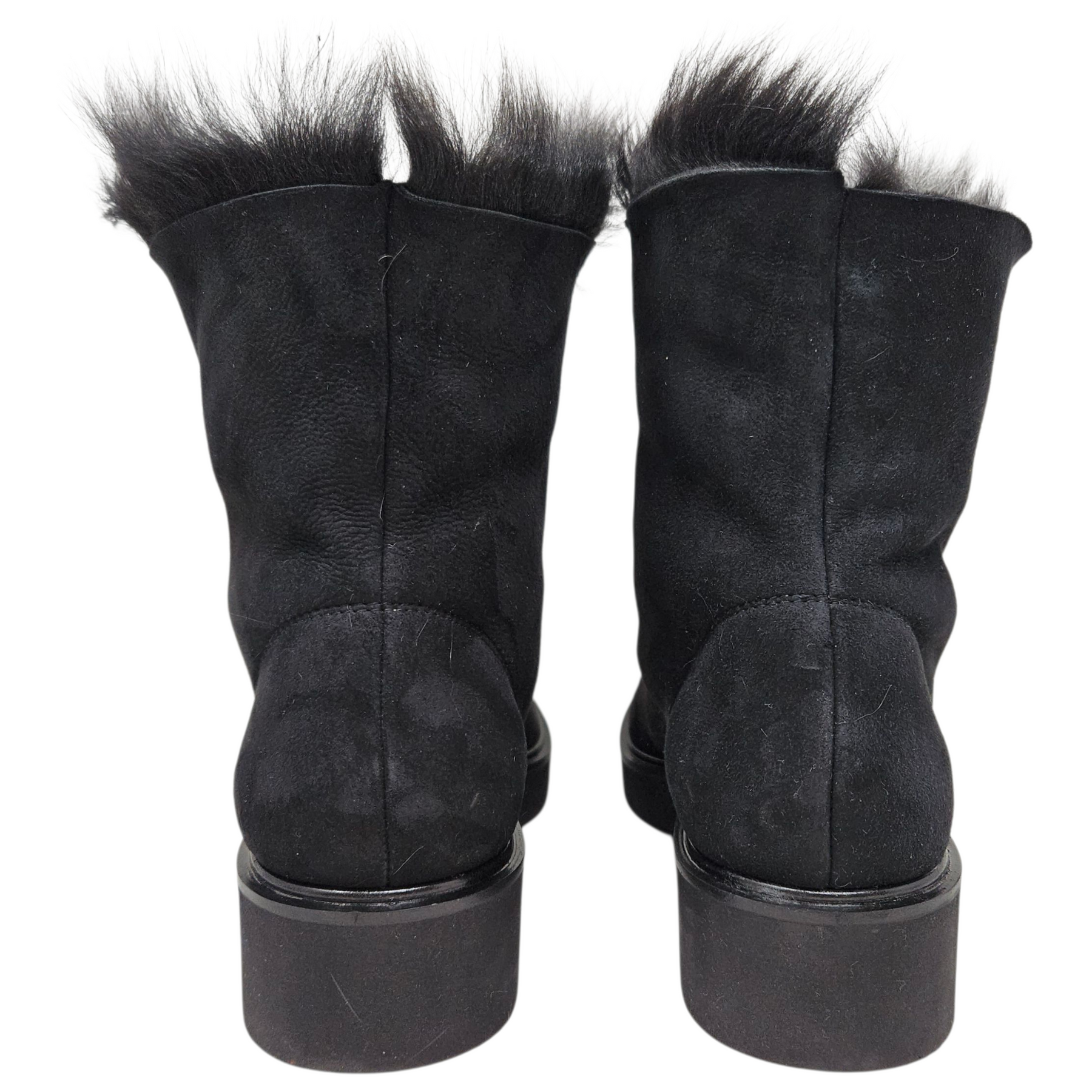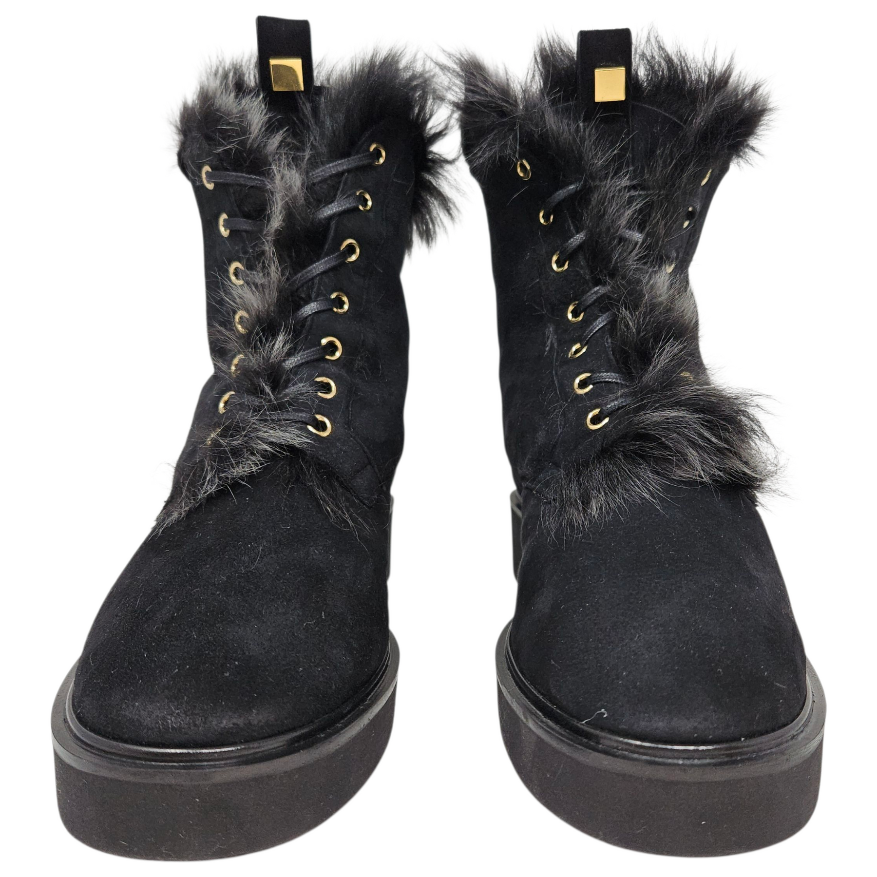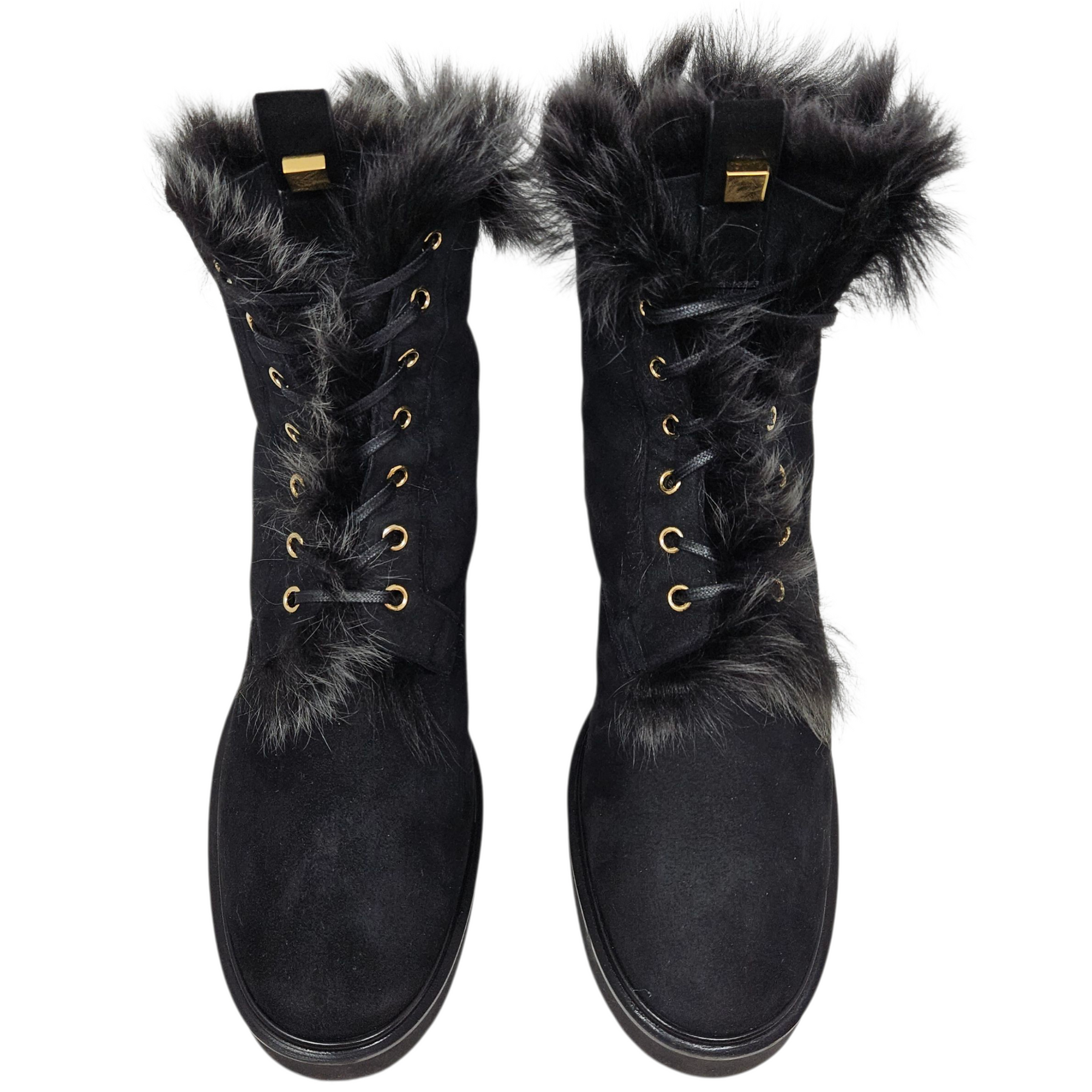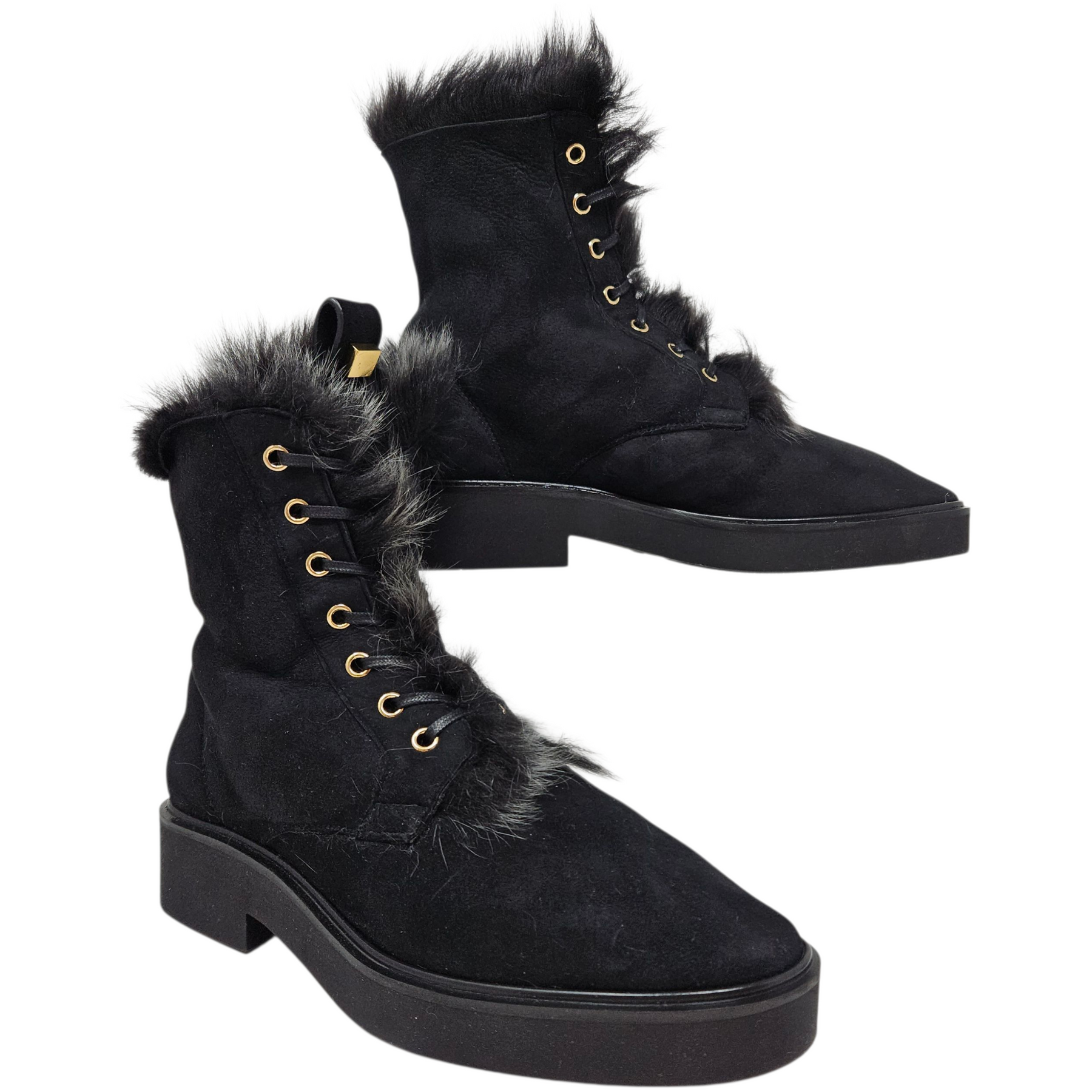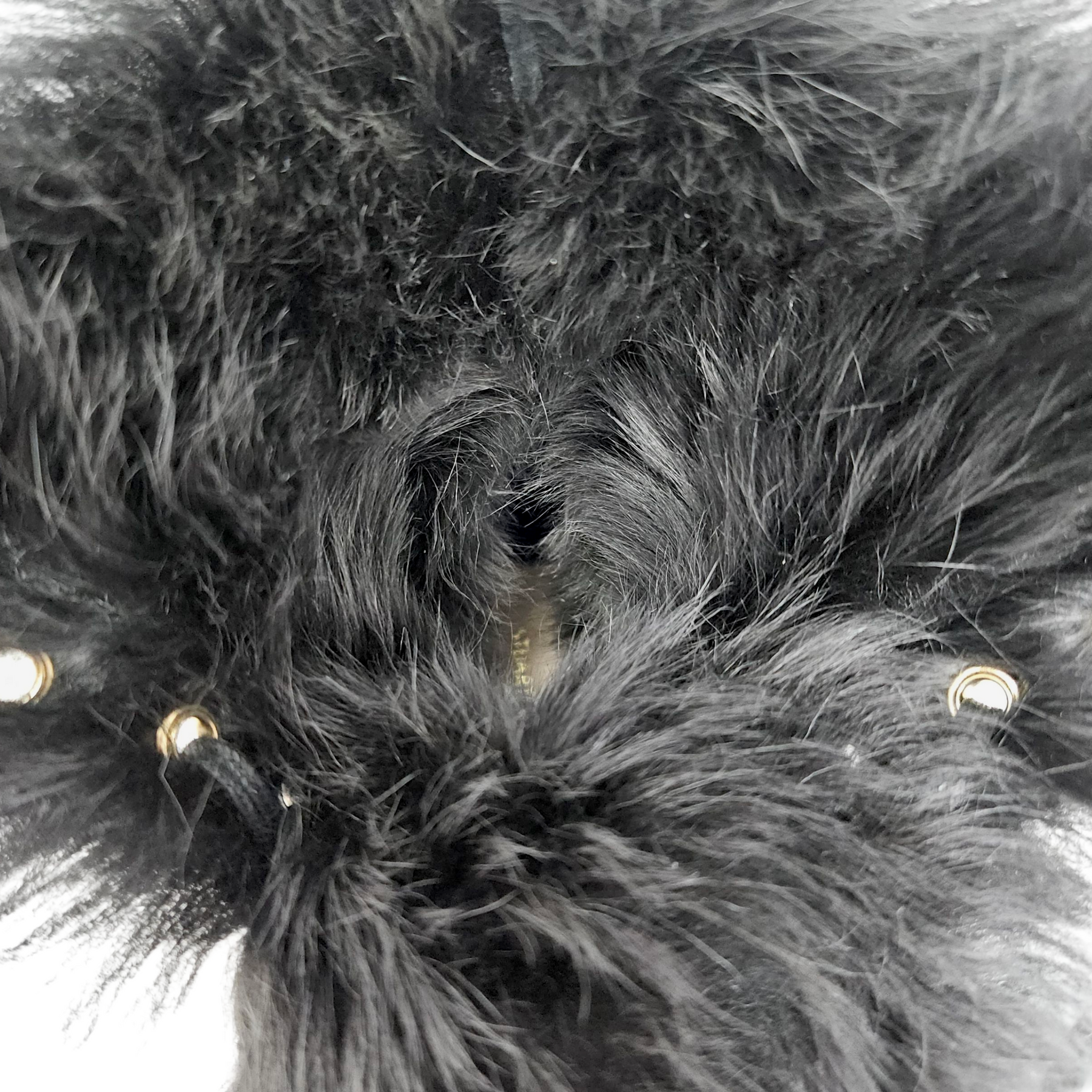 Materials: Black suede with lambs fur trim, and gold-tone hardware.