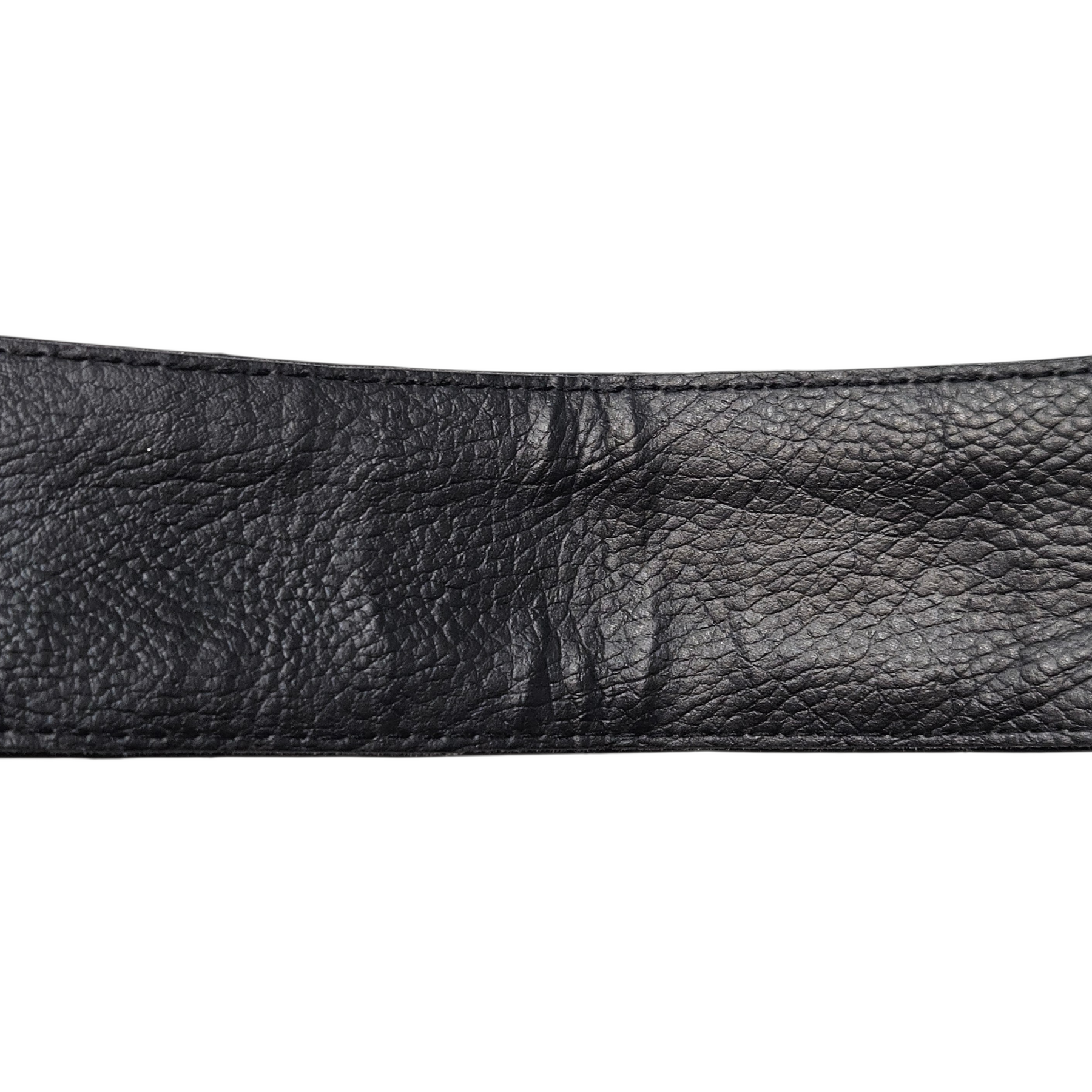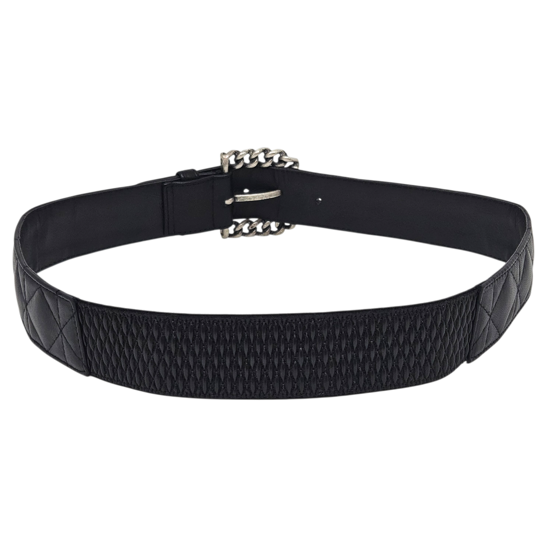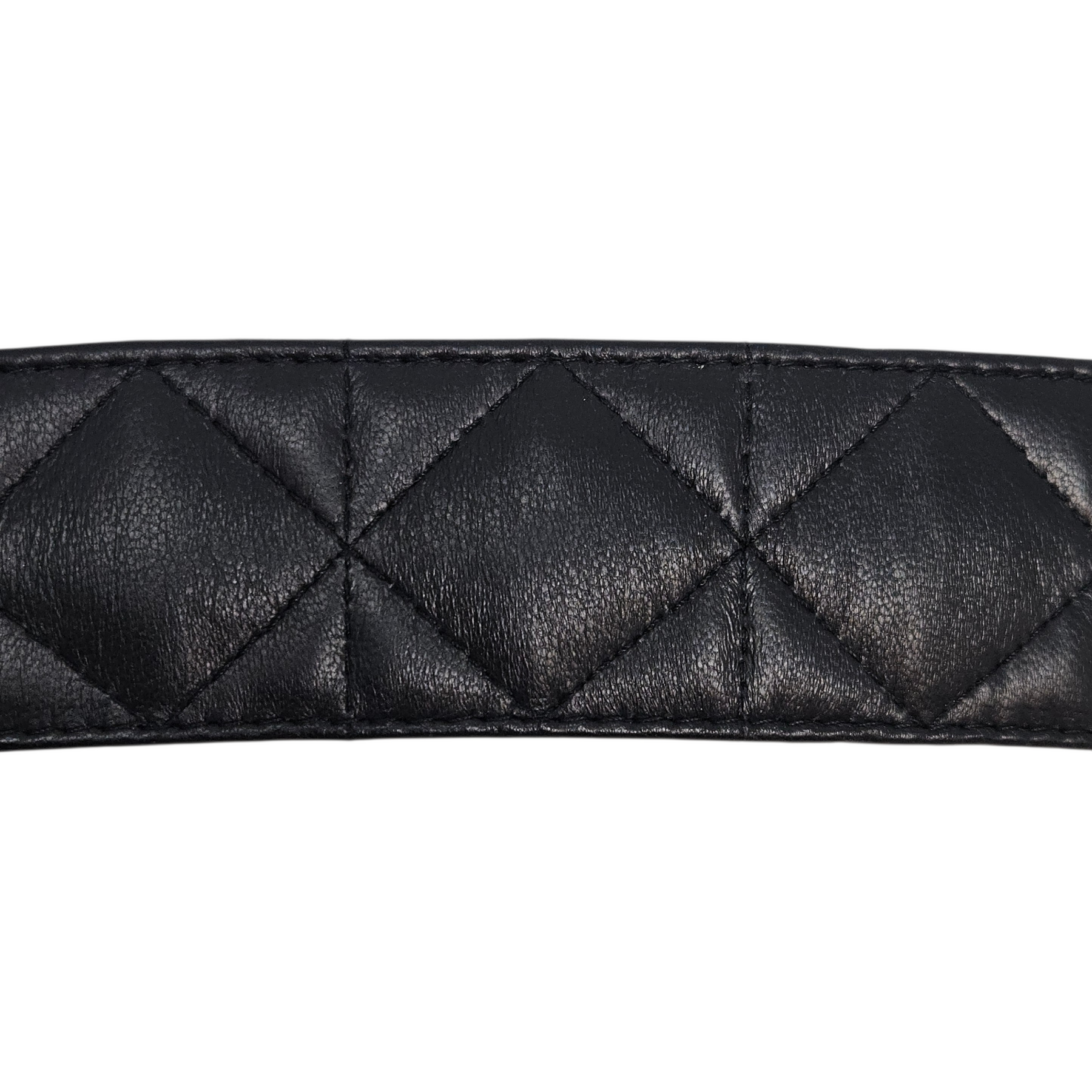 Materials: Black quilted leather with antiqued silver-tone buckle.
