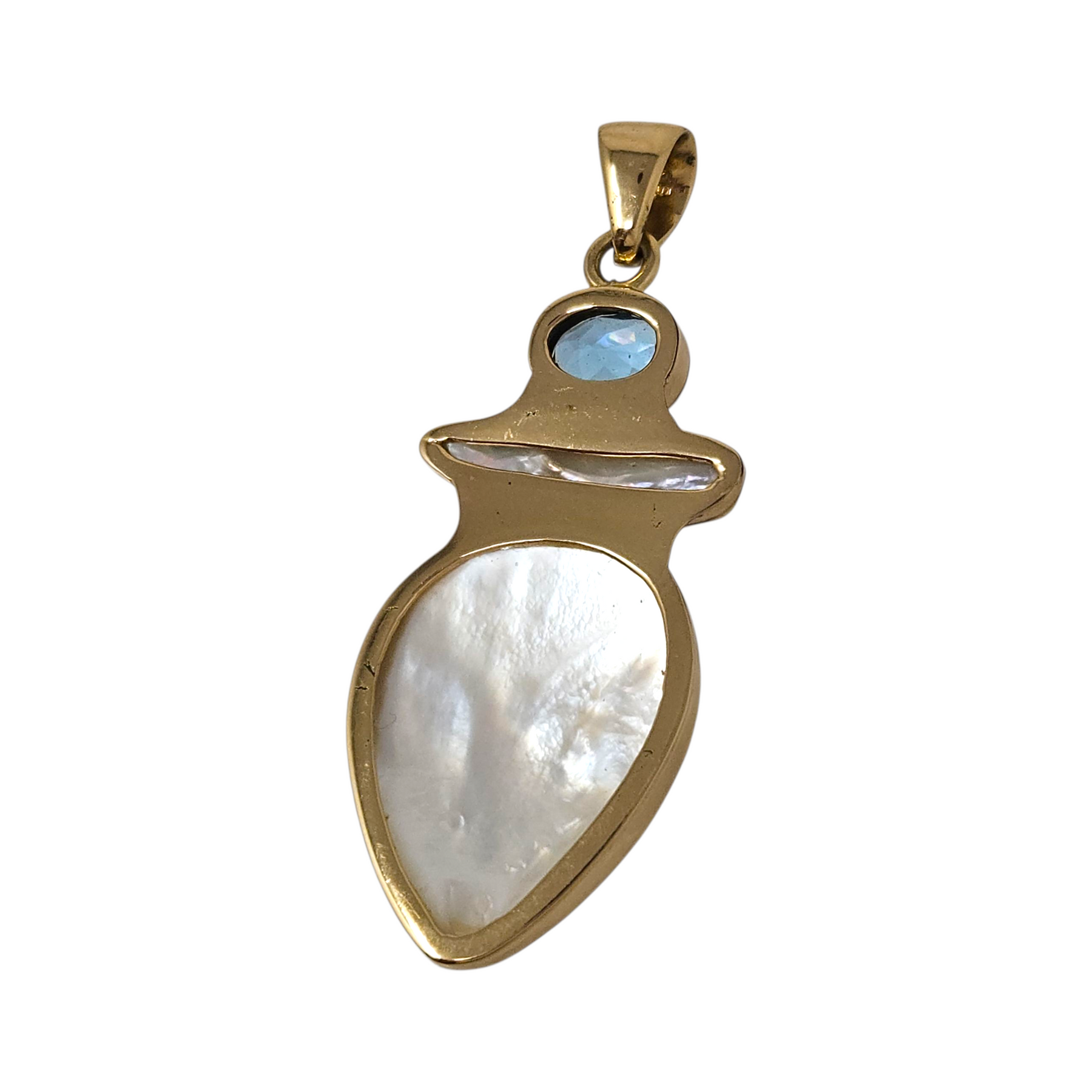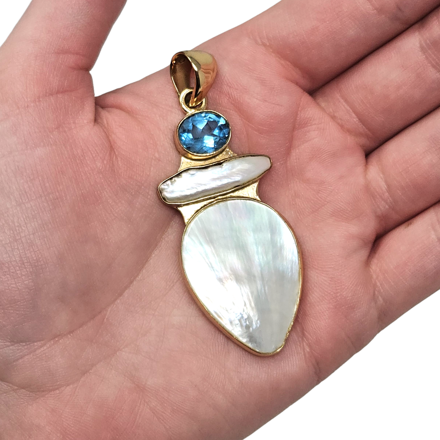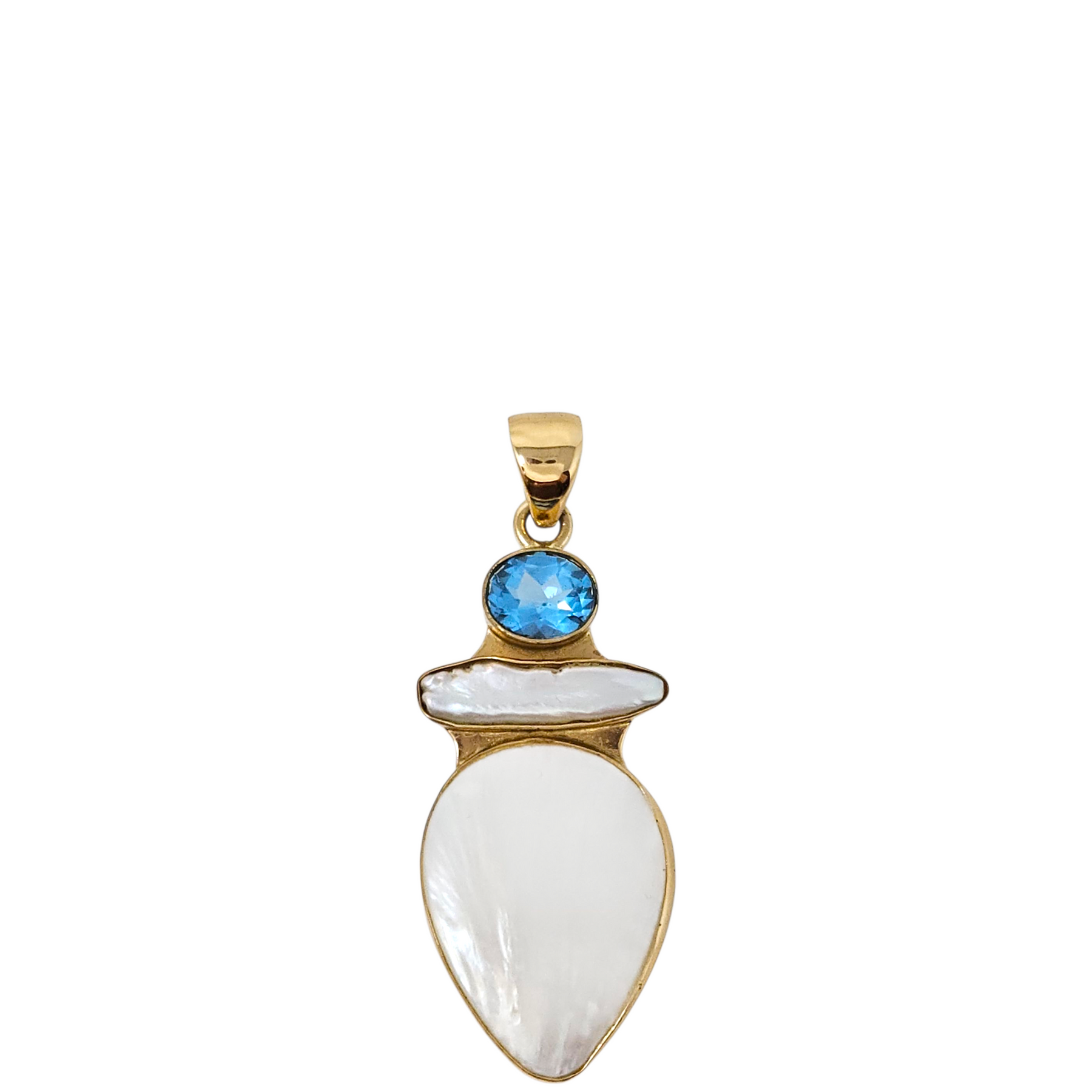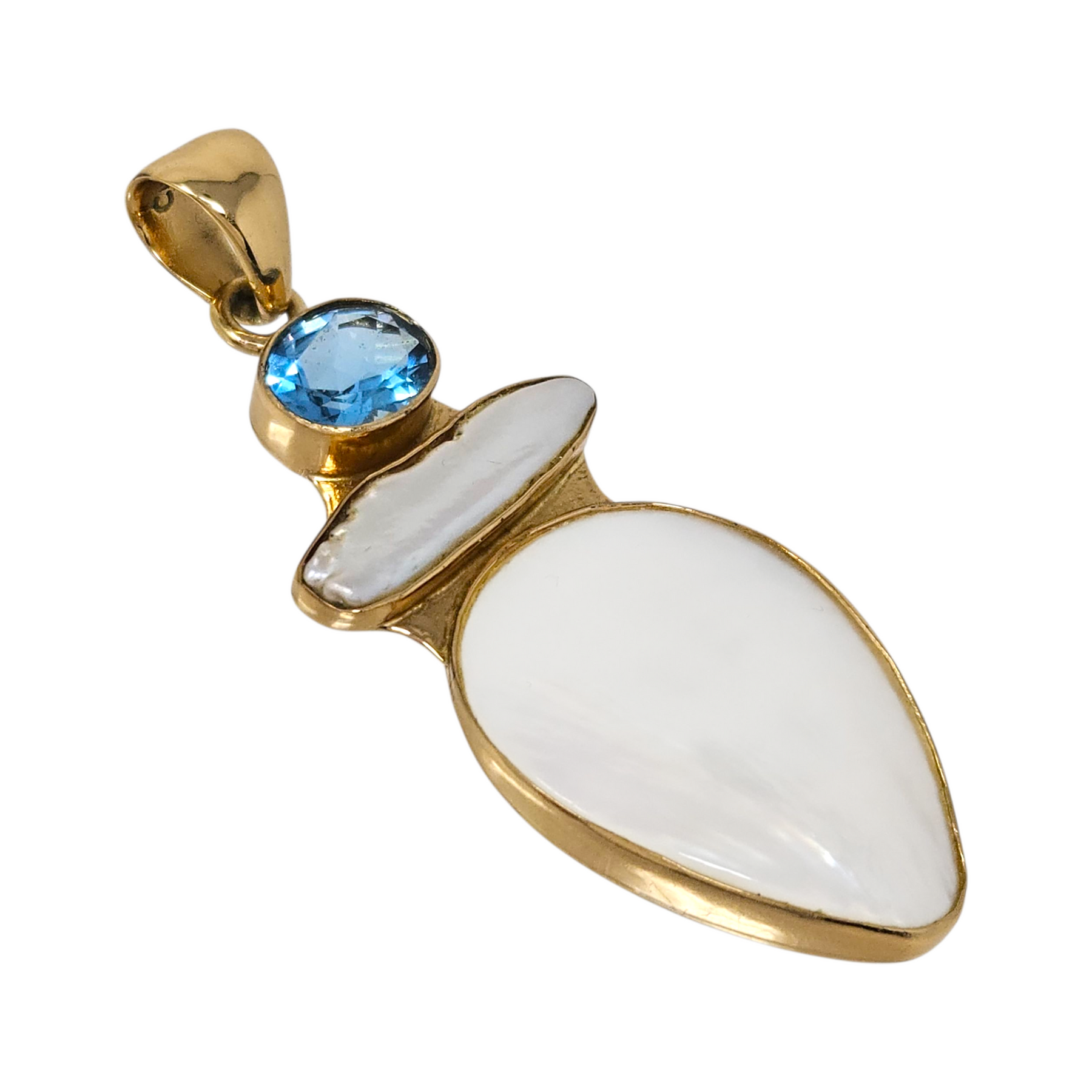 Materials: Mother-of-pearl, keshi pearl, & blue topaz, set in gold-tone hardware.