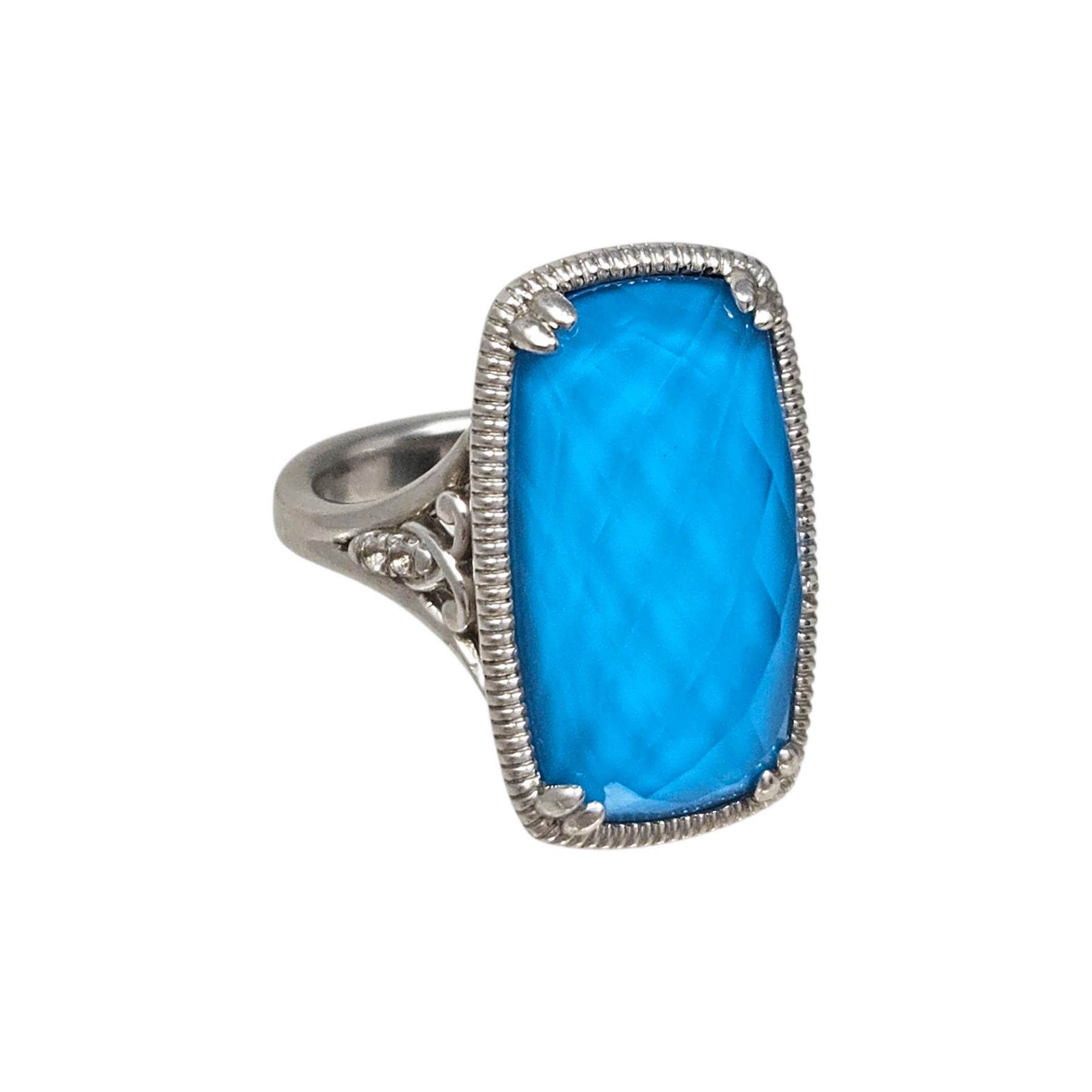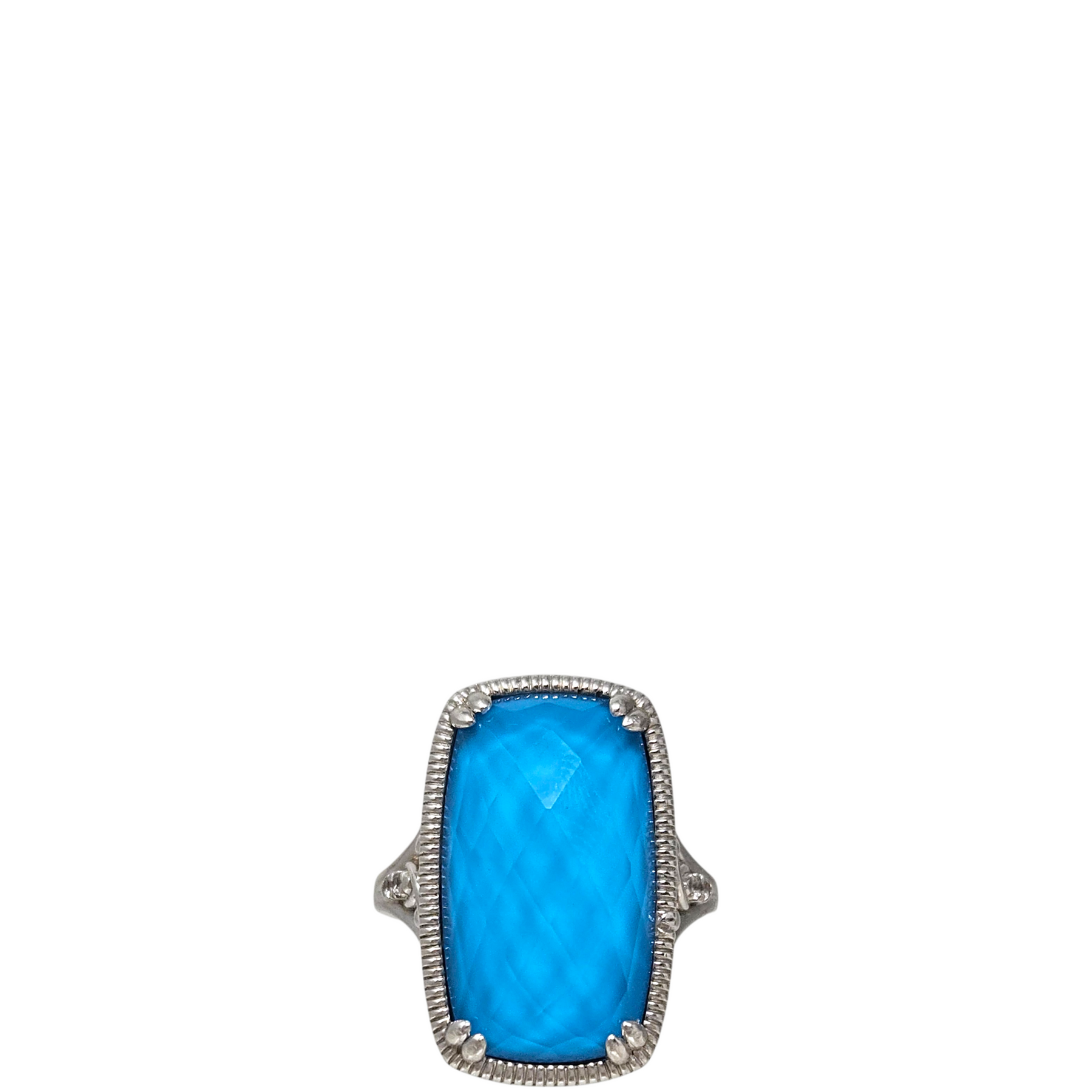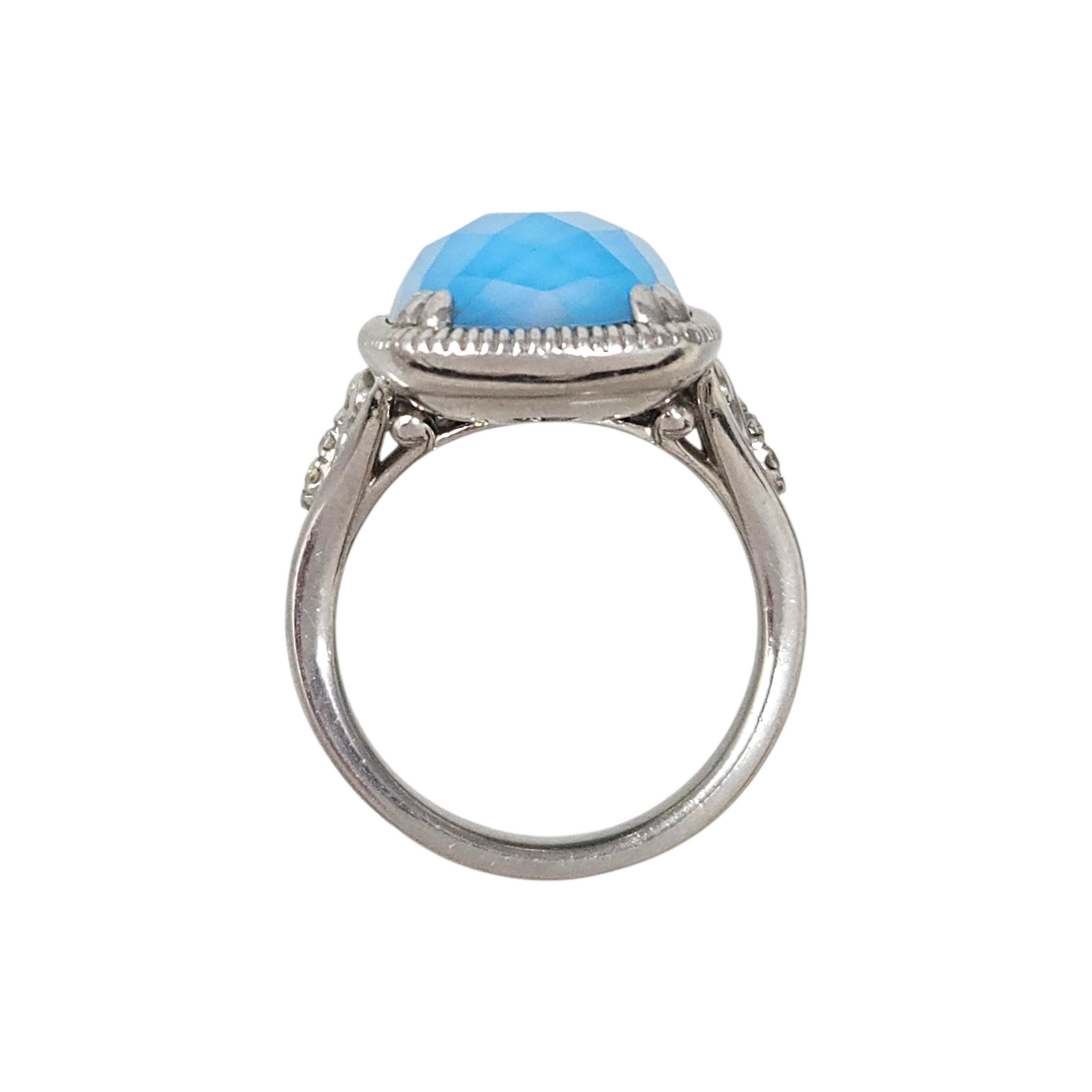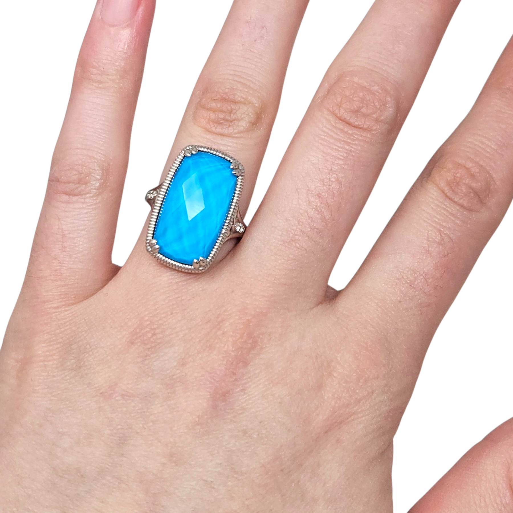 Materials: .925 sterling silver with a large faceted rock-crystal turquoise stone & Bujukan white sapphire accents.