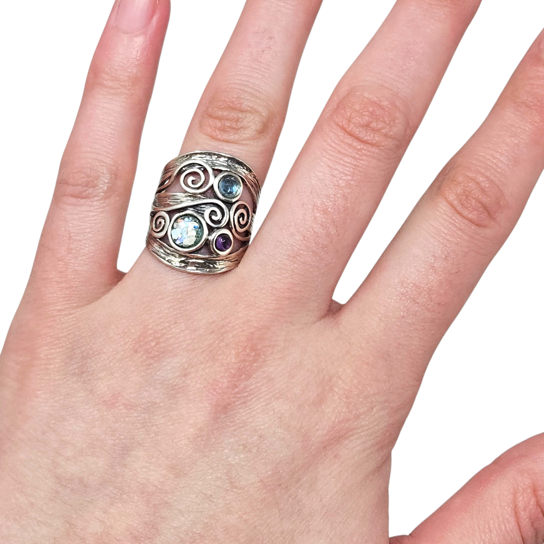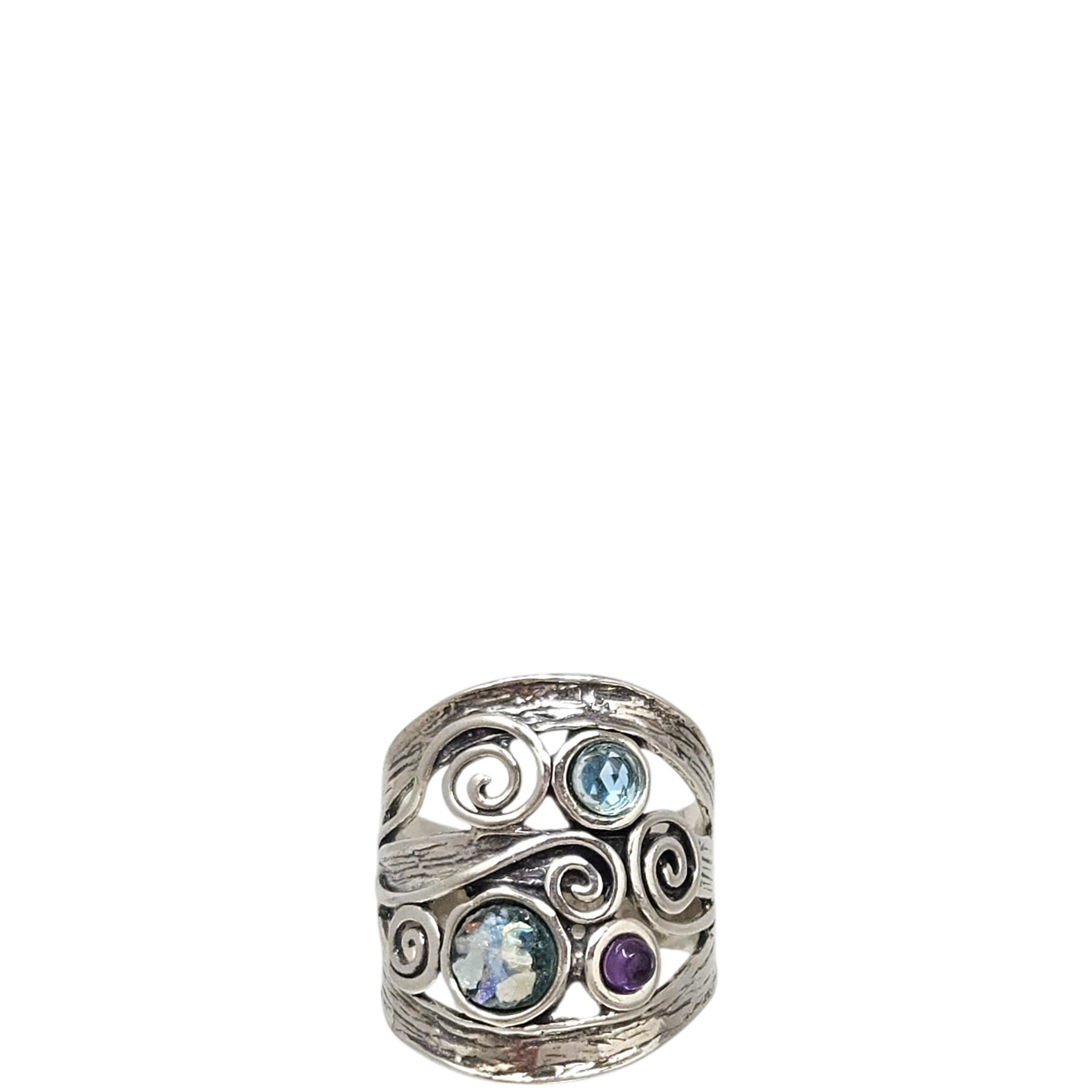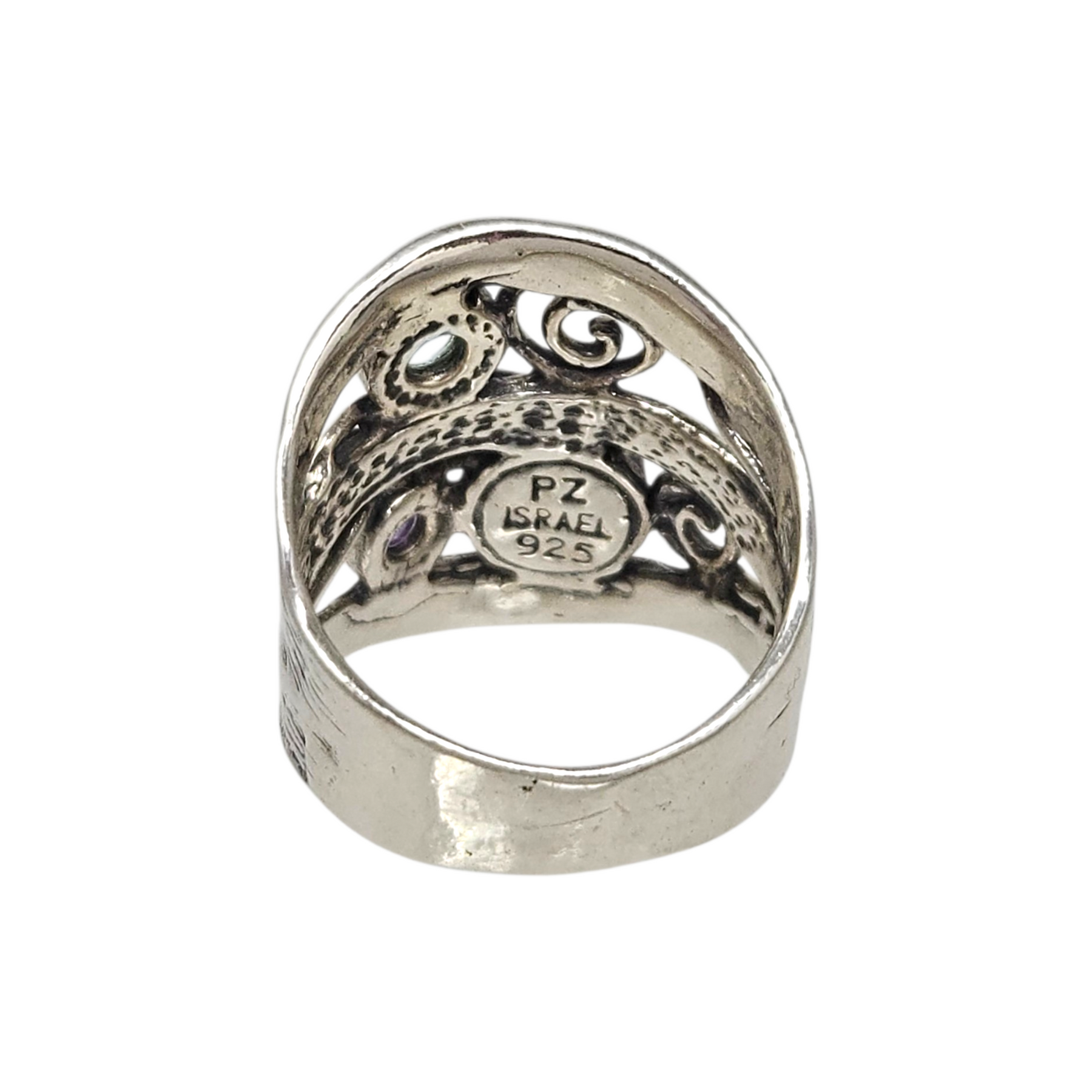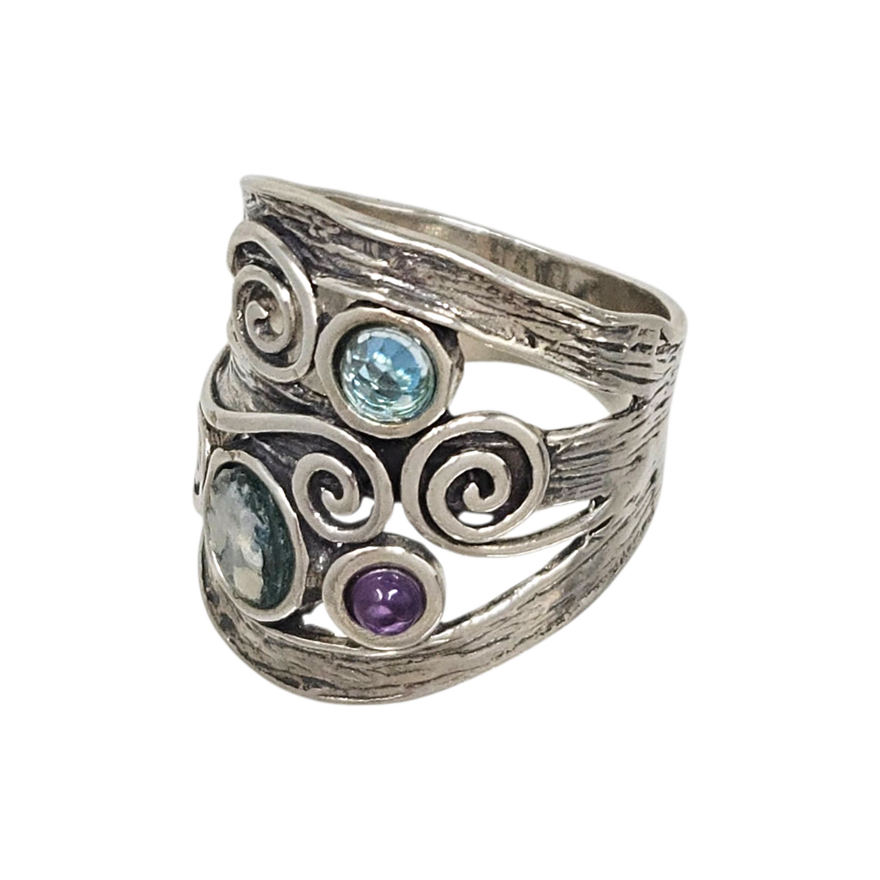 Materials: .925 sterling silver with cutout swirls & three natural stones in blues & purple.