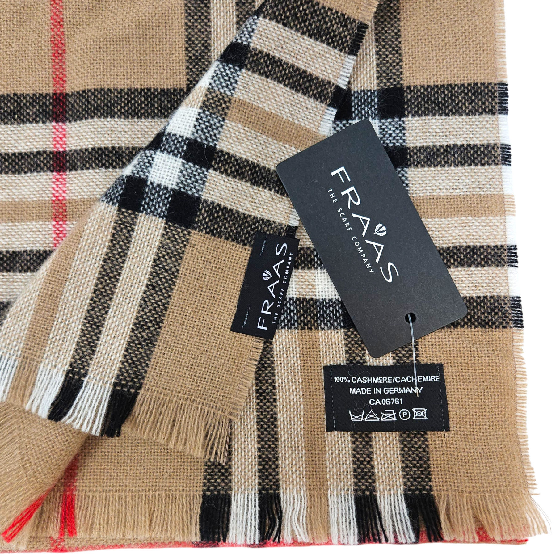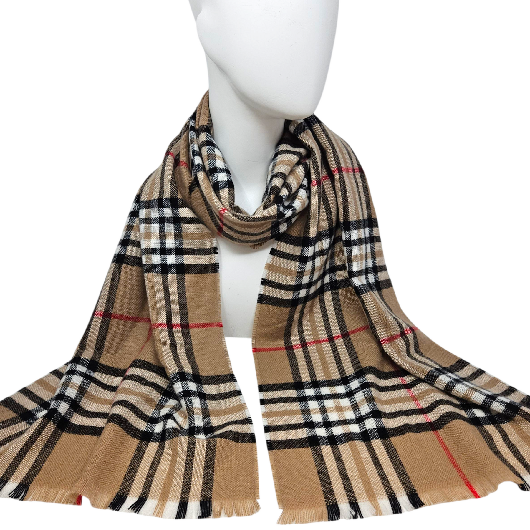 Materials: Beige, black, & red 100% cashmere.
