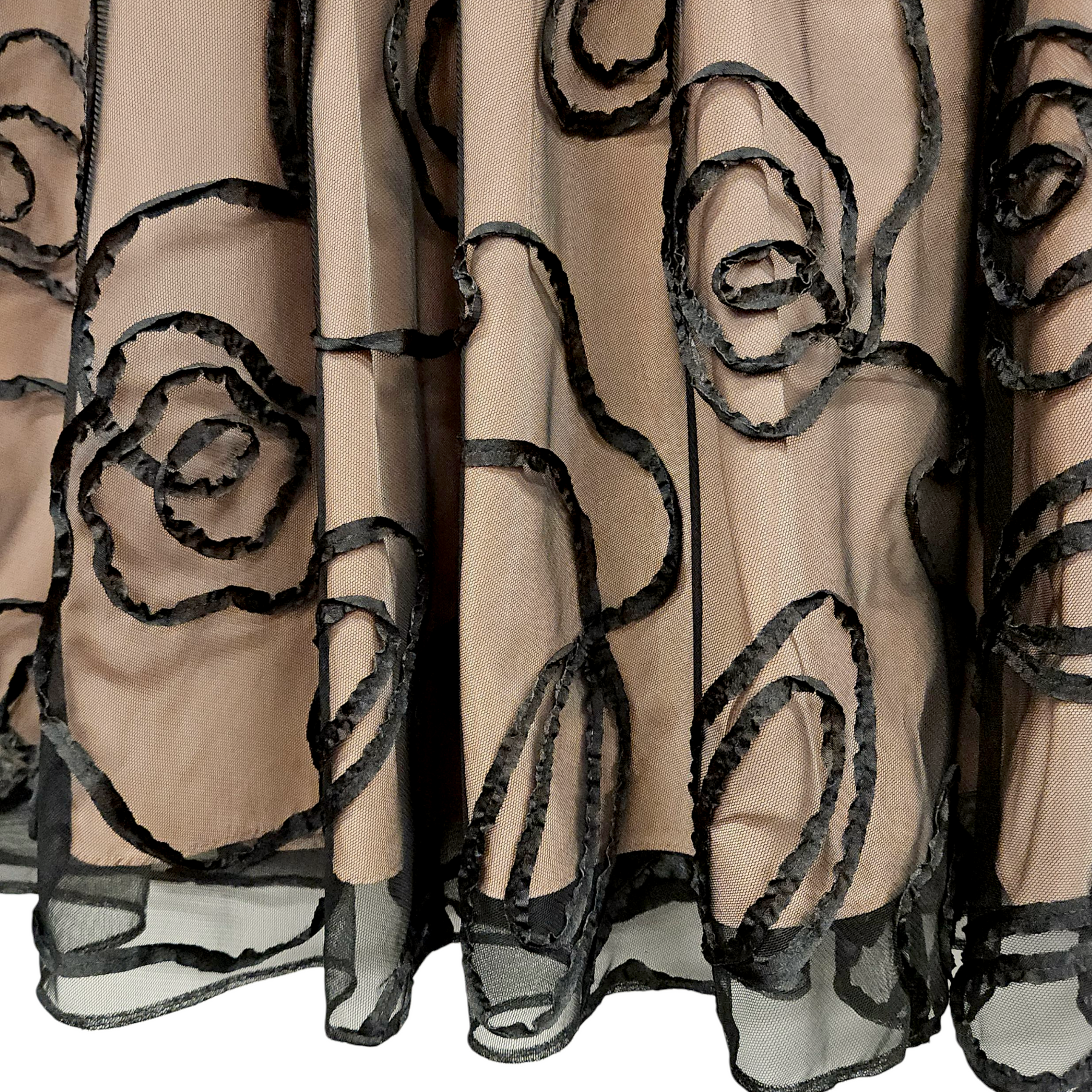 - Mesh top layer with appliqué detail.