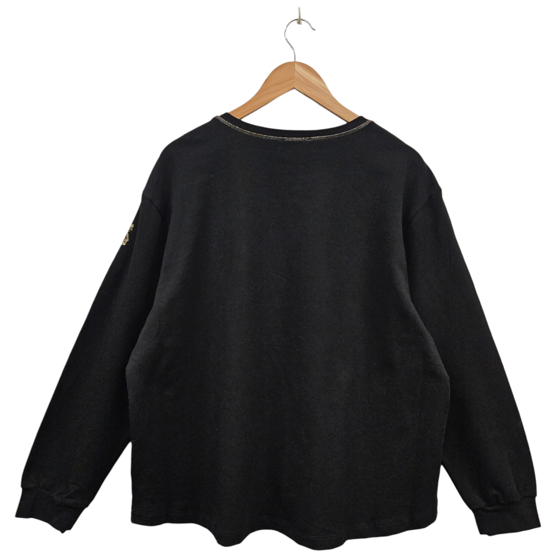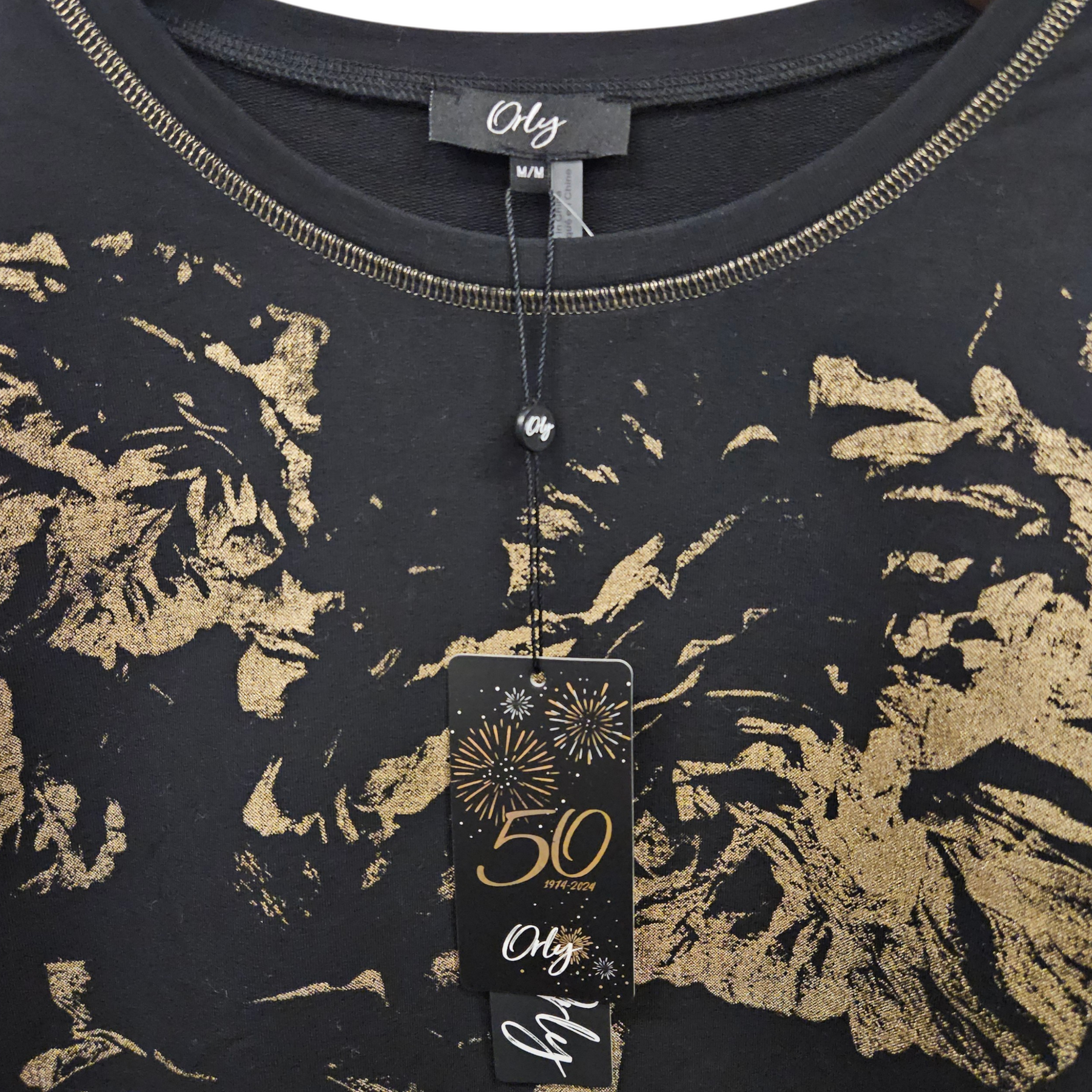 - Round neckline with gold stitching detail.