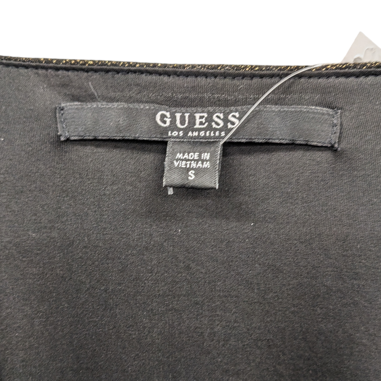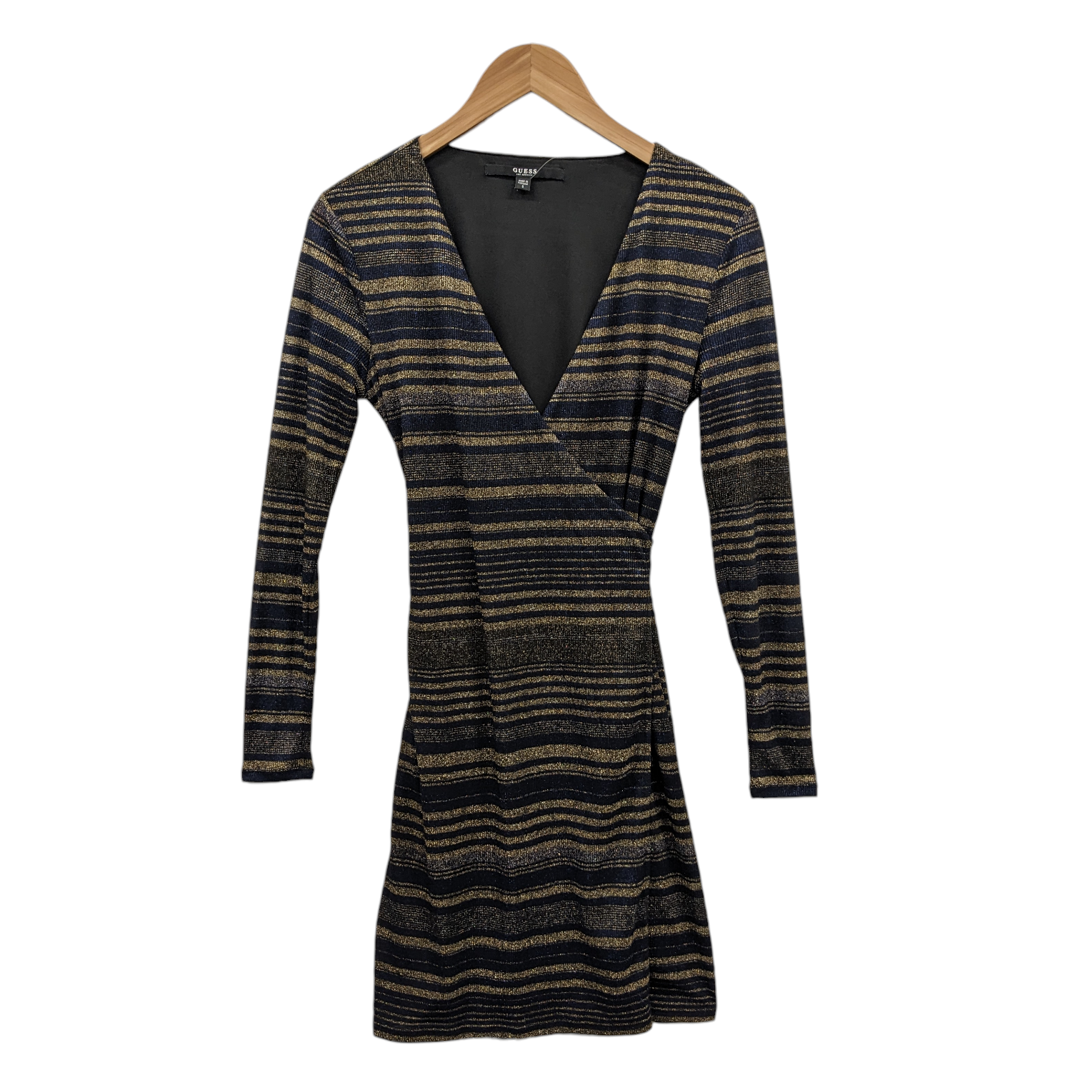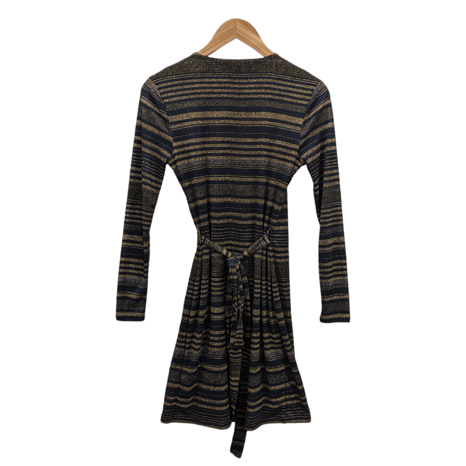 Materials: Black with blue and gold shimmer stripes 85% polyester, 18% metallic, 17% rayon, lining 92% polyester and 8% spandex.