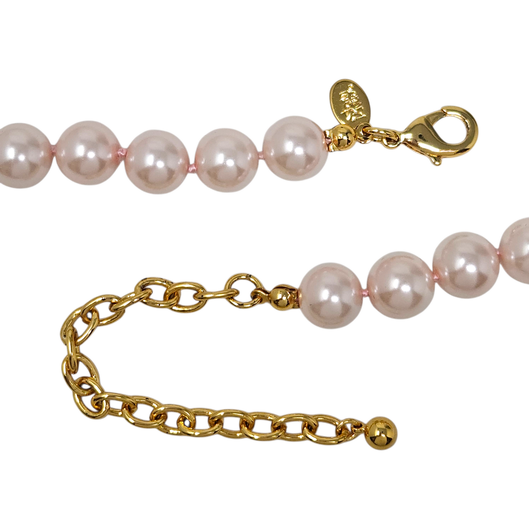 Materials: Light-pink glass-based faux pearls with gold-tone hardware.