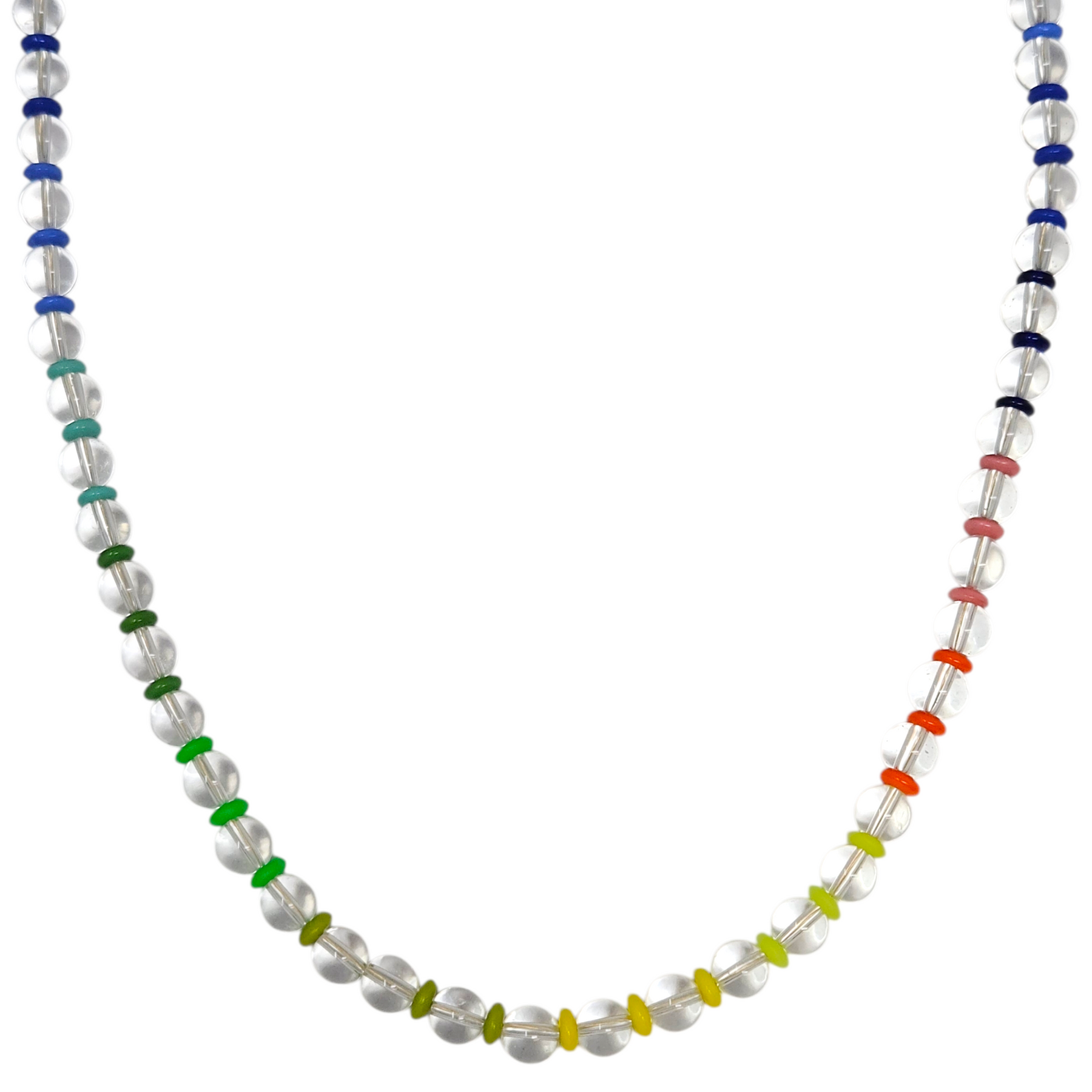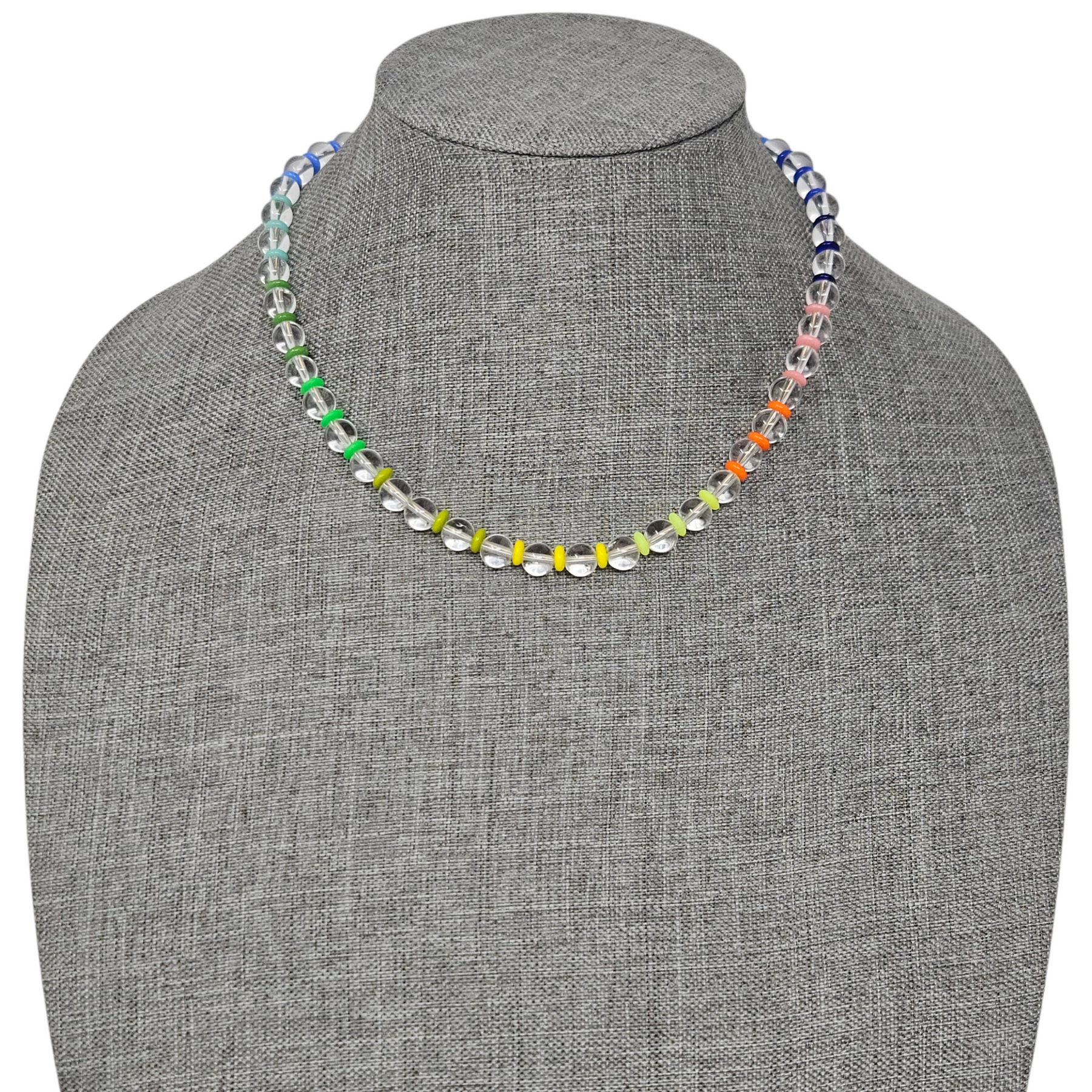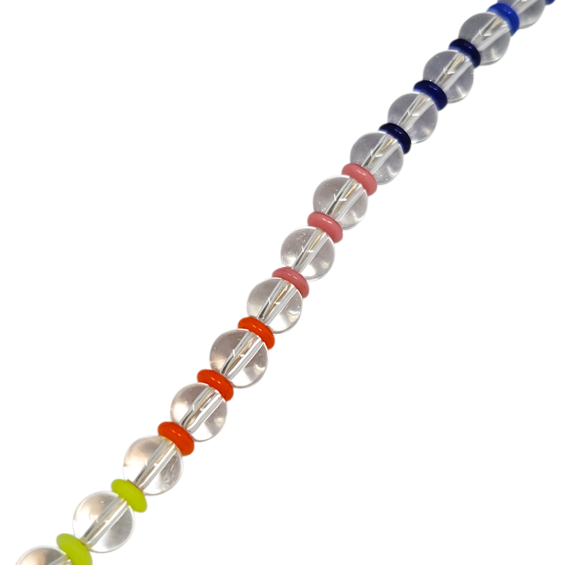 Materials: Round clear glass beads with multicolour bead details, & gold-tone hardware.