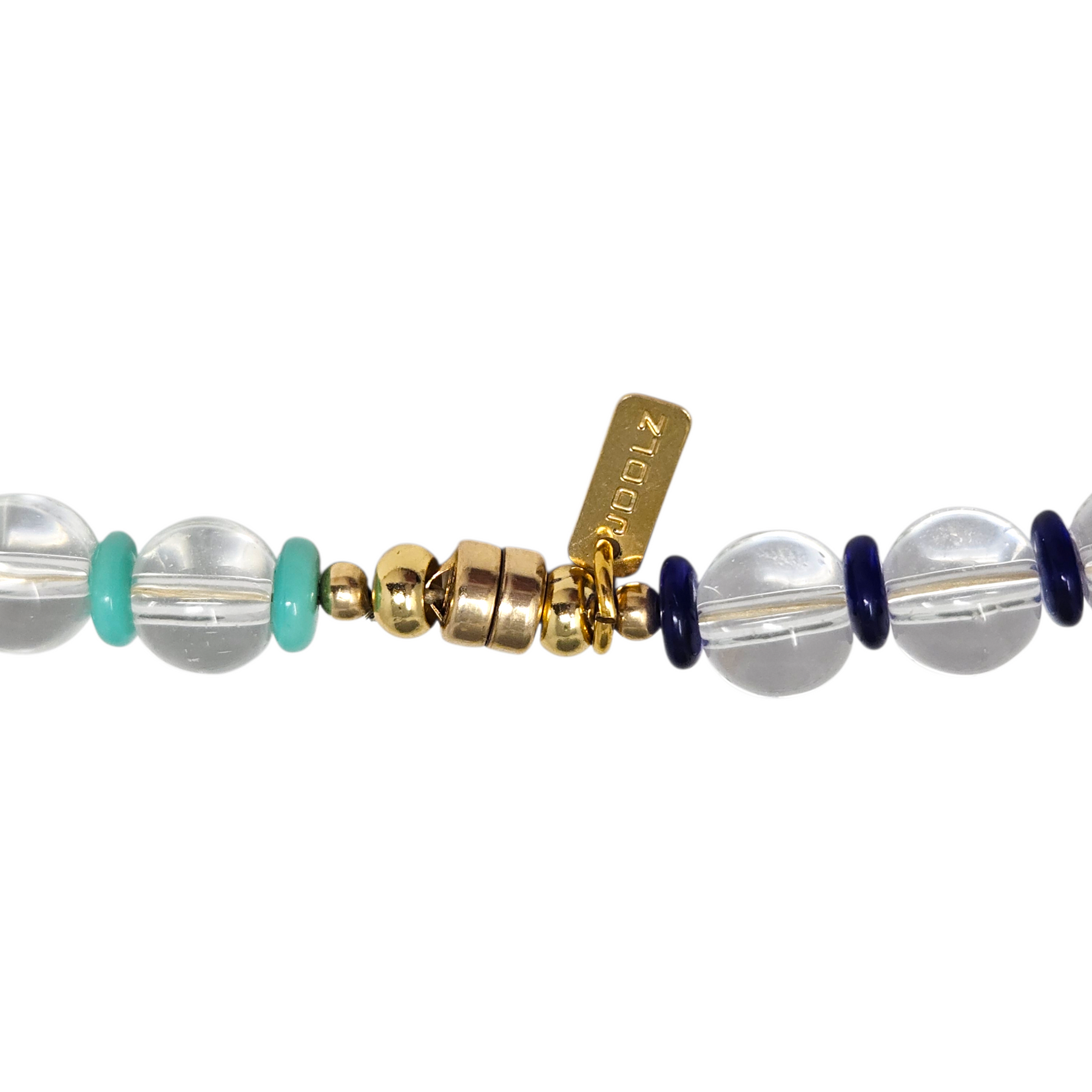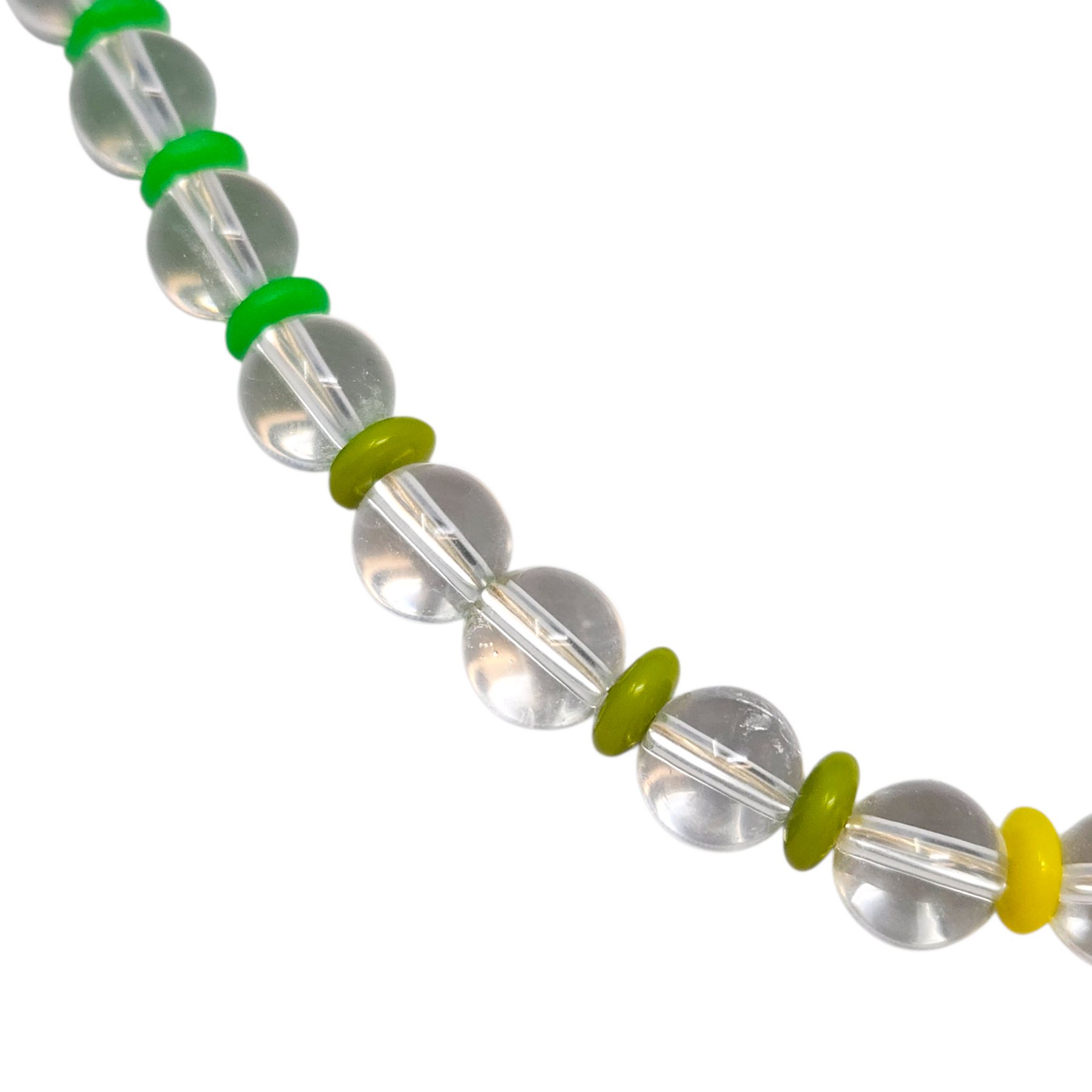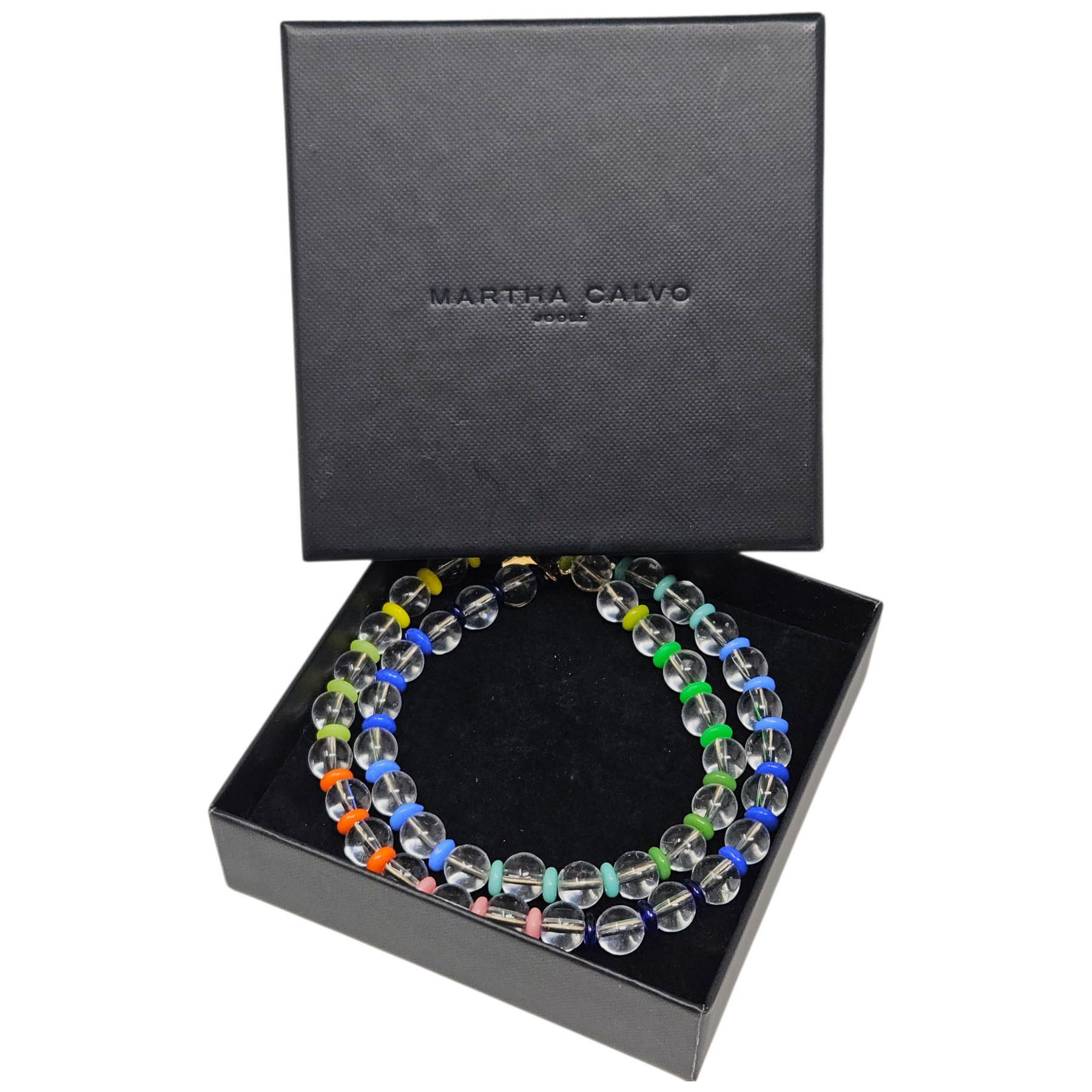 Materials: Round clear glass beads with multicolour bead details, & gold-tone hardware.