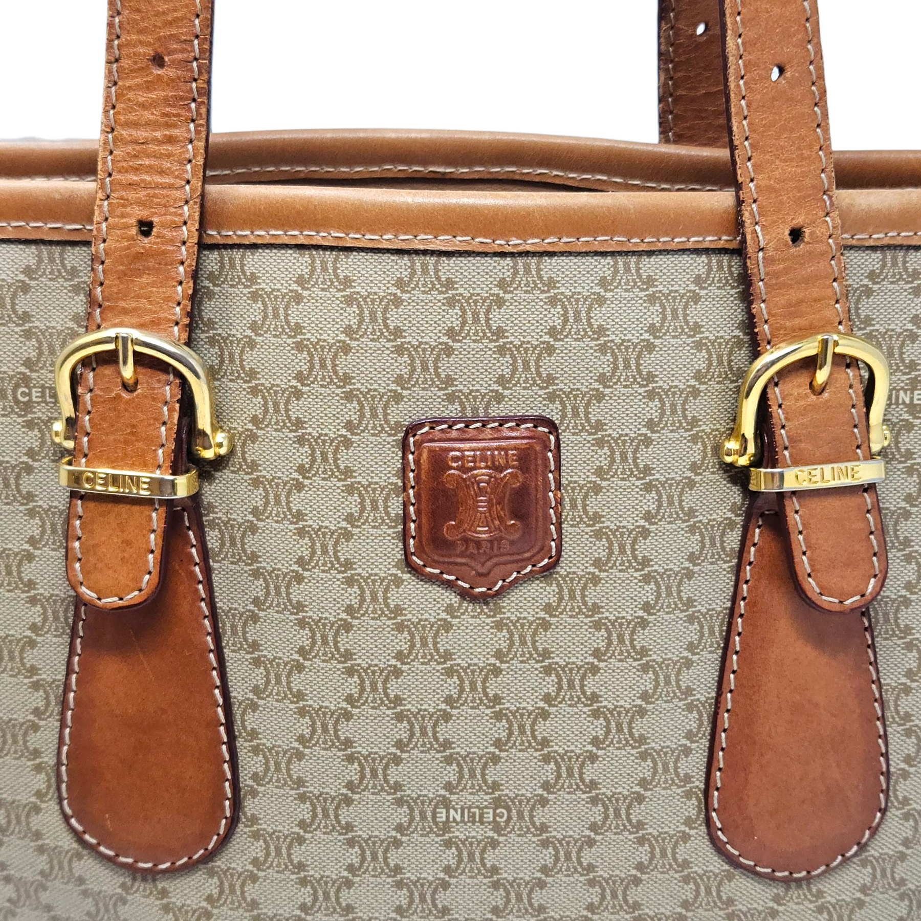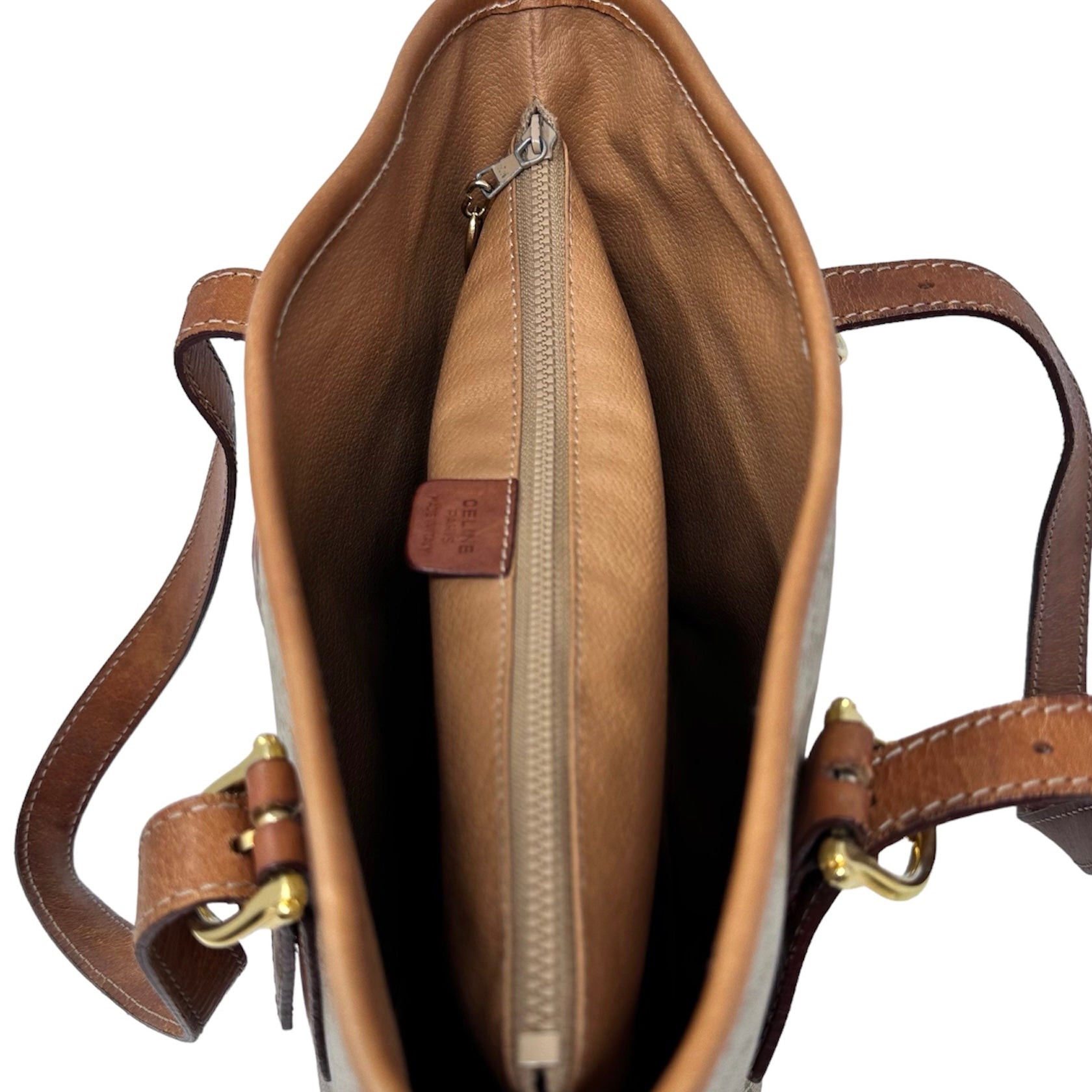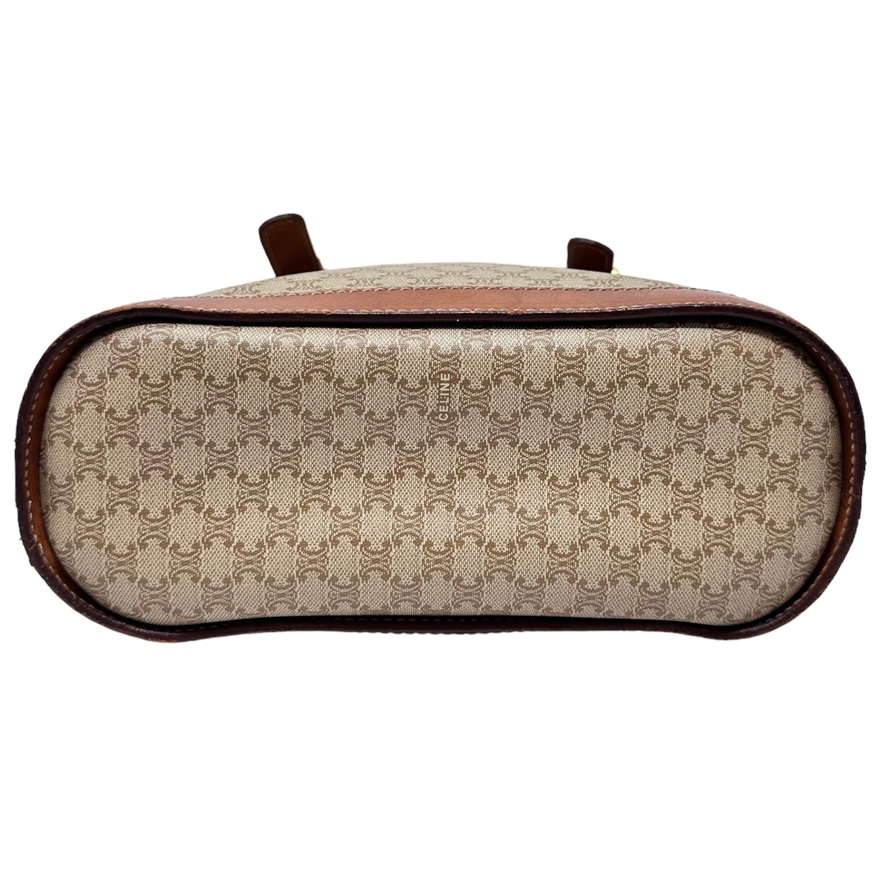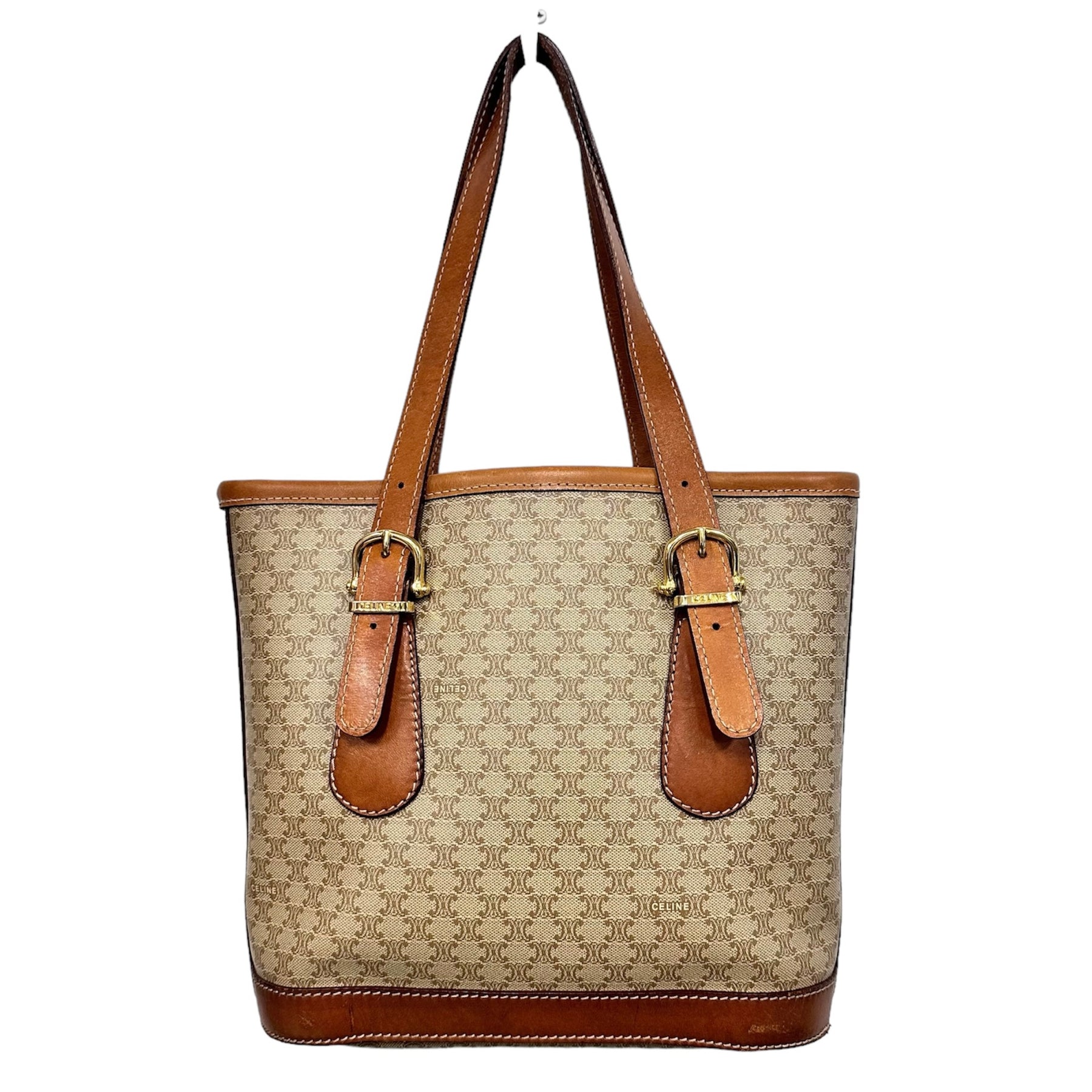 Materials: Beige & tan coated canvas and leather trim with gold-toned hardware.