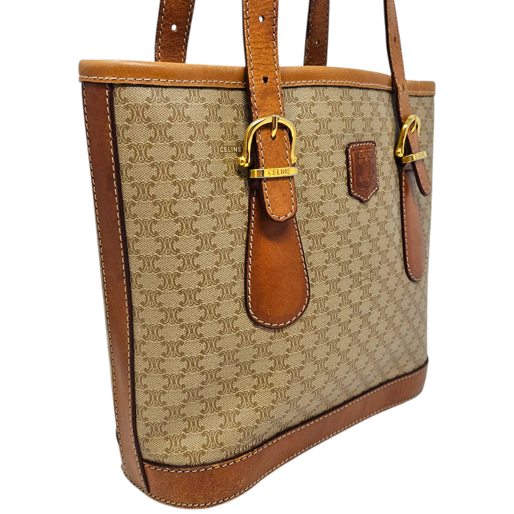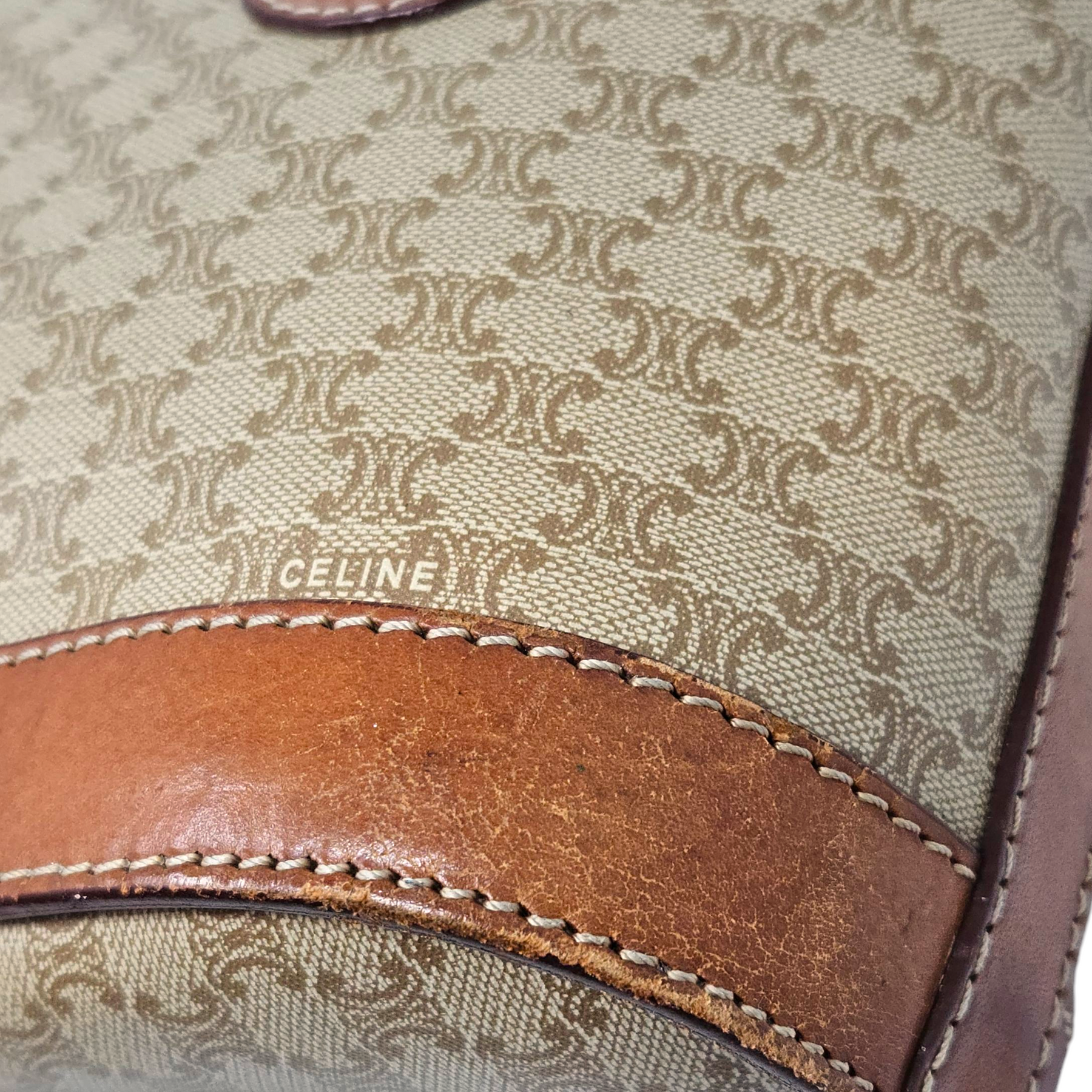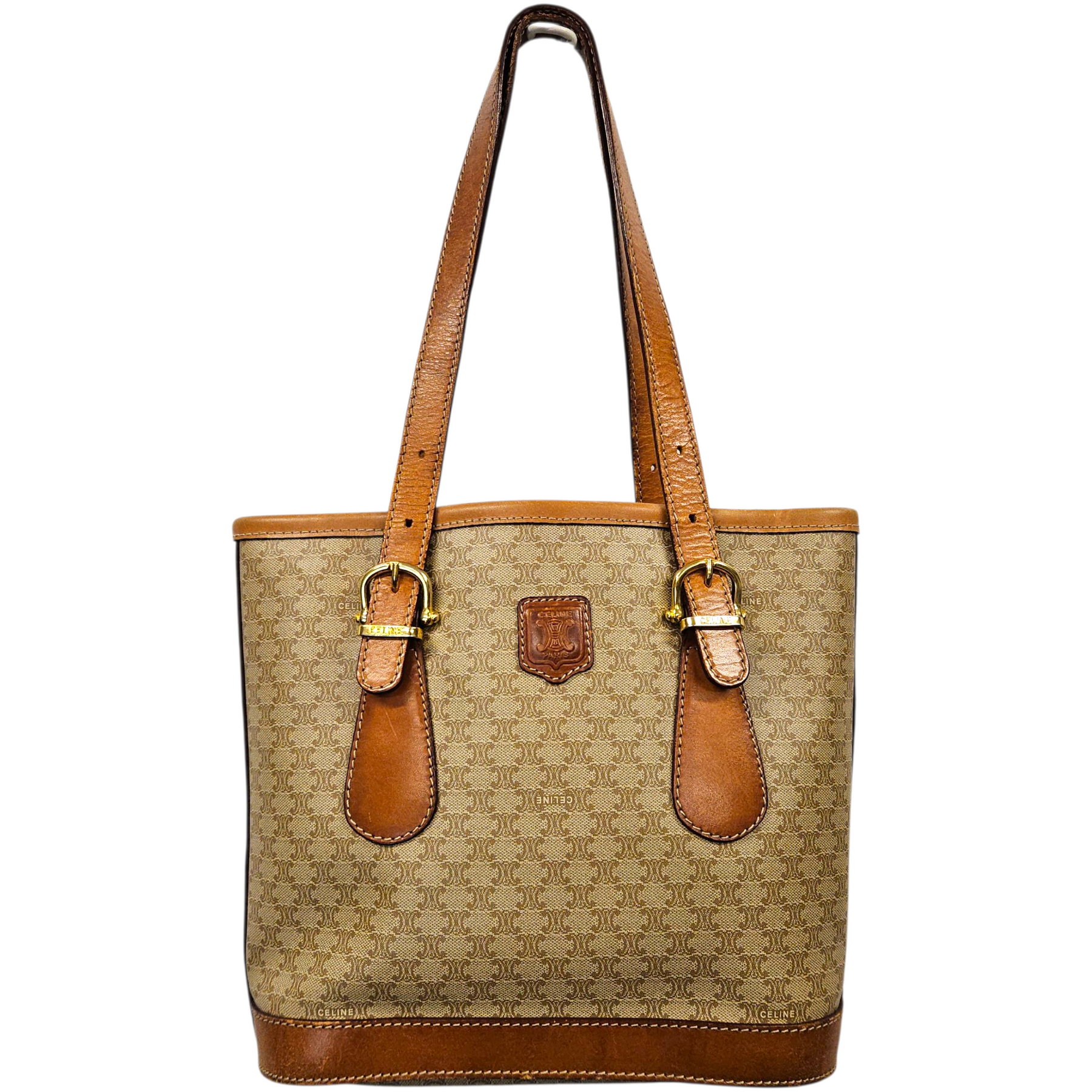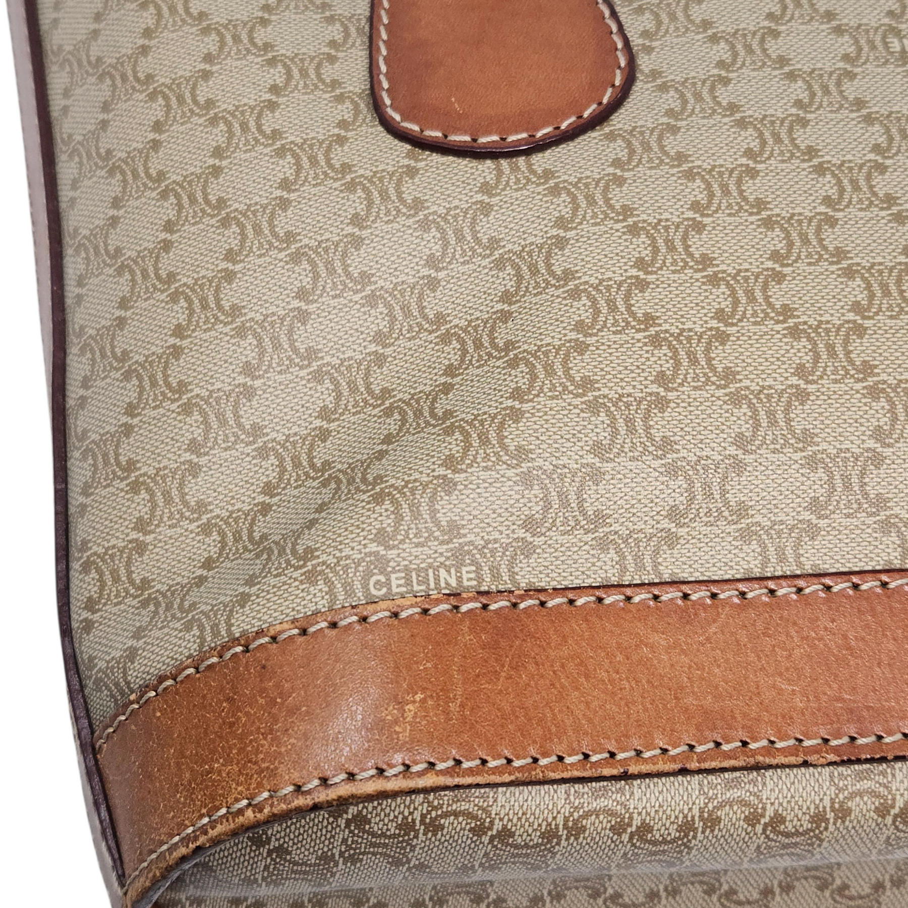 Materials: Beige & tan coated canvas and leather trim with gold-toned hardware.