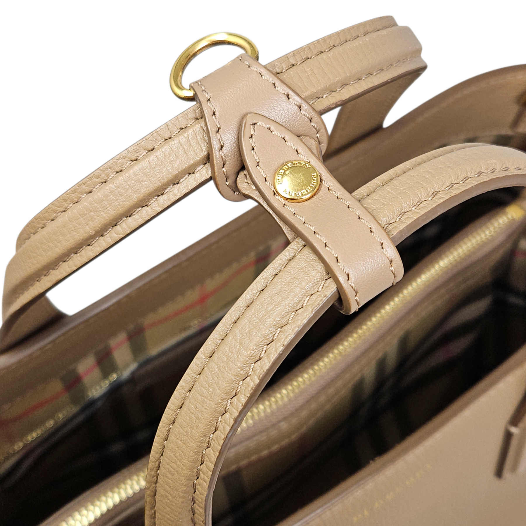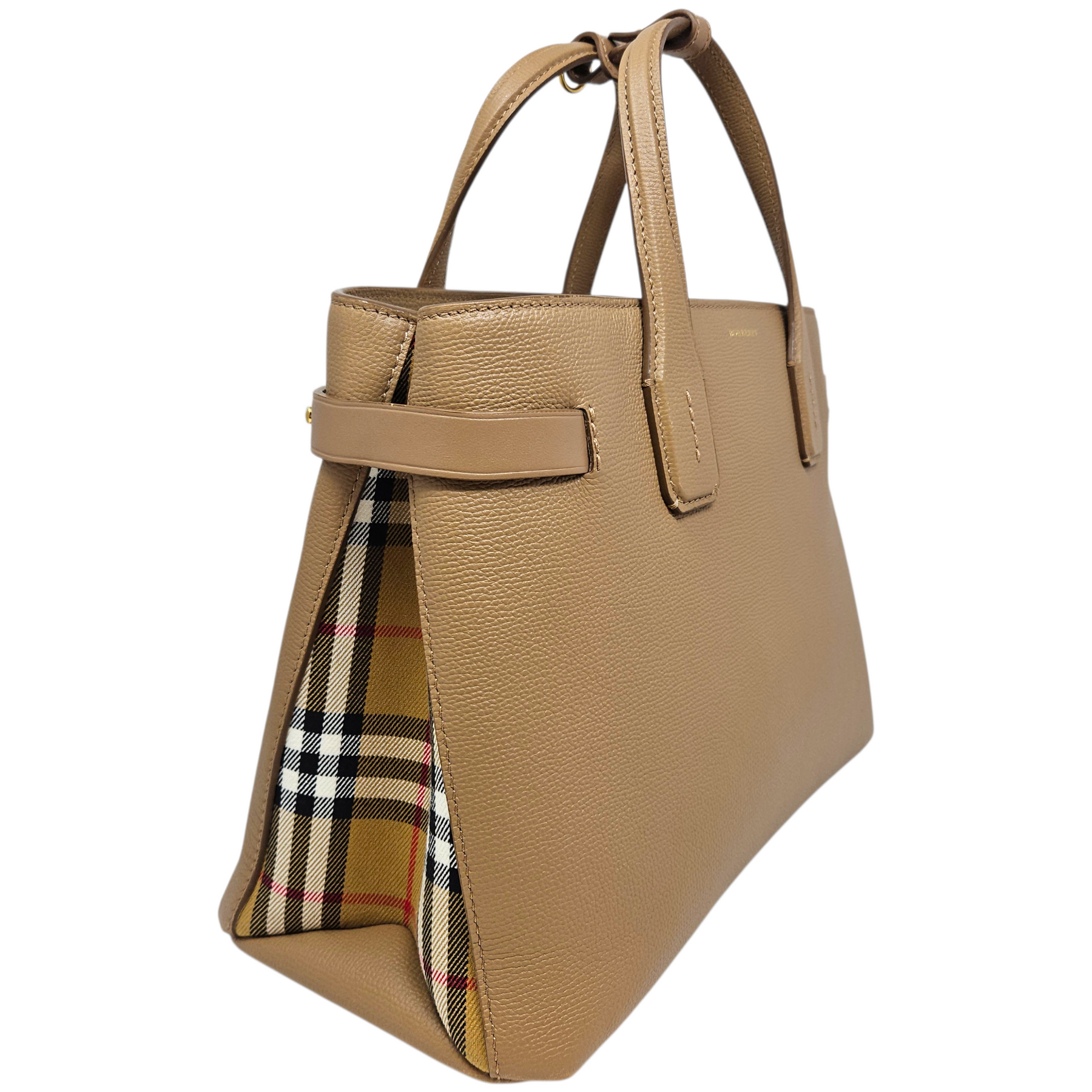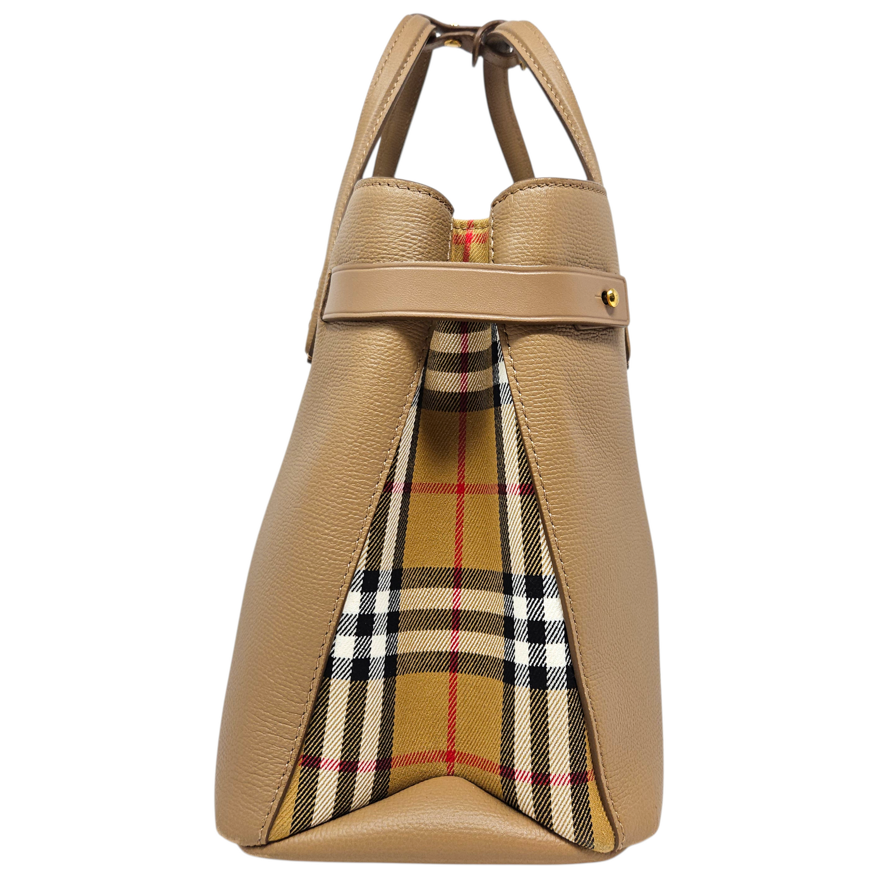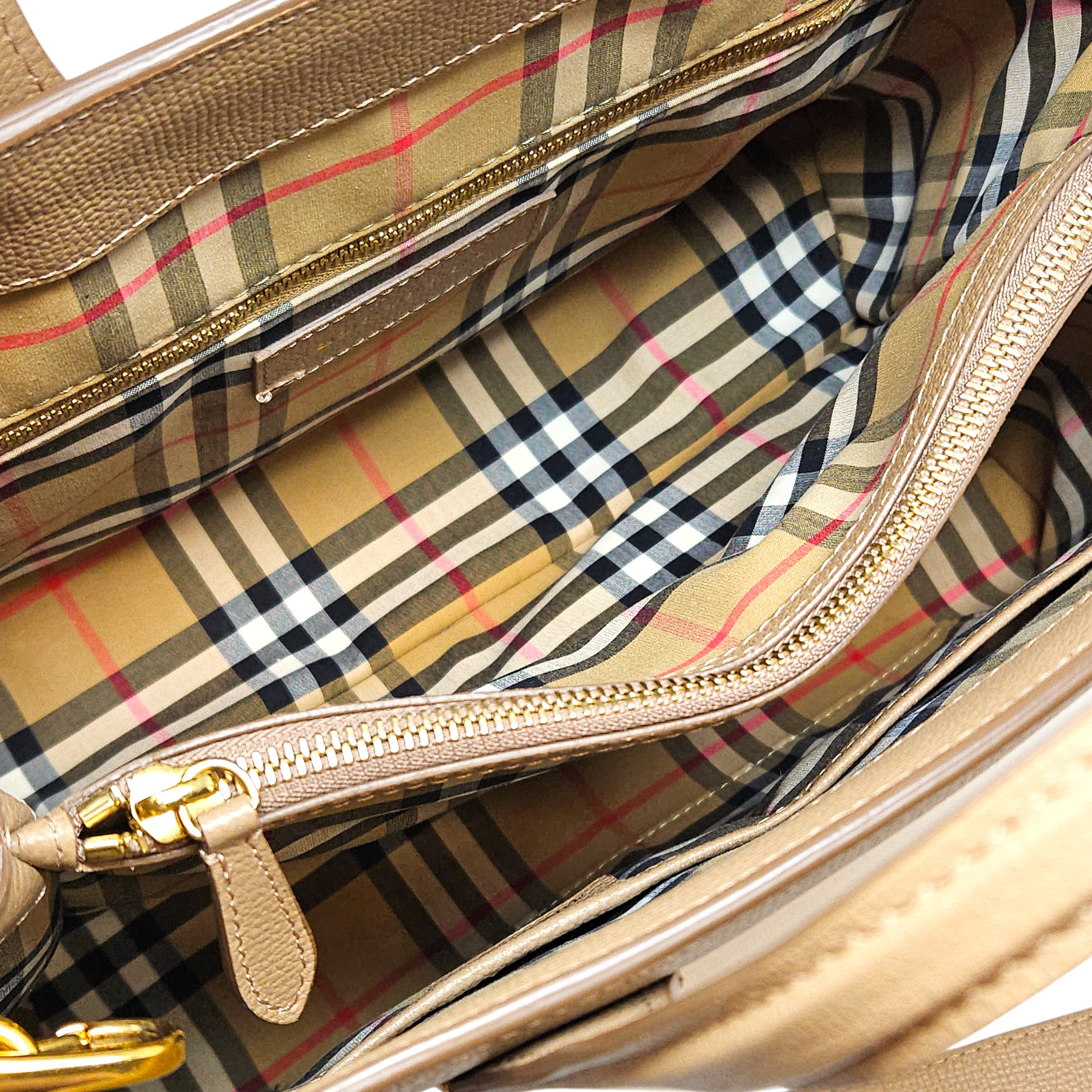 Materials: Brown pebbled leather with house-check canvas side panels, & gold-tone hardware.