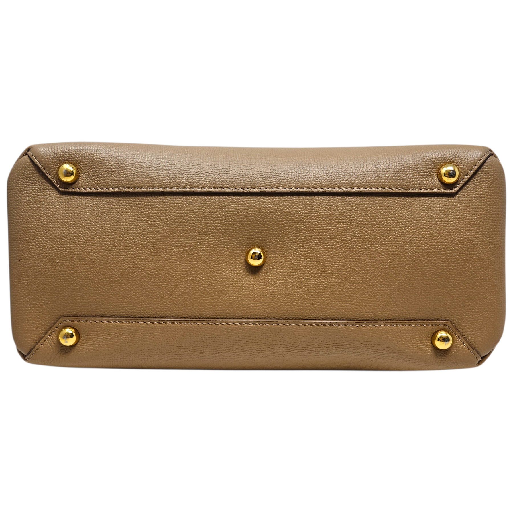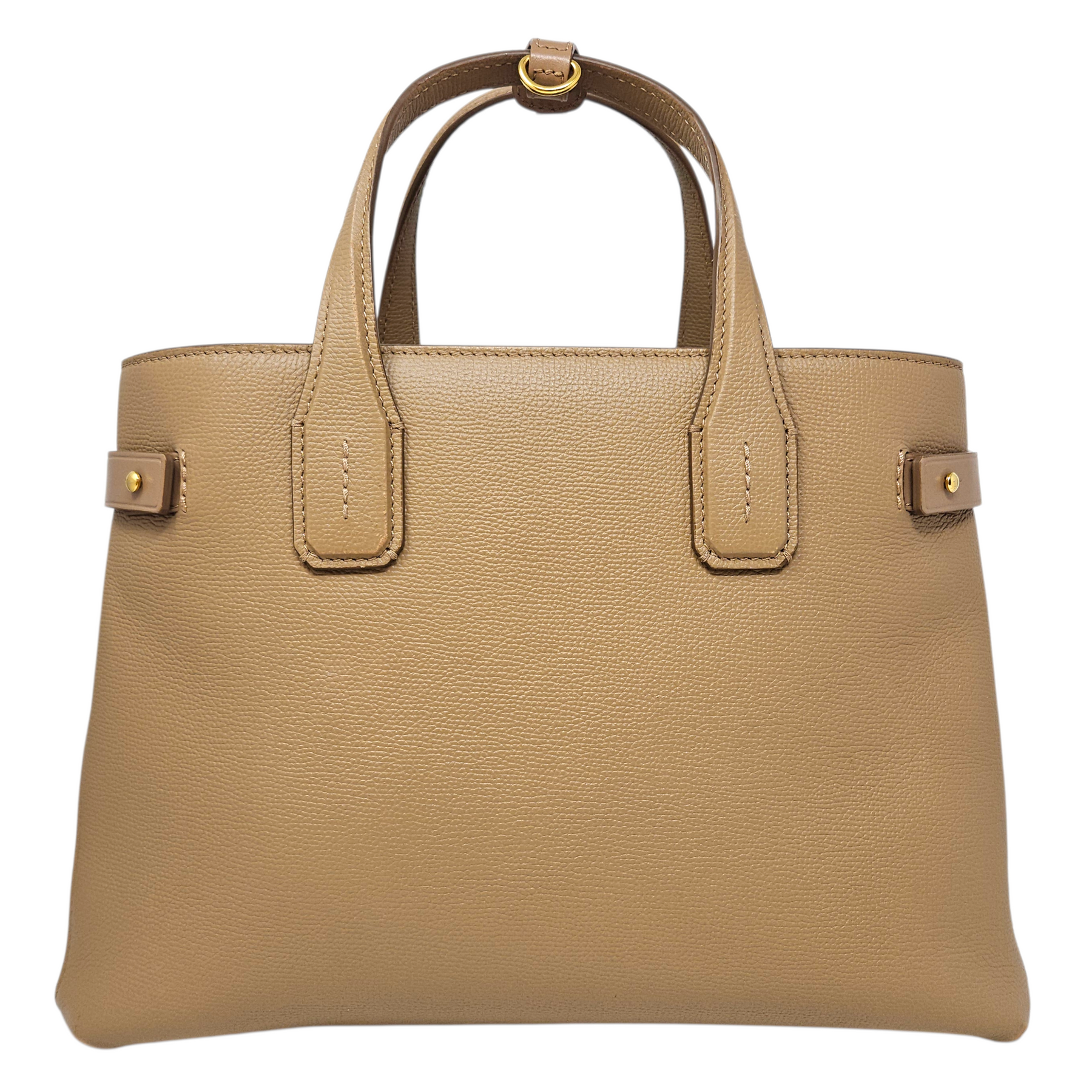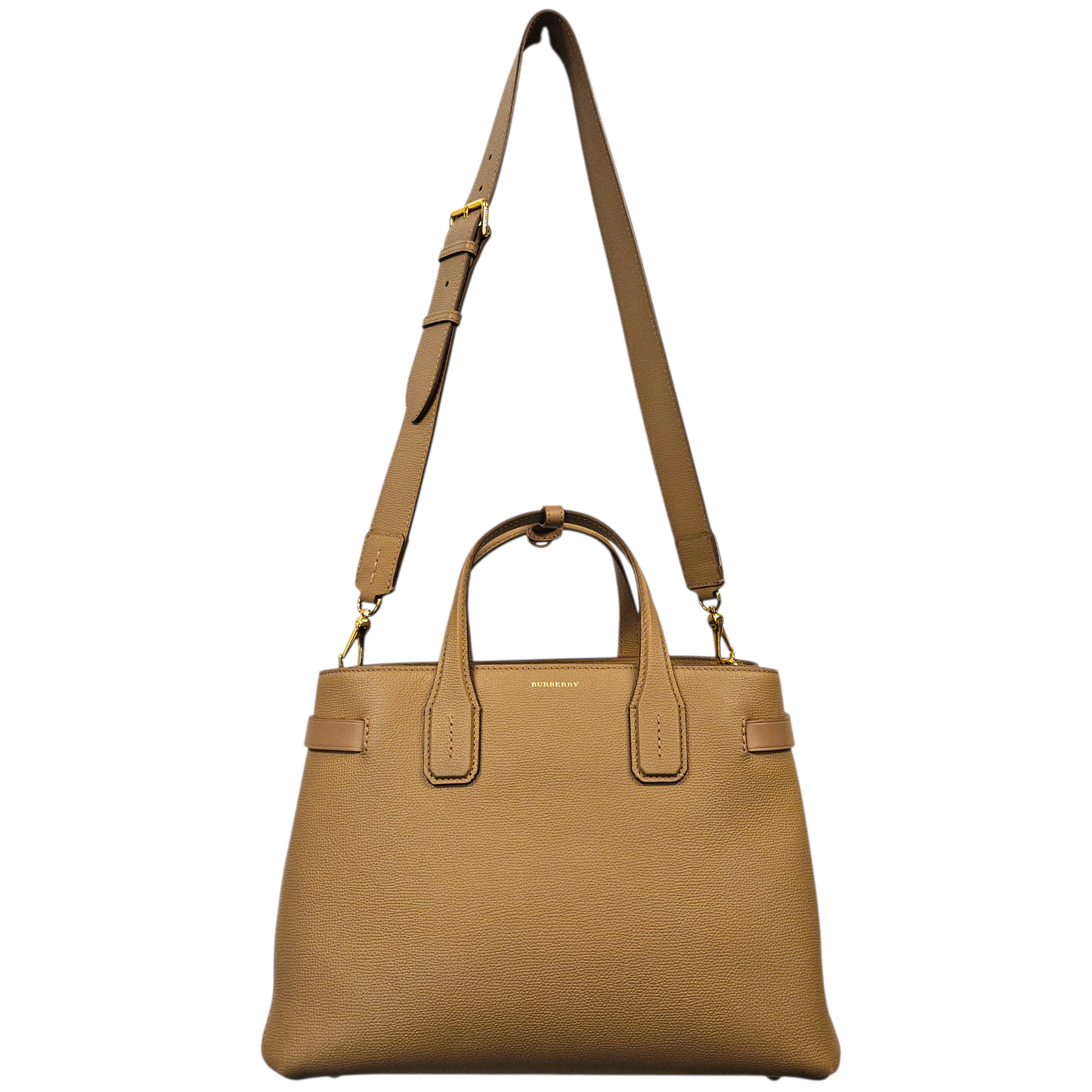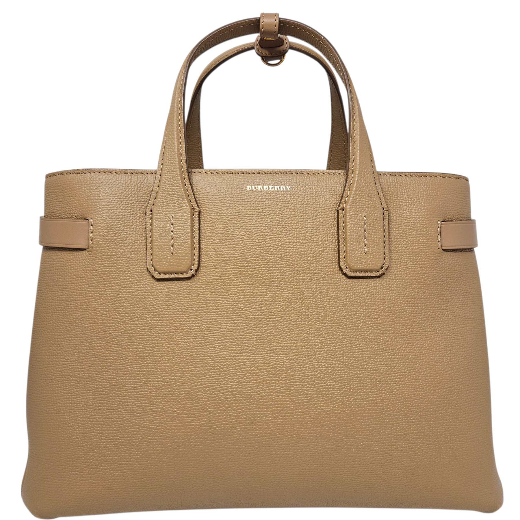 Materials: Brown pebbled leather with house-check canvas side panels, & gold-tone hardware.