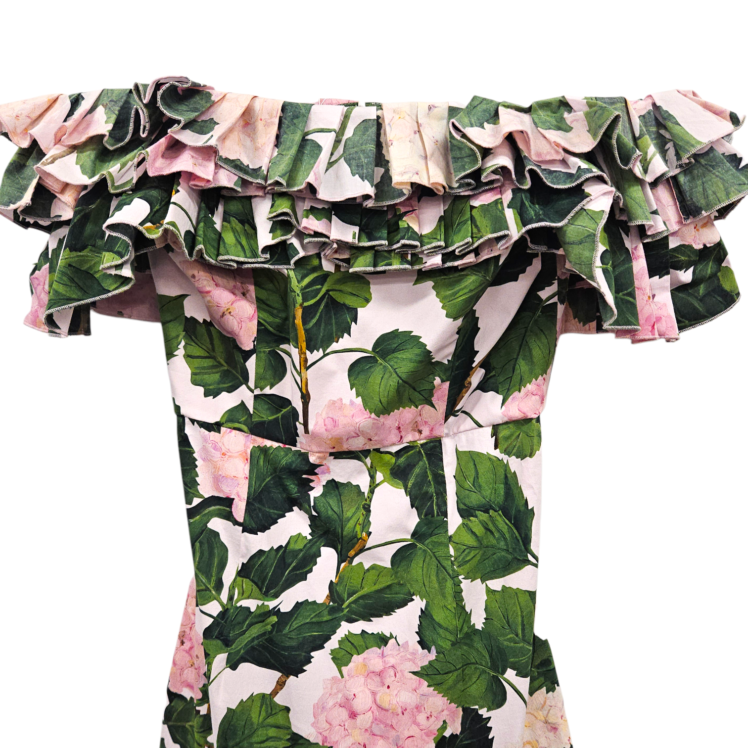 - Off-the-shoulder style with ruffled layers.