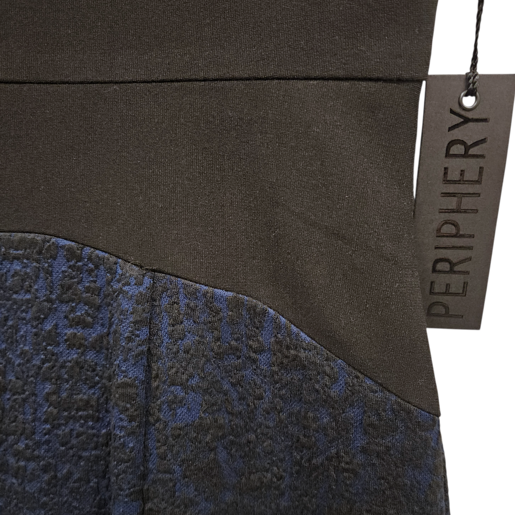 - Curved black waistband.