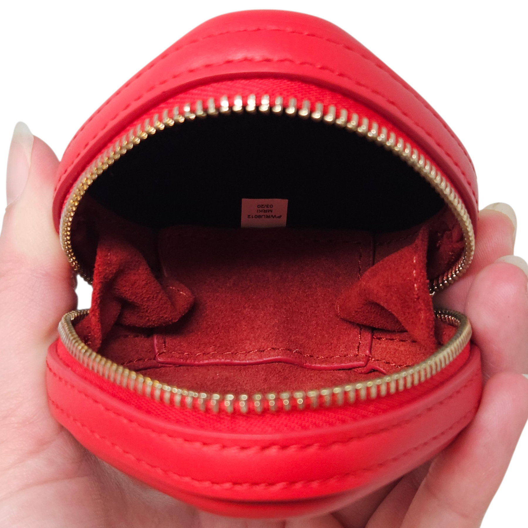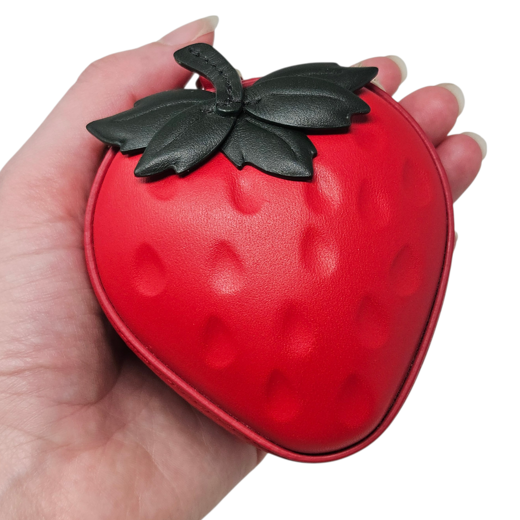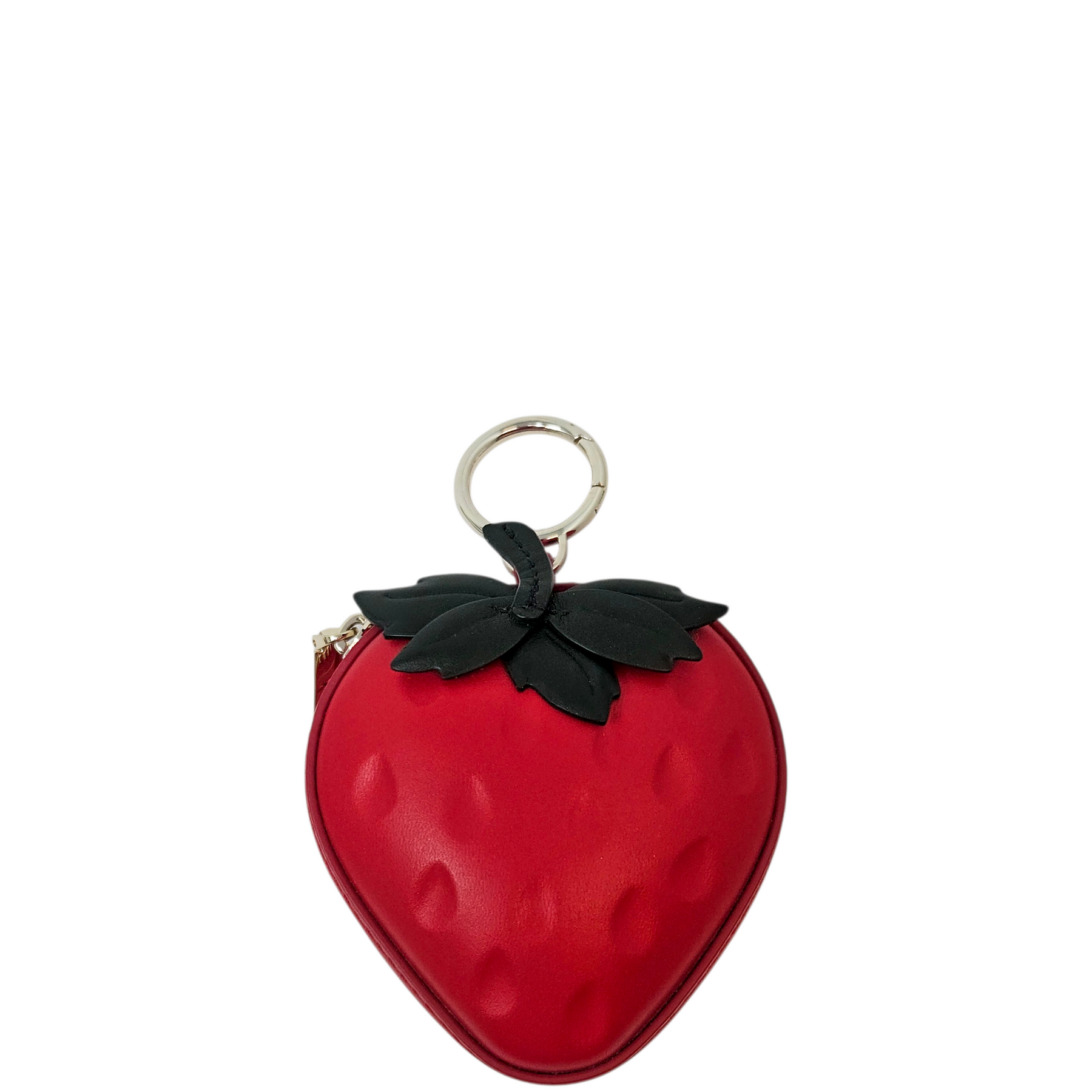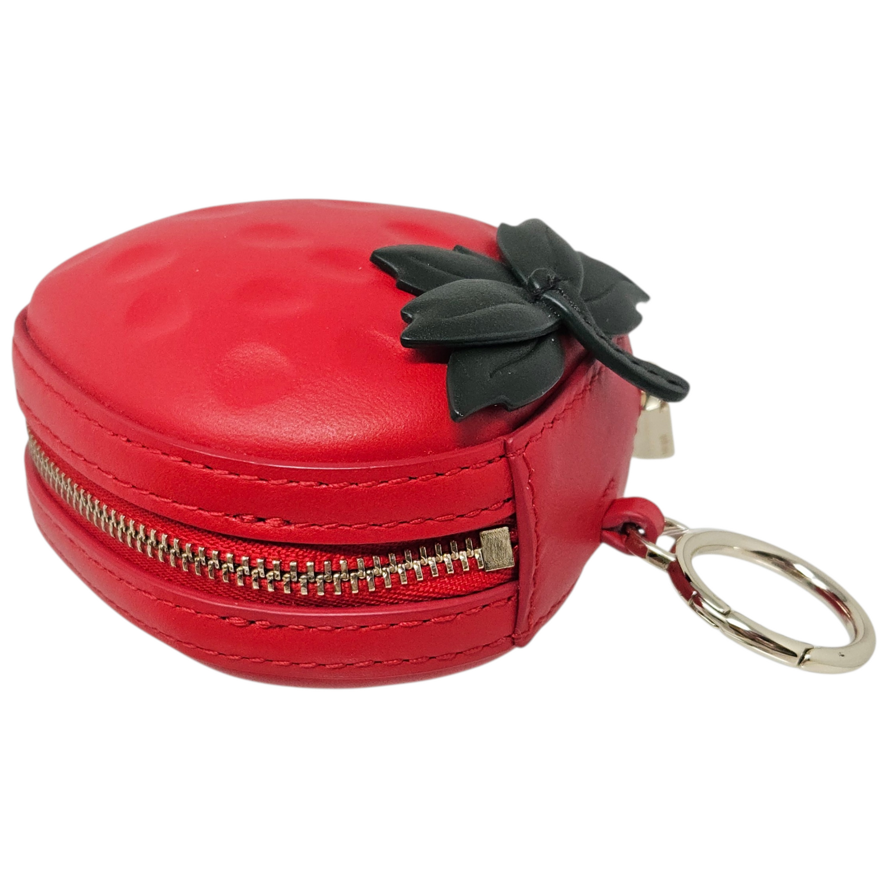 Materials: Red leather in a playful strawberry design, green leather leaves, and gold-tone hardware.