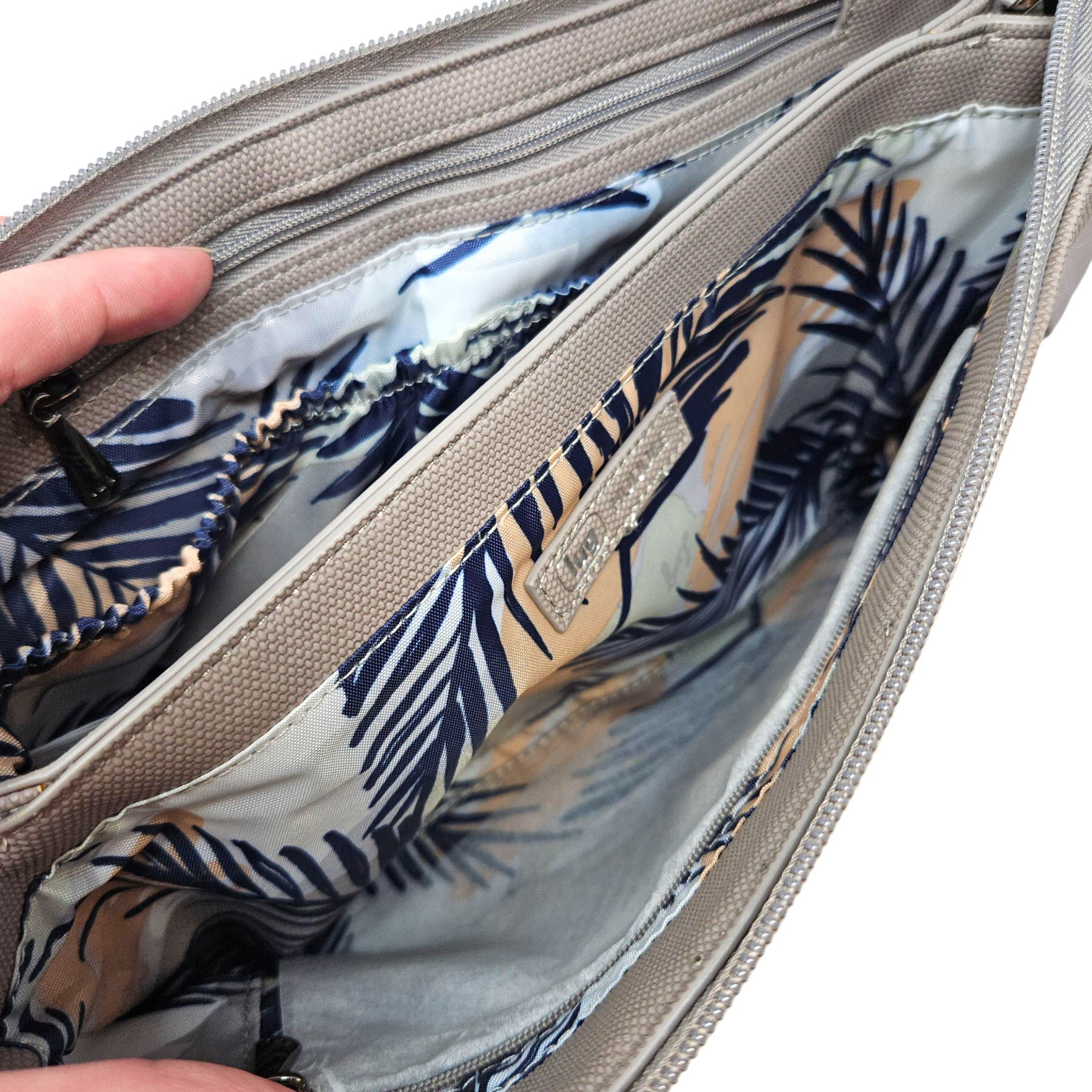 - Two interior compartments with interior zip & slip pockets.