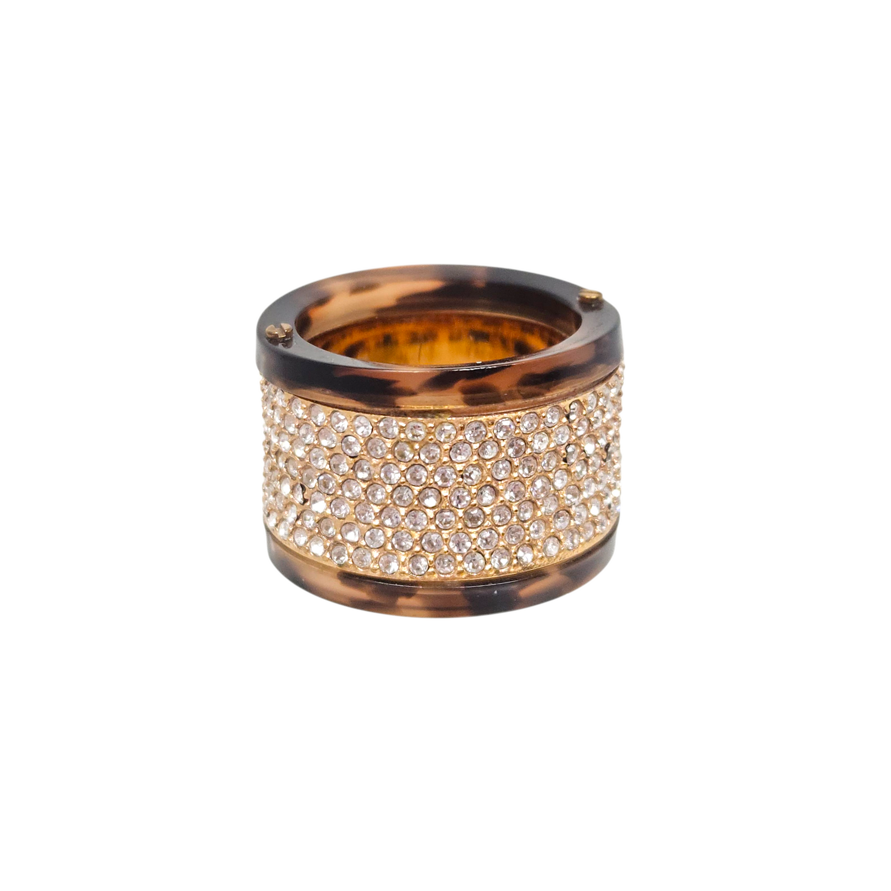 Materials: Tortoise-shell resin with clear crystal pavé & gold-tone hardware.