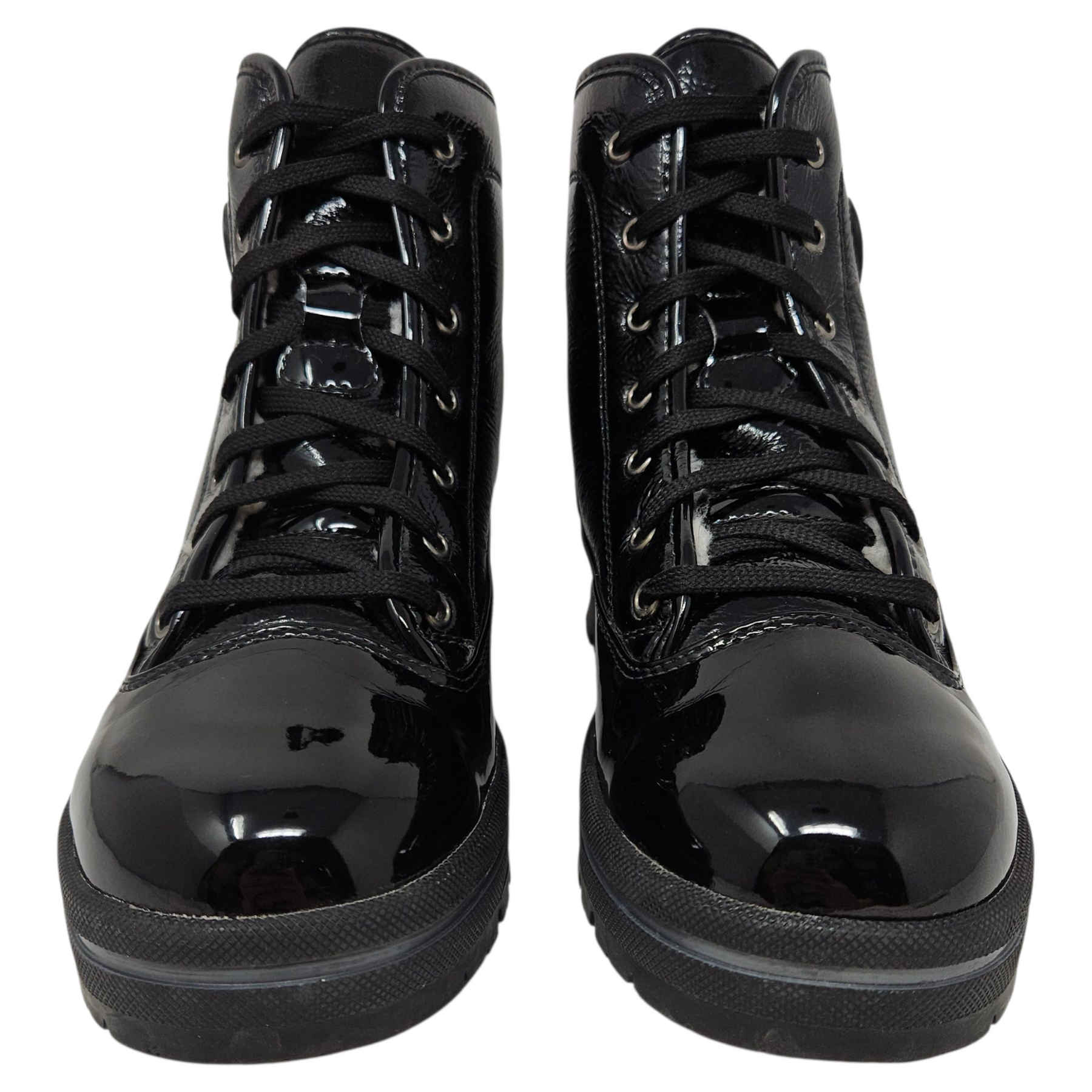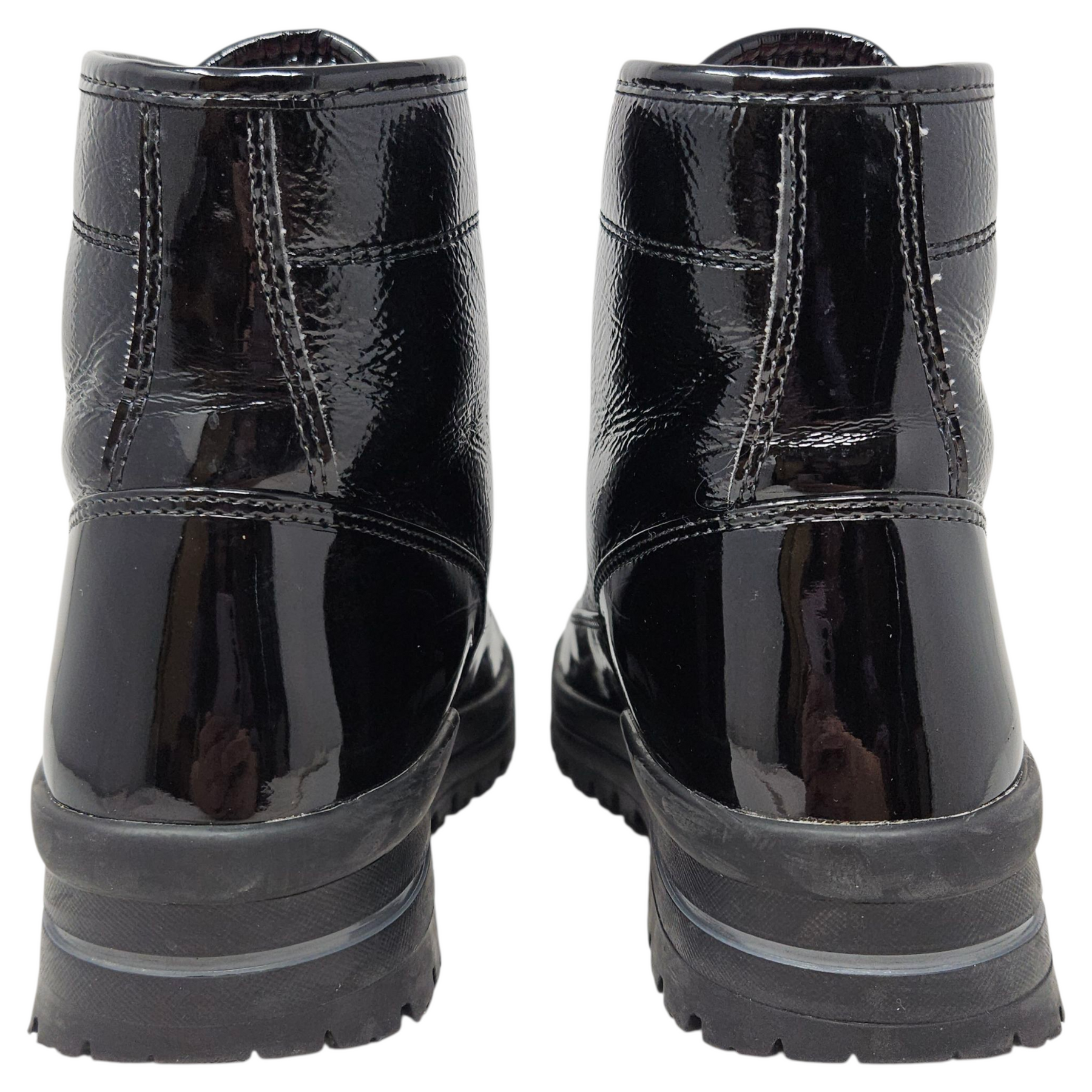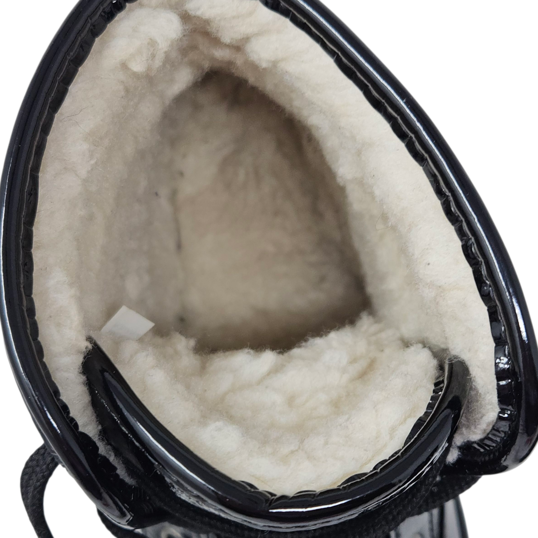 Materials: Black patent vegan-leather with gunmetal-tone hardware.