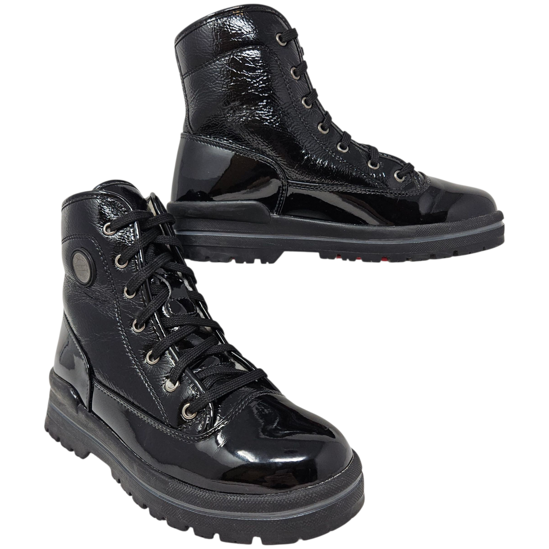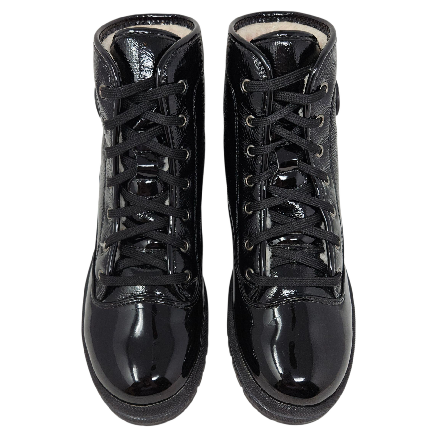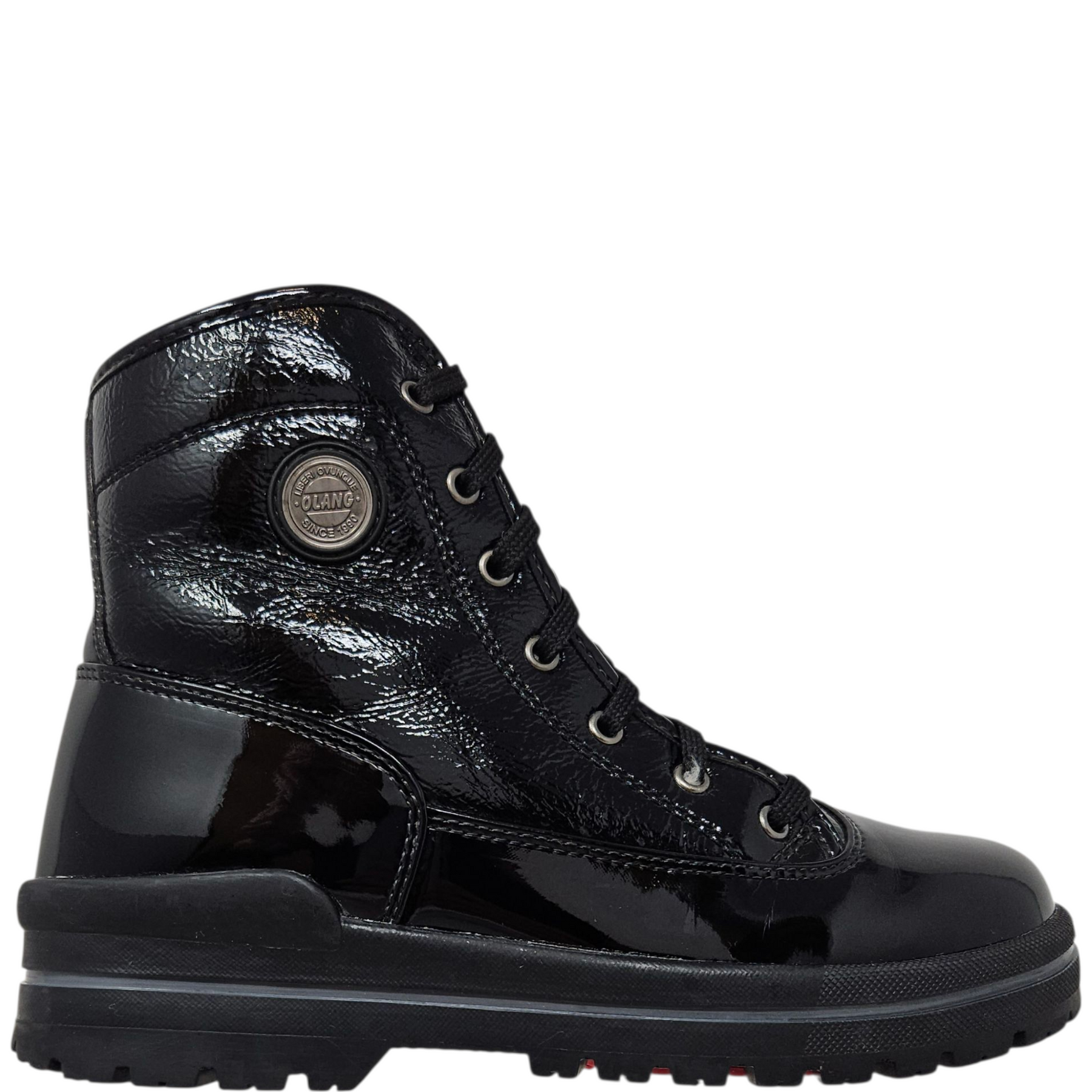 Materials: Black patent vegan-leather with gunmetal-tone hardware.