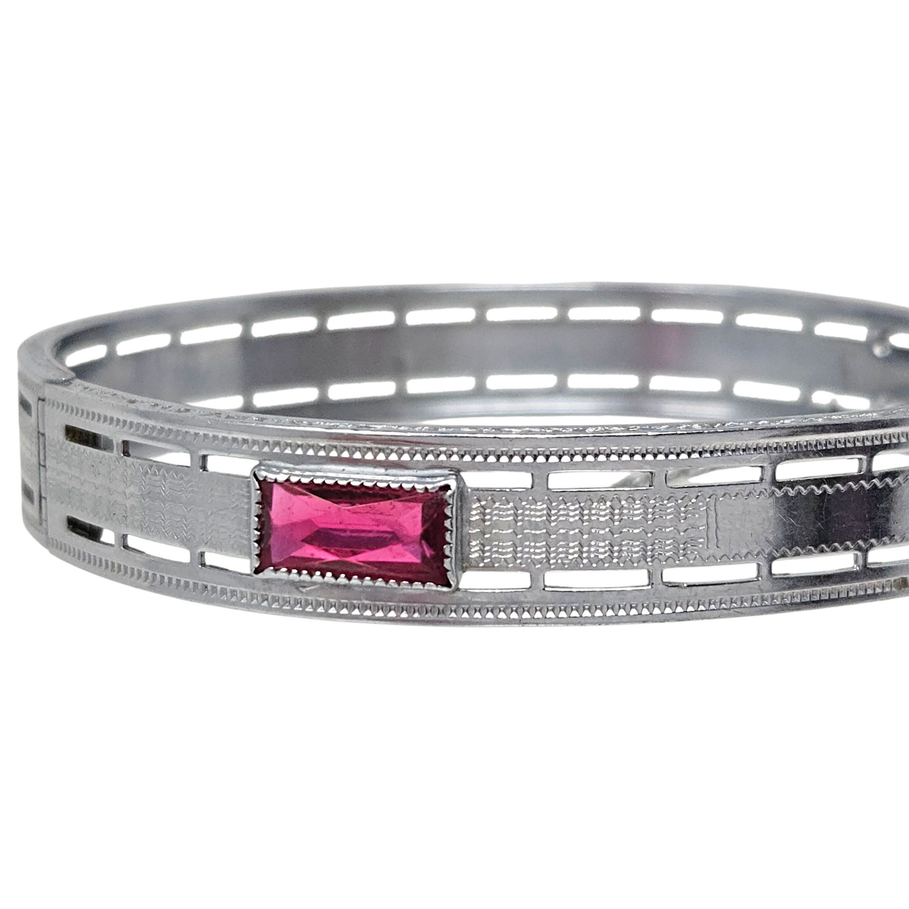 Materials: Rhodium-plated metal with etched details & two pinky-red gems.