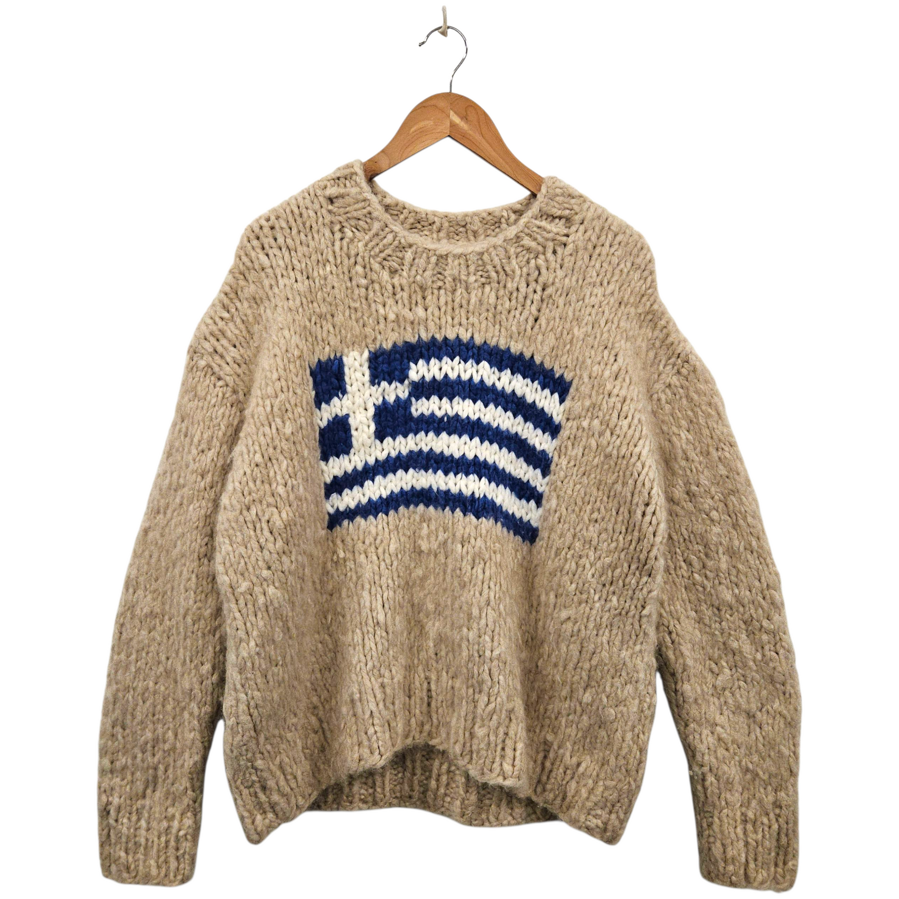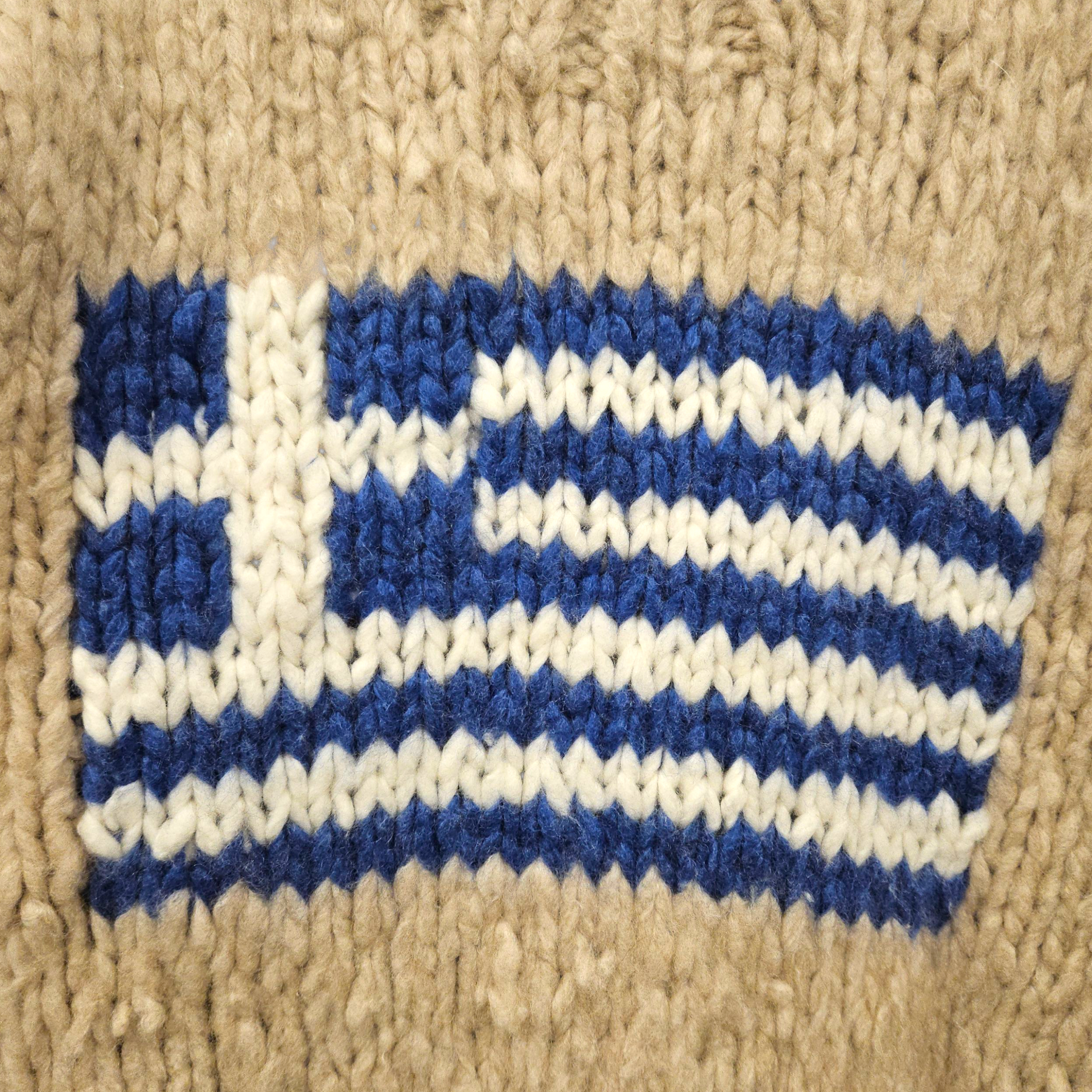 - Greek flag knit on front.
